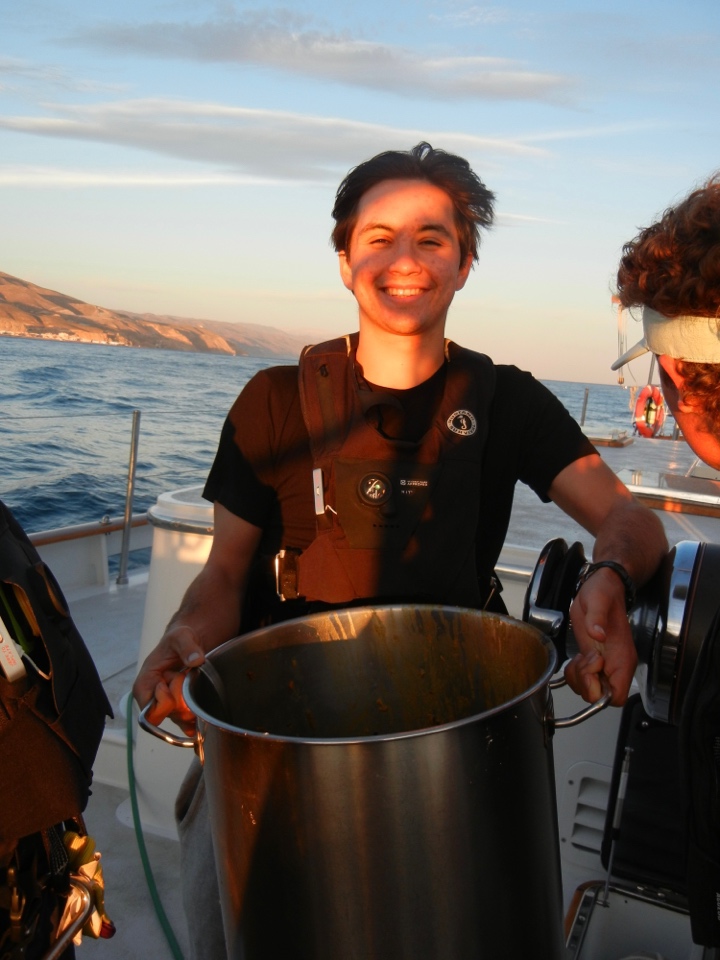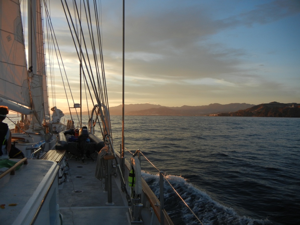 We then enjoyed the surroundings as we cruised the coast along the jagged mountains of Spain. We began our watch team shifts, and the shipmates gathered in the salon for the Navigation class taught by Mac L. and Claire. Watch Team 3 (Smash, Grace N., Max, Amy, Elis, Jesse, Lukas, Brendan, Eduardo, and I) had dog watch from 6 to 8 pm, with some good chats and laughs, as always.