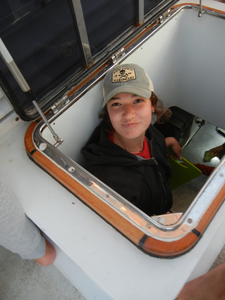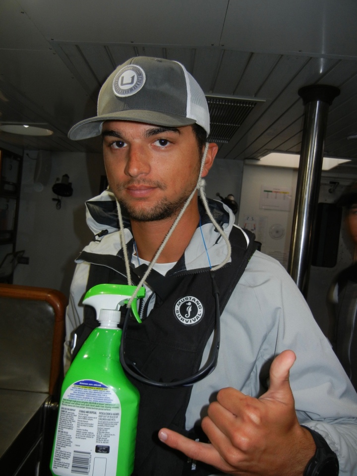 Like passage prep, leaving the dock was smooth and swift. Mac L. was at the helm, and Chloe, Grace C., and Mac R. handled the dock lines perfectly! Theo and Grace N. handled the roving fenders, which is important for protecting Vela from damage as she turns away from the dock. Everyone helped with taking in the other fenders, deflating them, and bringing them to the anchor locker. Boston, Cat, and Grace C. braved the tasks in the anchor locker, a water-tight storage compartment at the bow of the boat. This consists of tying knots onto storage rods of heavy dock lines and fenders in a tight, uncomfortable, tiny space, and today, there was a big swell. it is naturally a seasickness-breeding space. I am always impressed by the shipmates who volunteer to do this job because all of us know it is one of the most uncomfortable tasks onboard! They did very well!