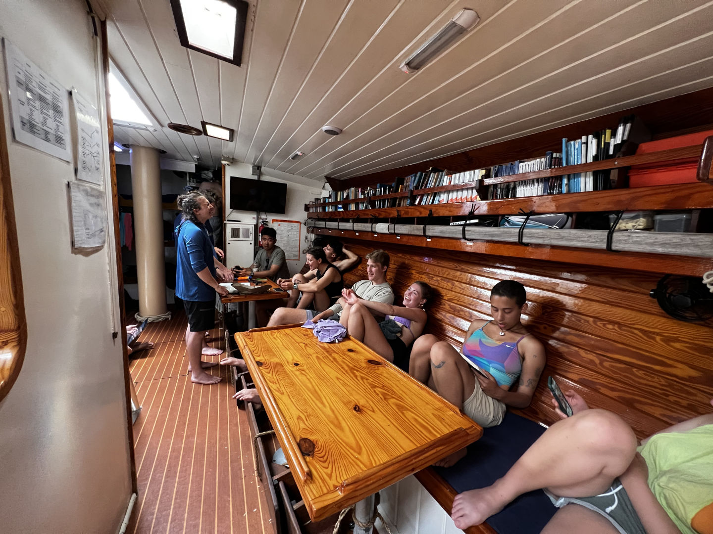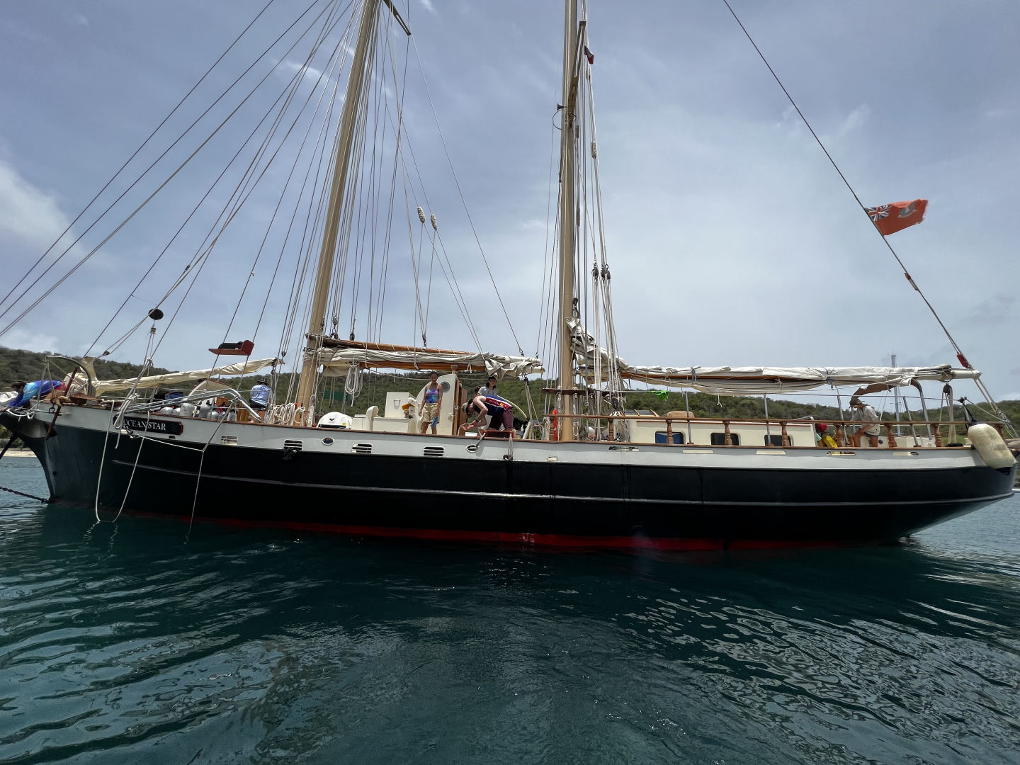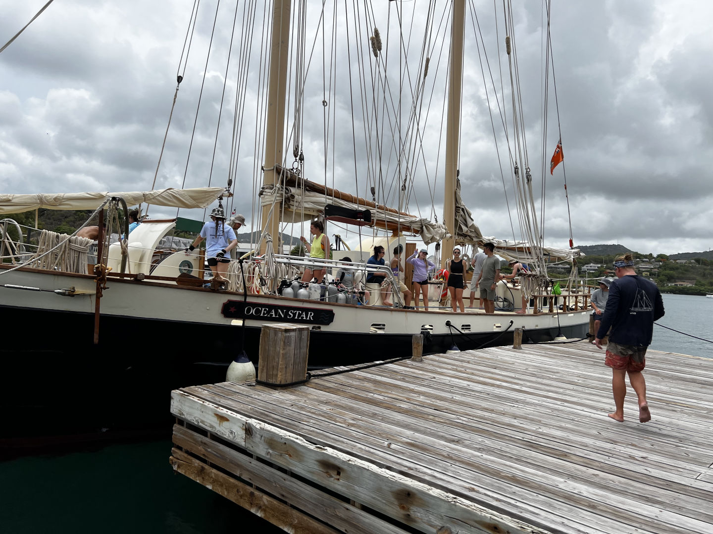 Today was an eventful day preparing for our first passage to Nevis. Today I was the skipper and started the morning by waking up my fellow crew-mates and getting them up for the busy day we had ahead of us. We sat down for a bagel breakfast after Amanda and Joey went to go do Joey’s 1 and 2 dives for his open water certification. After that, we cleaned up and got busy preparing the boat for our passage tonight. Smash went to go do some provisioning for the next couple of days as we prepared the boat. The crew and I have spent all morning and afternoon cleaning, battening down the hatches, and fueling the boat to get ready for our sail over to Nevis. We learned how to prepare the ship for passage, and that contained all of us getting put into Watch Teams for tonight as we sail overnight for our first time. Five people for each group and the Watch Teams take turns alternating shifts for who is on duty and who isn’t. The Watch Team that is on duty will be on for 3 hours and off for 6 hours, and then it will go to the next watch team. This cycle repeats until we have arrived at Nevis. After preparing the boat for passage and unloading groceries. Q, Lauren, and I went for a quick swim. Then we were ready for lunch. We had a make-your-own sandwich station and cleaned up after lunch to go over to the dock to fuel the boat and get underway on our passage.