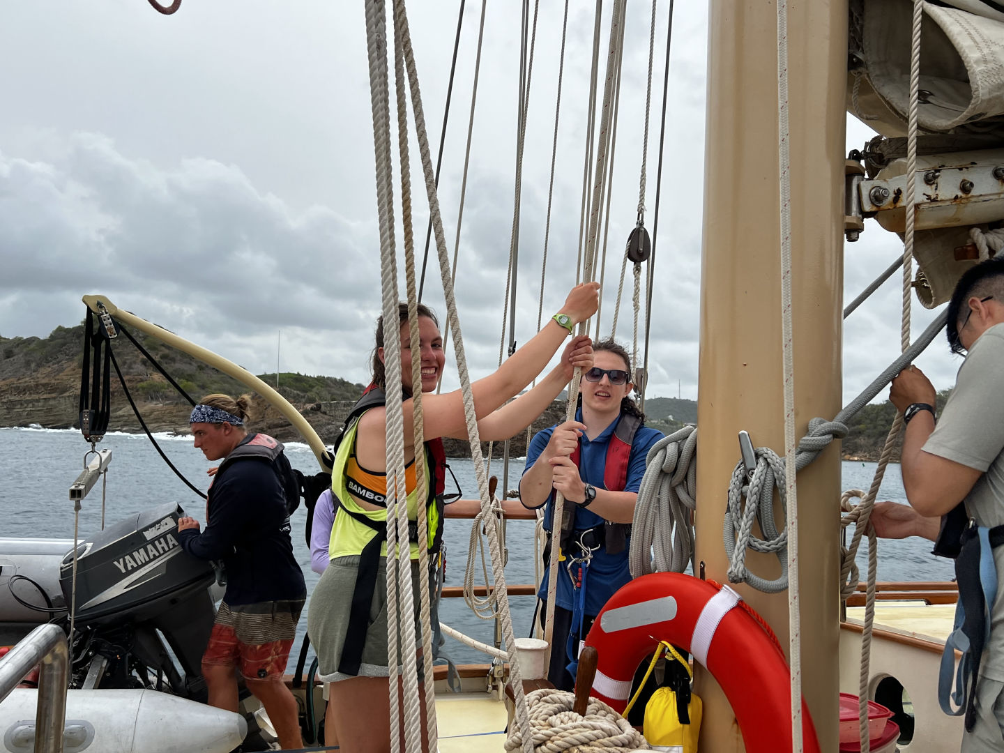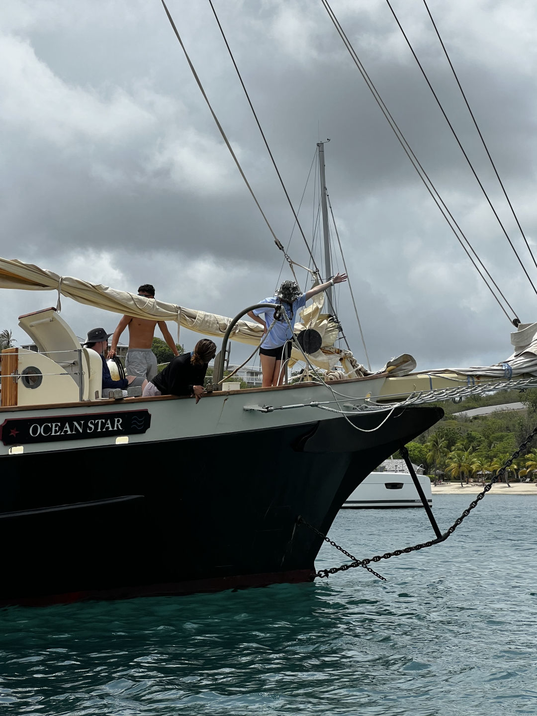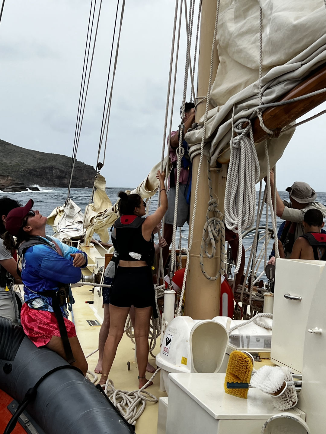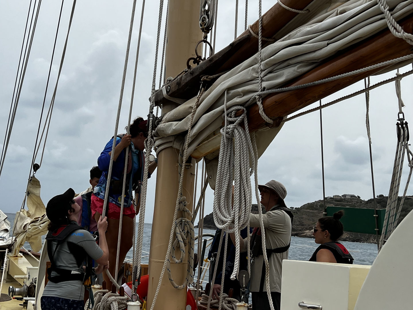 Once we were out of the bay, we started fully putting up the sails and successfully completed a very new and fun task that many of us hadn’t done before. We are currently on our passage to Nevis, sailing at a nice speed of 10.6 knots without too much lateral shift. It was a very eventful and fun day spent with all of the crew. The leader of the crew has been a huge help to us since the beginning and I am thankful we have so many good teachers and students/friends on this trip. I’m excited to see how the passage goes tonight and am excited to get to the new island tomorrow as well. I enjoyed being the skipper today as you are basically the boat mom for the day. You wake up everyone, help people out with their jobs, take pictures and make sure everyone is having a great time. I also can’t believe I have already been on this trip for a week, as it feels like it’s only been a few days. Everyone is great and fun to be around. Overall, today was super busy, eventful, and fun, and I can’t wait to see what other adventures are in store for our crew as we continue to sail across the Caribbean.