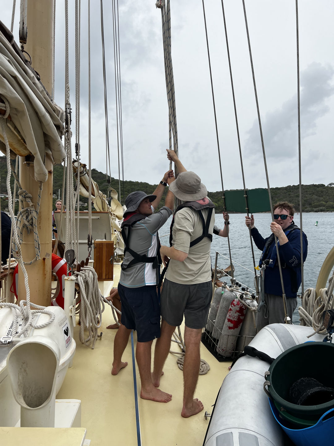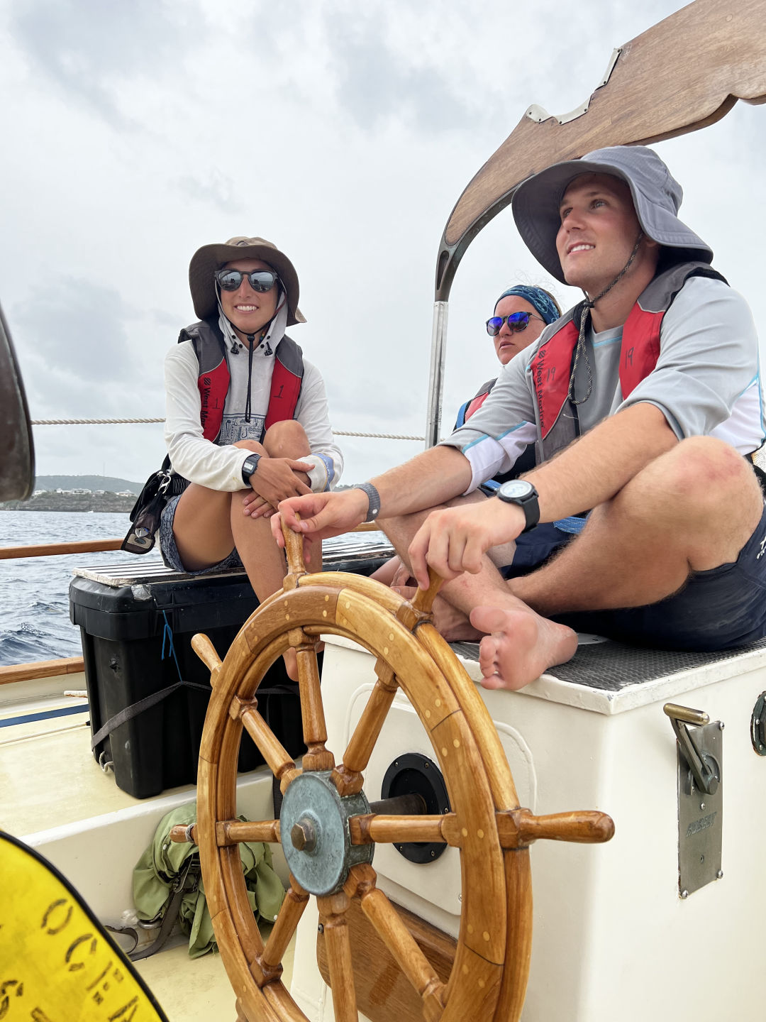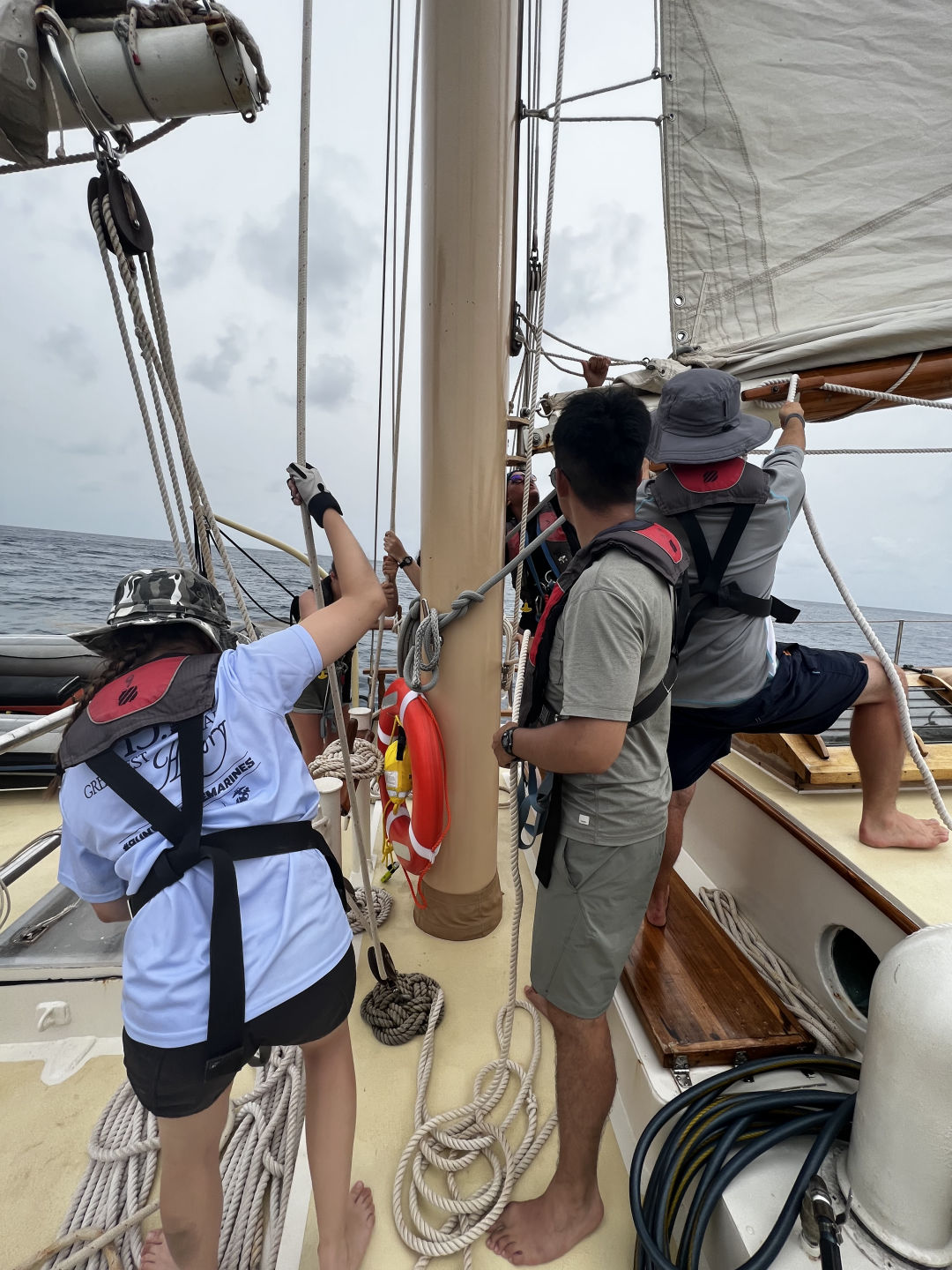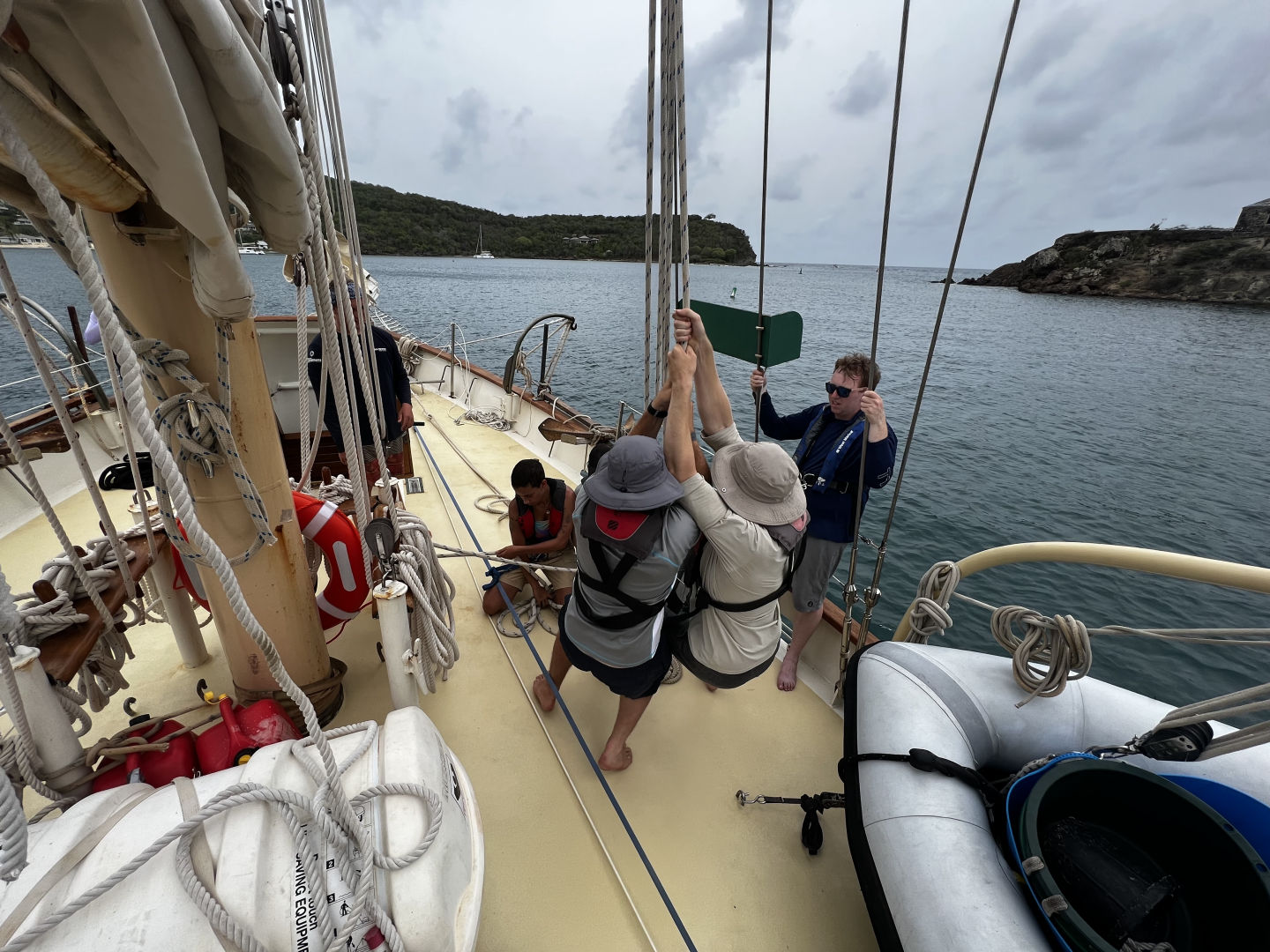 While we were waiting for the boat to be fueled, we went through boat check walk-throughs. These walk-throughs showed our Watch Teams what we would be doing while we are on duty later tonight. Every hour while on passage, your specific Watch Team has to do a boat check. The walk-throughs of the boat check, which was just a slower way of showing us our jobs for the night, contained many items. Some of these items we have, are a logbook of engine room equipment, checking our coordinates while sailing, maintaining sails, and making sure the boat is ready for up to 40 knots of wind and 40 degrees of tilt, to name a few. We also prepared the sails for our passage and learned about the PFDs we had to wear while we were waiting for the boat to fuel up. Once the boat was fueled up, we finished preparing the sails and got on our way out of English Harbor and out into the ocean for our passage.