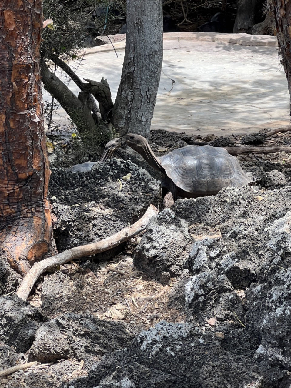 Daphne: William asked me to guest star on his blog because he had free time all day and didn’t think it was interesting enough. Today my group went to the Charles Darwin Research Center. We went on a guided tour to learn more about the Galapagos, the evolution of iguanas and birds, Charles Darwin, and tortoises. At the research center, they have a tortoise sanctuary, where they incubate tortoise eggs and provide a safe place for them to spend their first few years. We saw many young tortoises of different ages and sizes sharing pieces of food, learning to climb rocks (one of them took a tumble that Saskia managed to catch on video, which has probably now been played on the boat a hundred times), and finding shady places to lay. We also learned about Lonesome George, a tortoise icon in the Galapagos. He was the last member of a specific species of tortoise and was unable to produce fertile offspring with the other species of tortoises found in the Galapagos. He died in 2012, so now there are no more tortoises of his species. We also took advantage of one of our last cold soda opportunities for three weeks and got cold beverages at the cafe outside the gift shop (where Ted and I bought matching shark shirts).