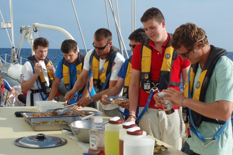 We were off with a bright and early start this morning at 06:00, bound for Bonifacio on the southern tip of Corsica Island. The heavy wind gusts that we experienced yesterday had started to show respite. As we left our anchorage in the harbor of Calvi, soaking in the sunrise with a reefed main and 2 staysails, we began the day-long journey against southerly headwinds and seas. Throughout the day, the winds grew lighter, the swell smaller, and the sun shone even brighter. The shipmates have grown more comfortable on Argo, nimbly cruising around their constantly moving home. Bow watch got a kick this morning out of the wave splashes from over the side. In other news, the shipmates are getting the hang of sail sets and leading raises. We even just had a very speedy 30-minute sail strike, flakes and all, complete with some pretty cheesy fake accents for a good laugh. We should reach the dock in Bonifacio later tonight in just a couple more hours, where there lies a highly anticipated candy store and a sweet hike. Signing off until next time.