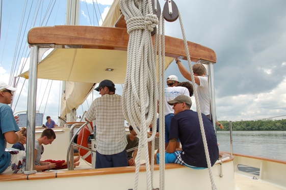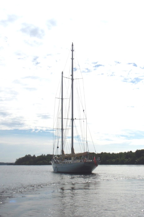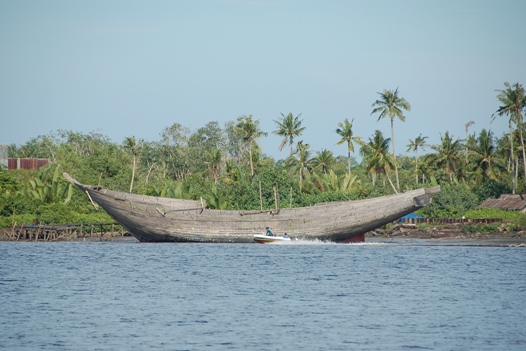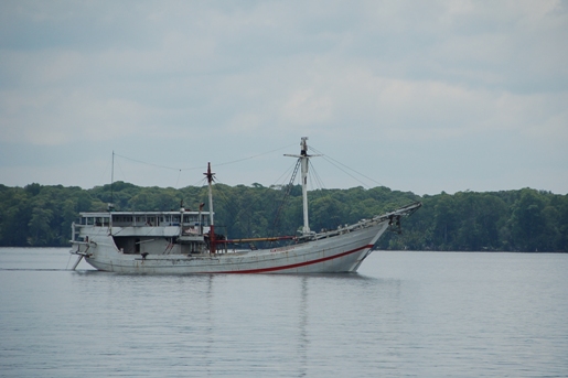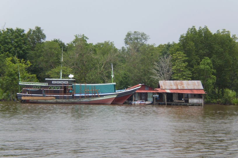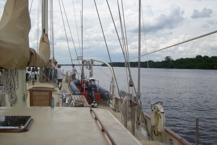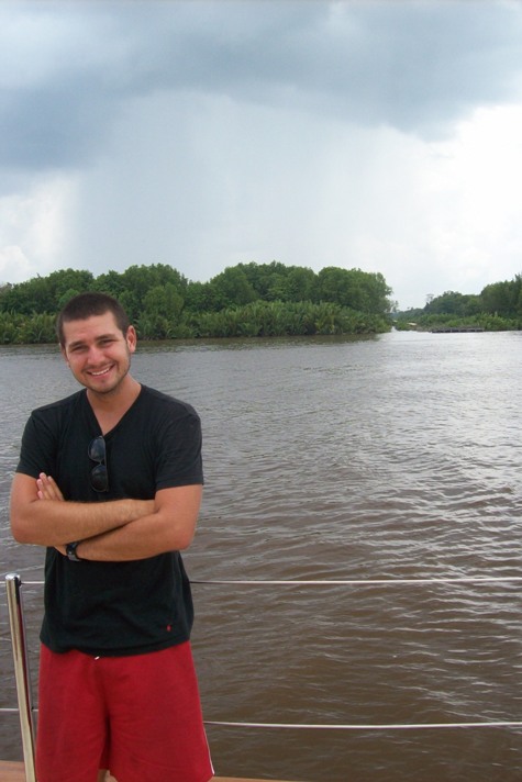 We arrived in Borneo this morning. When I woke up, we were motoring up a river in the middle of a tropical forest. We anchored near Kumai, a town, and got to work cleaning the boat. It’s much hotter inland, and it’s also quite rainy here. Our work was interrupted by showers. The rain continued on and off, and we were even forced to have our first meal below. We all crowded into the salon to feast on enchiladas while it rained outside. It is nighttime now, and we’re packing to visit the orangutans. James B., Tom, and Margot are whipping up a batch of lemon poppyseed muffins to eat in the morning before we leave.