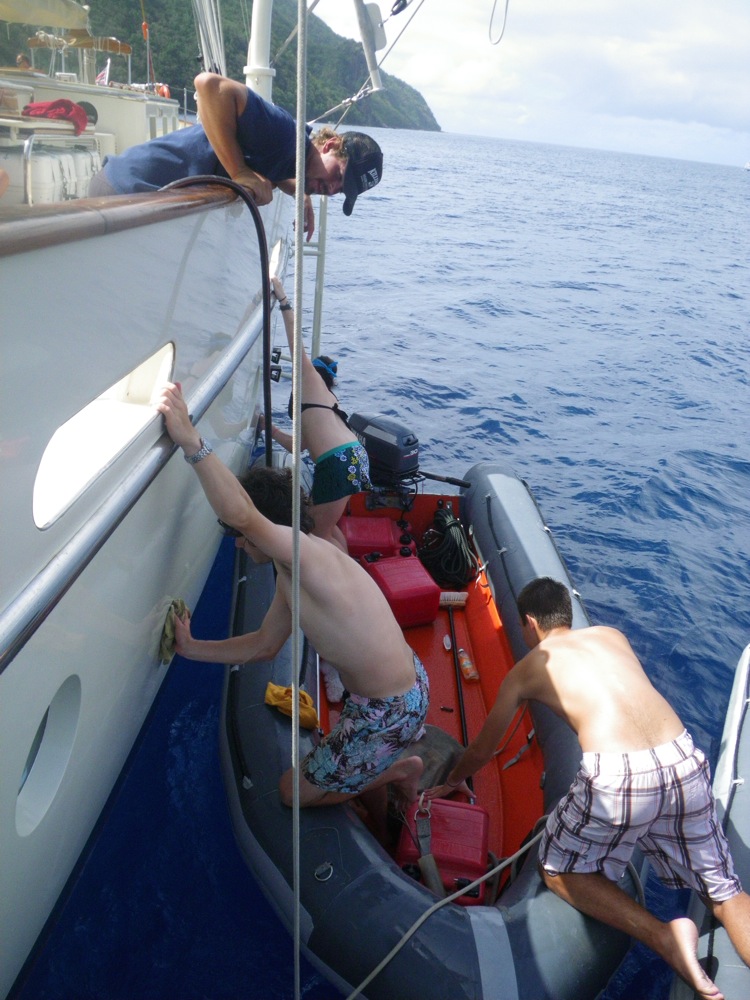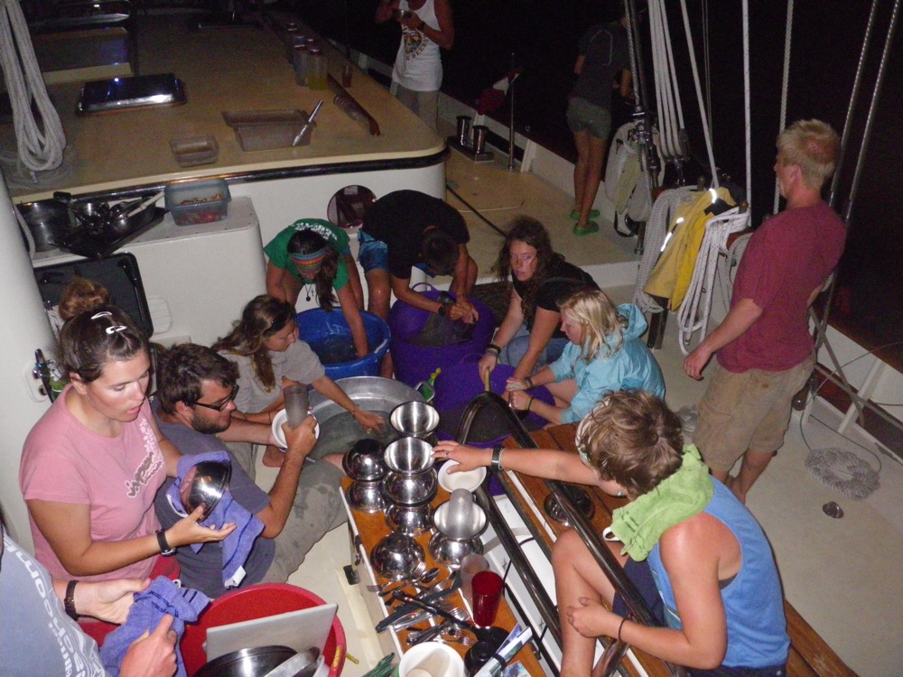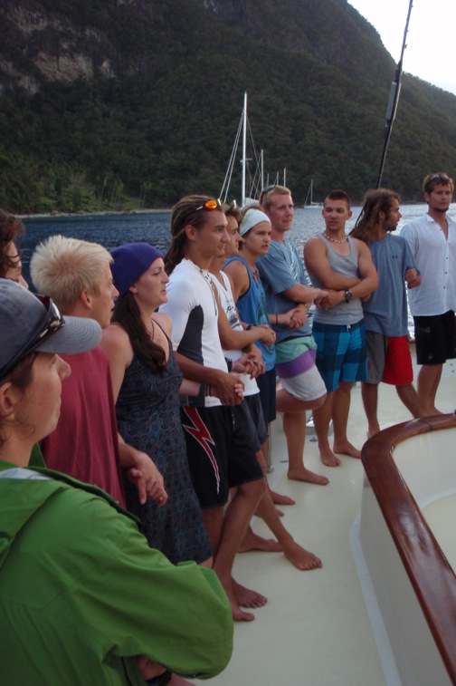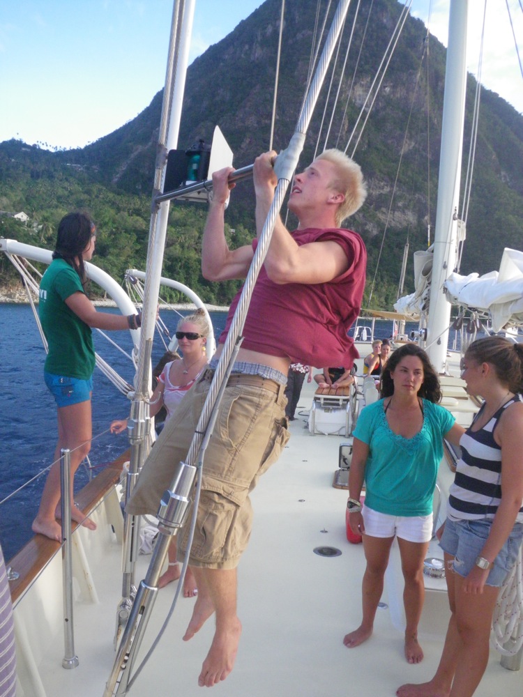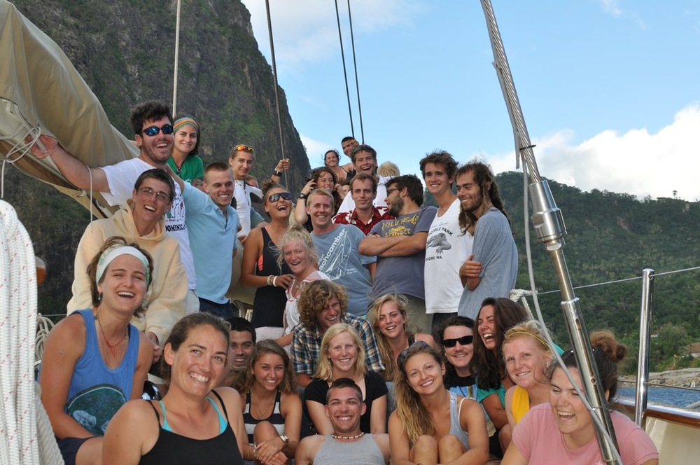 Today was fairly easy as we woke up around 7 am. After eating breakfast, we packed lunches for optional shore time on the beach of Jalousie Resort. After cleanup, we mustered in the salon for a Boat Appreciation for the upcoming dinner we were hosting with our fellow Sea|mester vessel Ocean Star. Scrubbing the deck (bow to stern), we then waxed, and rust busted. The Argo crew had her looking shiny new. Argo has done a lot for us, and after a long passage or the boarding of guests, we take care of her. Following the BA, we hopped in Boonrod and Nopadome to venture to shore. A few hours of sitting down and talking with the crew at the restaurant was cool. Returning to our home from the trip, we were soon greeted by our visitors from Ocean Star. Meeting for the first time on one boat on opposite navigations, our crew and the crew of the sister vessel met and hit it off quickly. Coming from similar situations with different islands, you get the feeling that the Caribbean changes everyone who experiences it in a different way. Ocean Star is different from Argo in that it is more of a pirate ship. The crew of Ocean Star was excited and impressed by Argo’s size and technological advances. We sat in the salon as an audience for Sonia, an SMMA (Soufriere Marine Management Association) presentation, where she discussed the world-class management St. Lucia has over its waters. Looking at the integration of the two crews, it was a nice change of scenery, with visitors sharing similar scenarios up to this point in the trip. The Big Band had a good time together, and this meeting should be an annual event. We are ending the night with more study time for our first Marine Bio Exam tomorrow while underway to Bequia. Thank you, St. Lucia.