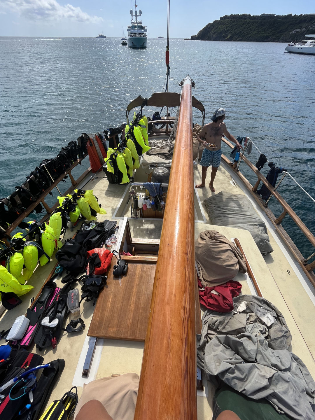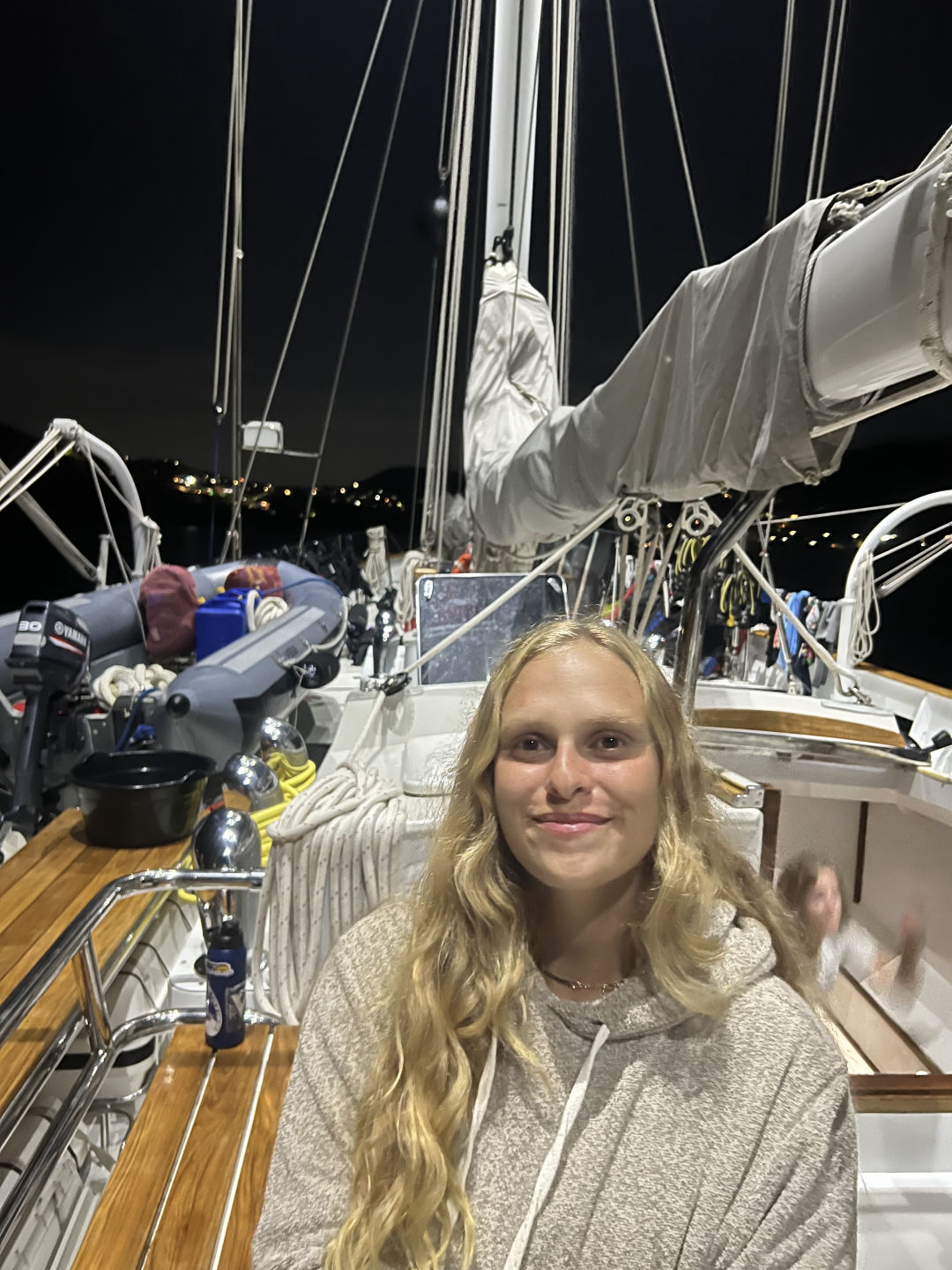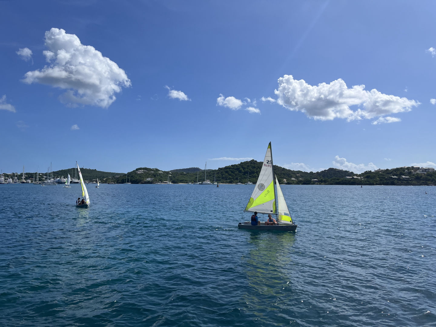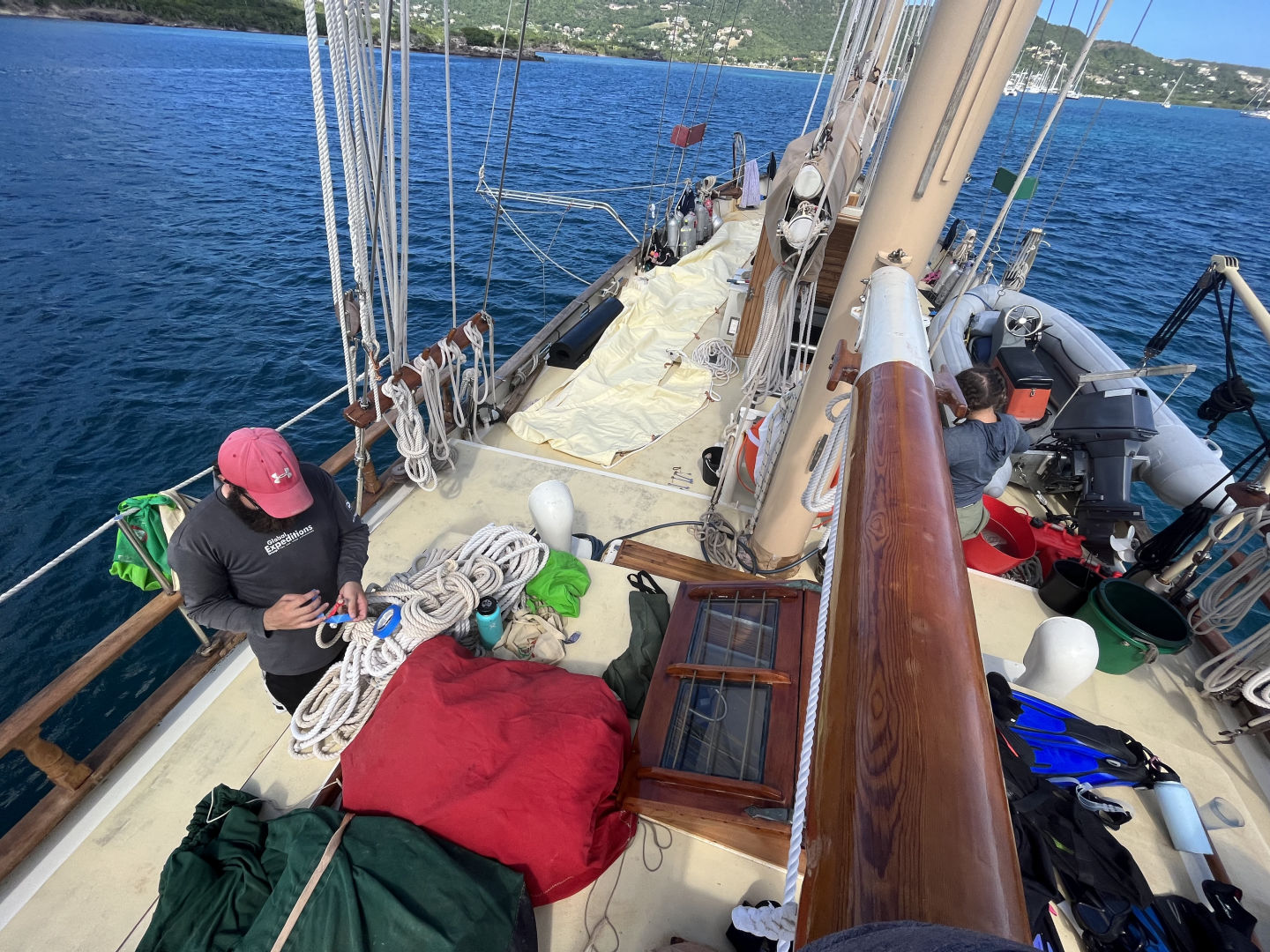 Today we had another jam-packed day in Falmouth Harbour. We began the day with some french toast from chef Ryan. The group was then split into 2, with the first going dingy sailing and the second staying for a messy boat appreciation morning. This involved lots of deep cleaning before all the students leave. The dinghy sailing crew headed to shore and geared up for some sailing. Everyone paired up, and off we went! Conditions were great, and some students even set off to go sail around Ocean Star, which is anchored out far in the anchorage. After the first group of sailors, everyone switched, and the first group started messy BA while the others set off for some dinghy sailing. In messy BA, things definitely got messy. We cleaned all the gear, took off the sails, did inventory down below, and even cleaned our gray water tank. As the groups were preparing for the swap-in activities, we saw a boat approaching in the distance. Very quickly, the crew realized who was arriving. VELA! As they came into the harbor, we gave them a honk and said hello. We carried on with lunch, consisting of some delicious baked potatoes, then we finished out our messy BA and dinghy sailing festivities. After everything was finished, Vela had cleared through customs, and their crew swam over to say hello. It was crazy seeing other students just like ourselves after 78 days aboard Ocean Star.