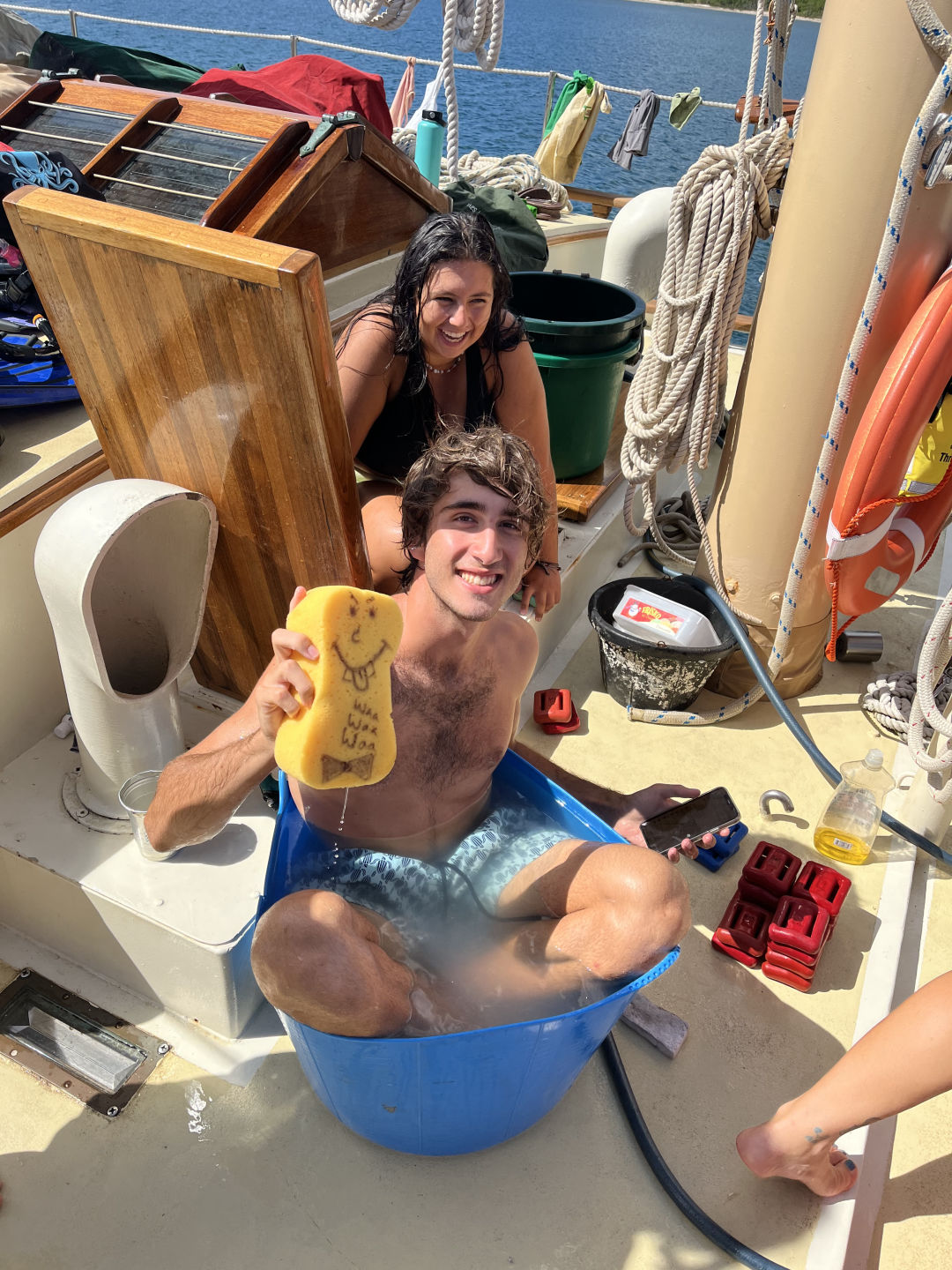 We showered and talked, letting the Vela crew tour our girl Ocean Star. Some of our crew made the swim over to Vela and took a quick tour of their boat. Later, Ryan and sous cheffed up some spinach pies, and we took them over to Vela for a big family dinner. It really was like a Disney Crossover episode. The event of the year! We talked and ate, sharing our stories of the past few months. Little did they know… they were in for a treat. As everyone turned to get ice cream, KT and Kate, our engineers, stole the Vela ensign right out from under their noses. For those who don’t know, the ensign is the flag that flies from the stern of the vessel. After this task was complete, we had a bit of a face-off: apple bobbing in the dishy pit!! Sean, Ashlyn, and Ryan made it their mission to snag the win for Ocean Star, and that is exactly what they did. They wasted no time dunking their heads in the dirty dishy water for those apples, all for Ocean Star glory!!! After, we all said our goodbyes and headed back to our own boat. We shared our appreciation during the squeeze, and everyone was off to bed, preparing for what was to come on the final full day tomorrow.