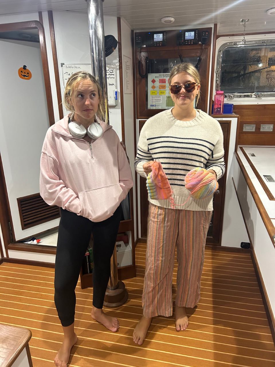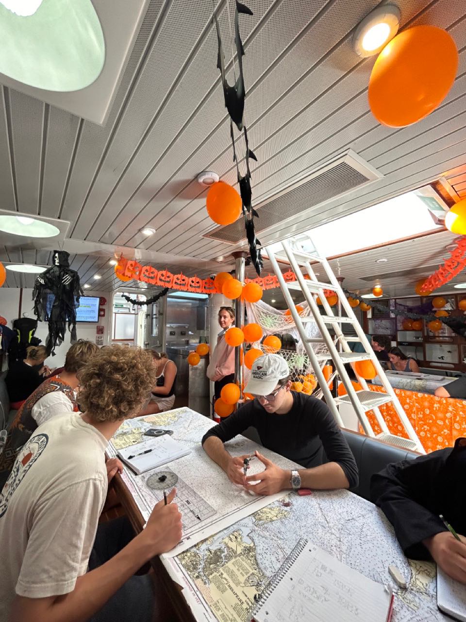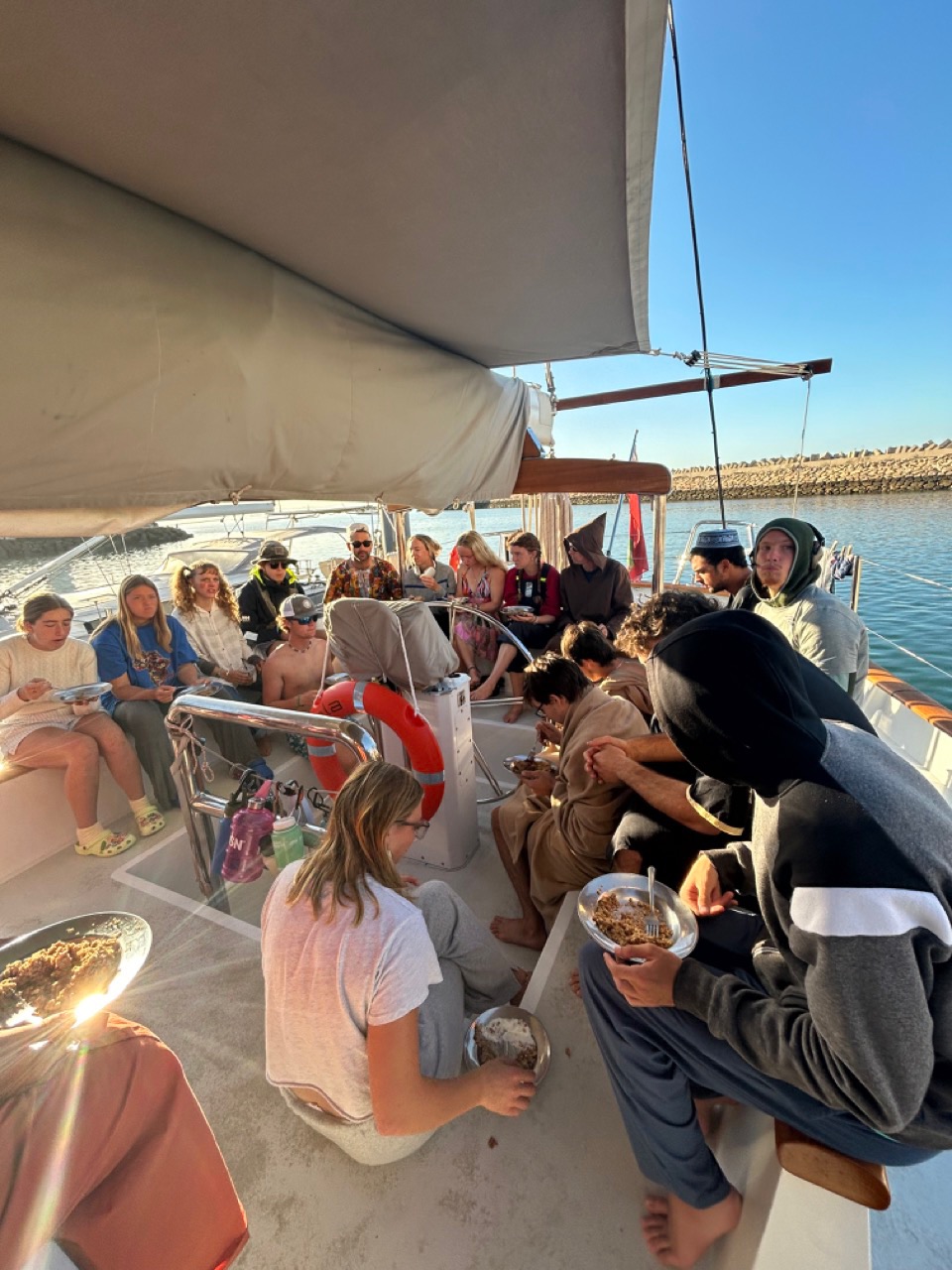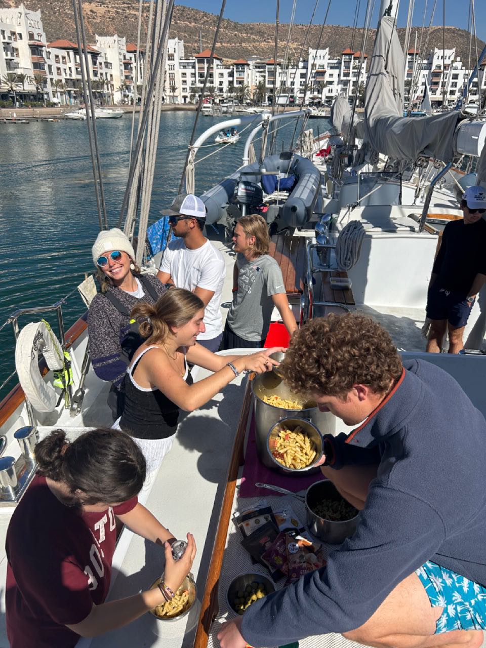 Next, half of the boat had Seamanship, where we continued to learn about plotting. Then we all had a lunch composed of pasta salad and festive spirit (third pictureLillian, Talia Chloe, Edwardo, James, Brenden, and Lukas). The other half of the boat had Seamanship (fourth pictureTheo, Big Mac, Ellis, Talia, Claire, Lukas, Dan, and Eliza), while the others had free time.