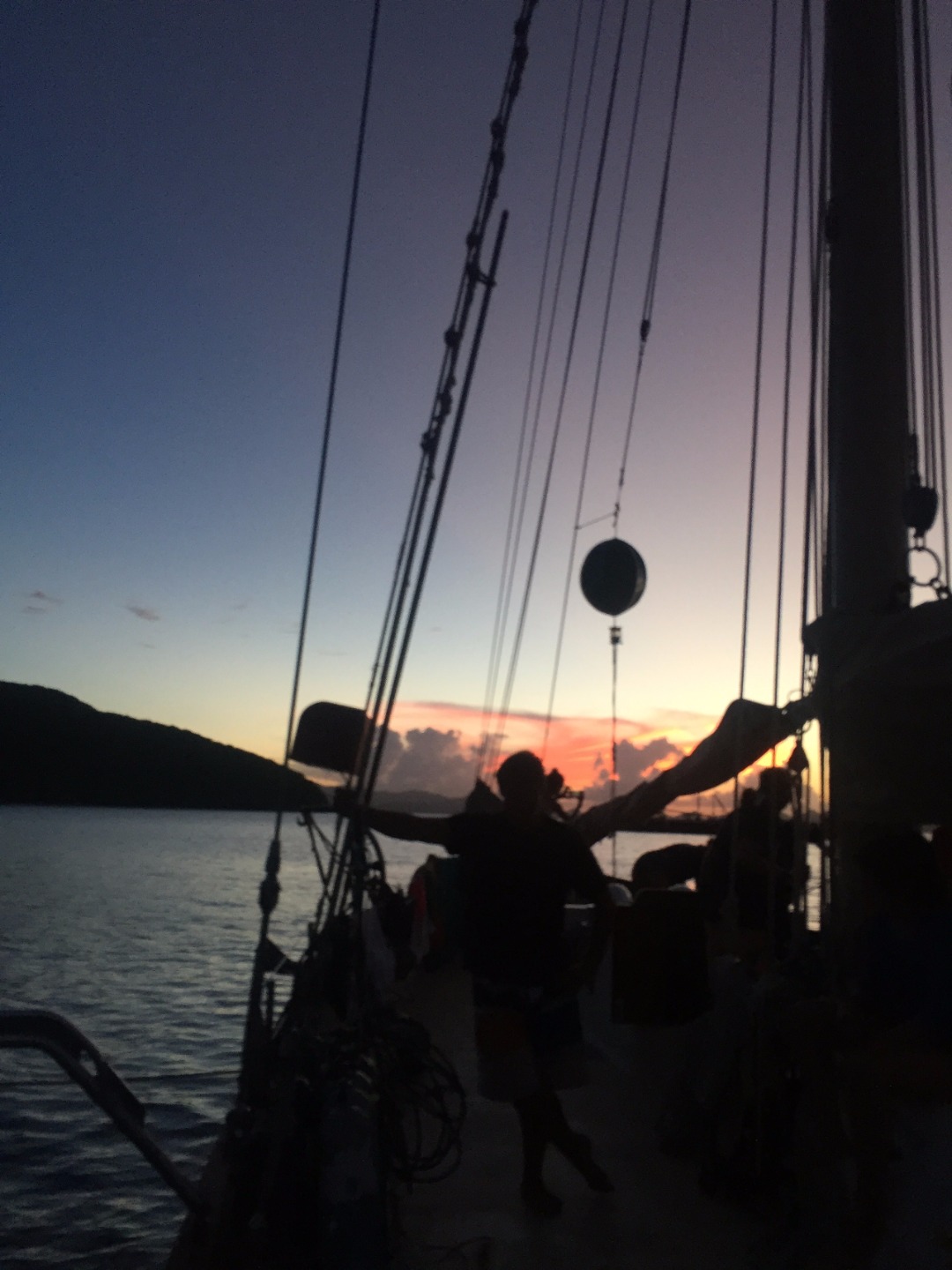 I thought it was lava. Dense. Bright. When the moon, twice as big as normal, rose up from the top of the volcanic island Saba, I was on the most smooth and serene overnight passage after all of the memories of seasickness. It was a gift, going back to the BVI, where everything started. To Ocean Star and some staff members, it was almost the journey back home. To me, BVI was not yet home to me, but it was the thirty-some-odd day in the life on the sea, on this boat, and that was just as comfortable as home to me. The day was called Hell day because of the fully packed schedule: preceded by the previous full-day hiking, an overnight passage followed by three islands visited, and a wreck dive after an onshore excursion. However, as I saw it, this was our Victory Day. We had a wet entry into The Baths on Virgin Gorda, just like how we had always landed. We jumped off a tall rock into the water, just like how we had always explored. We then had a wreck dive on the RMS Rhone in the afternoon, swimming through the coral-covered debris. Against the sunset and two rainbows, we had dinner on the deck, just like how we had always done, on Ocean Star.