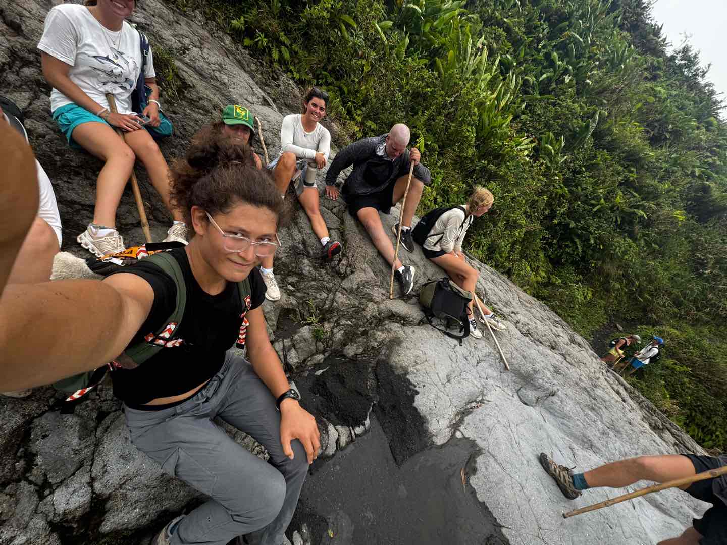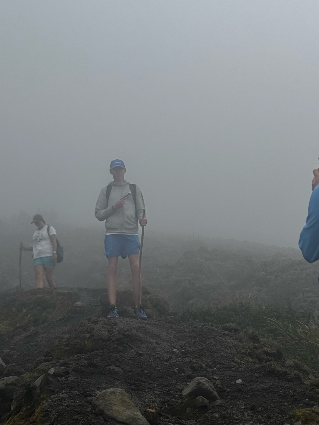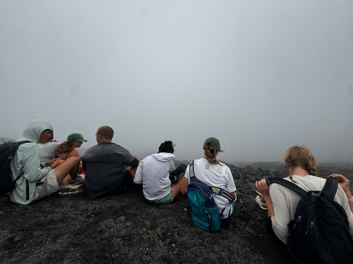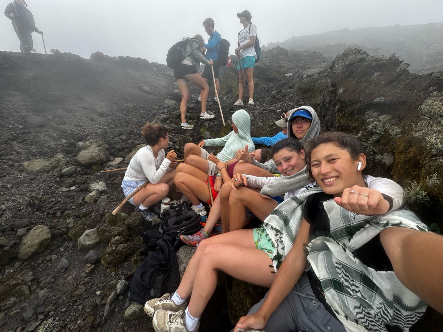 Suitably refreshed, we pressed on in the hot tropical lower forests until we got up to a second large river bed. At this point, we started the more barren summit. The tip of the volcano was wreathed with fog, and the winds got up to 50mph as we rounded the crest and looked down into the crater. In the cold, we huddled together under a little ledge to eat a well-deserved lunch and look down on the crater lake. Once we were all raring to go back to the warm tropical forest below, the group started a quick run-descent down the volcano. Once everyone had regrouped at the bottom of the valley, a long car ride back led to two vans full of napping crew suitably tuckered out.