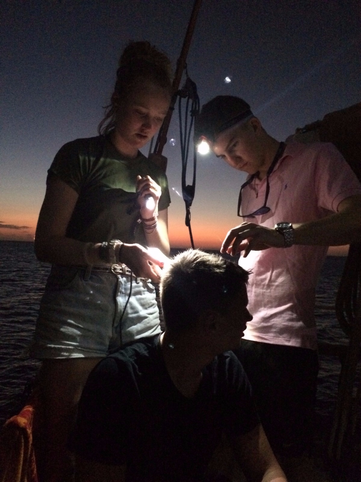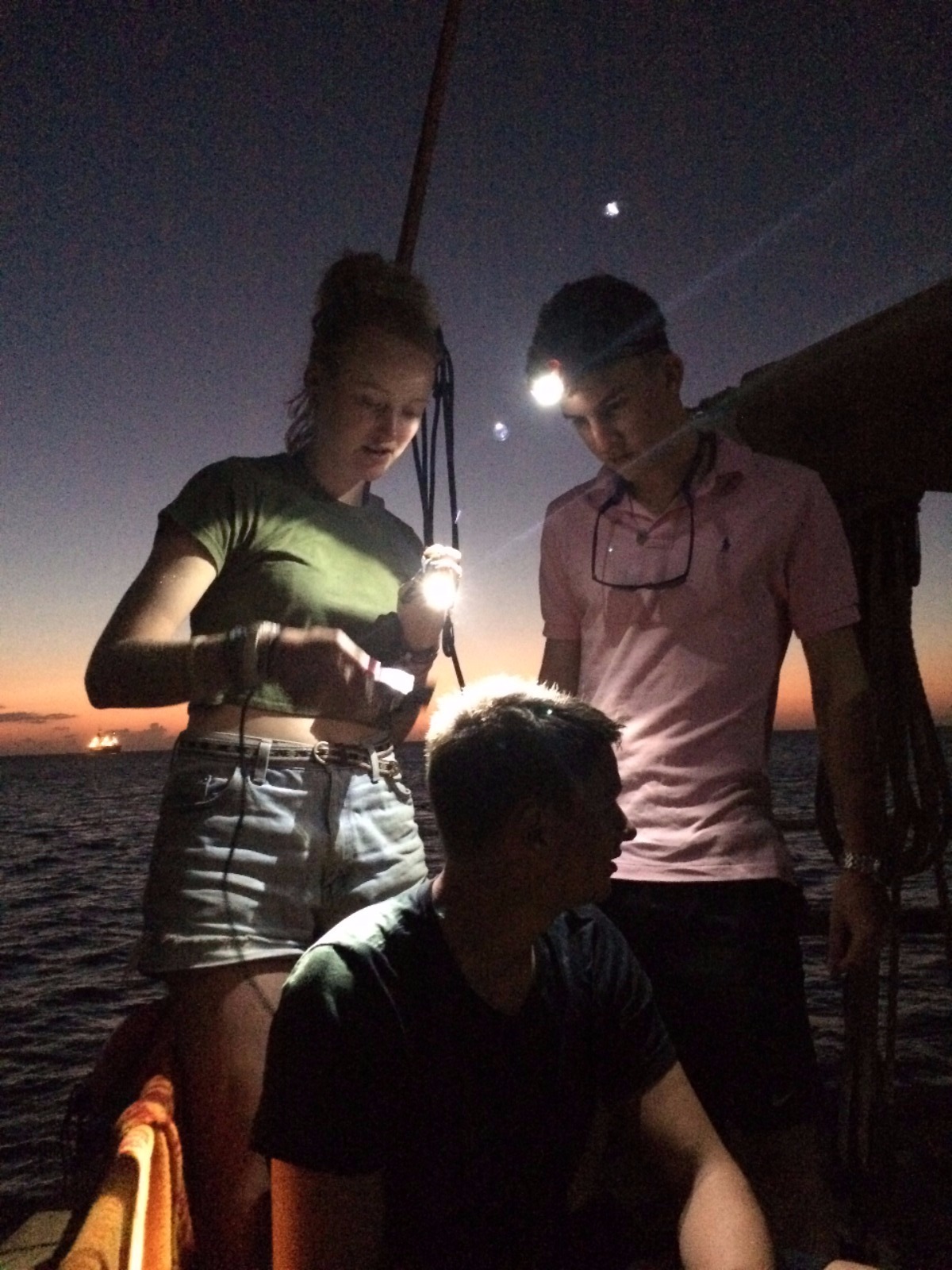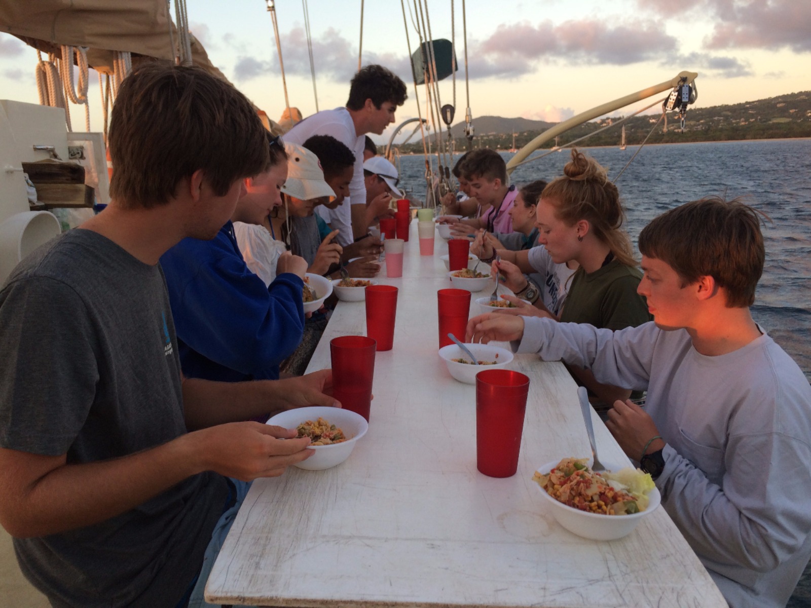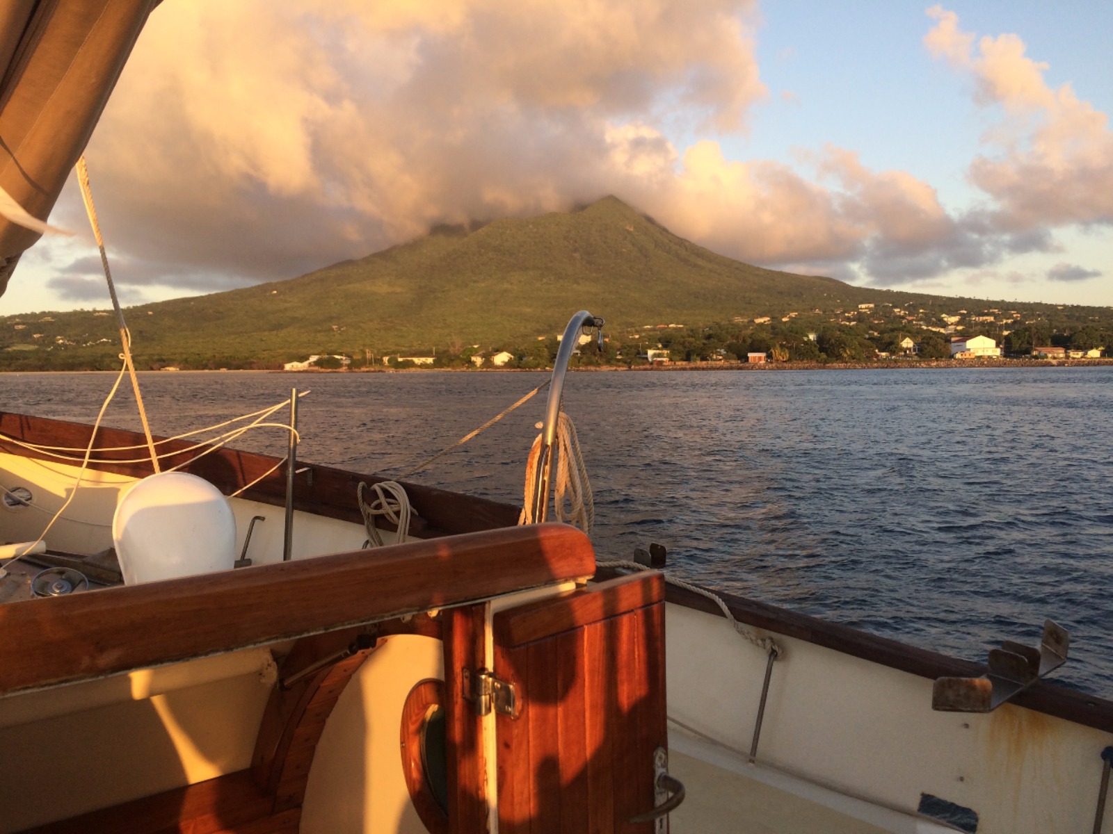 Today aboard Ocean Star, we started our day at the wee hours of the morning with watch teams starting at 12 am, 4 am, and 8 am, and another at 12 pm. We were separated into three watch teams, each one doing 4 hours on watch and 8 hours off to rest up. On watch team two, we were greeted by the street lights of the island of Saba as we passed by. We watched the sunrise, and we were hit by two small squalls. After the squalls passed, there was a double rainbow, and many of the crew were excited to see it. We pulled into Charlestown, Nevis, at around 2 o’clock and dropped anchor. For a couple of the crew members, they were glad to see land again. We had a wonderful dinner with the volcano in the background and the sunset in the background, creating pink clouds around the volcano. After dinner, we cleaned up and watched one of our fellow crew members get a haircut from our resident hairstylist team: Hunter and Anastasia. That’s all for now!