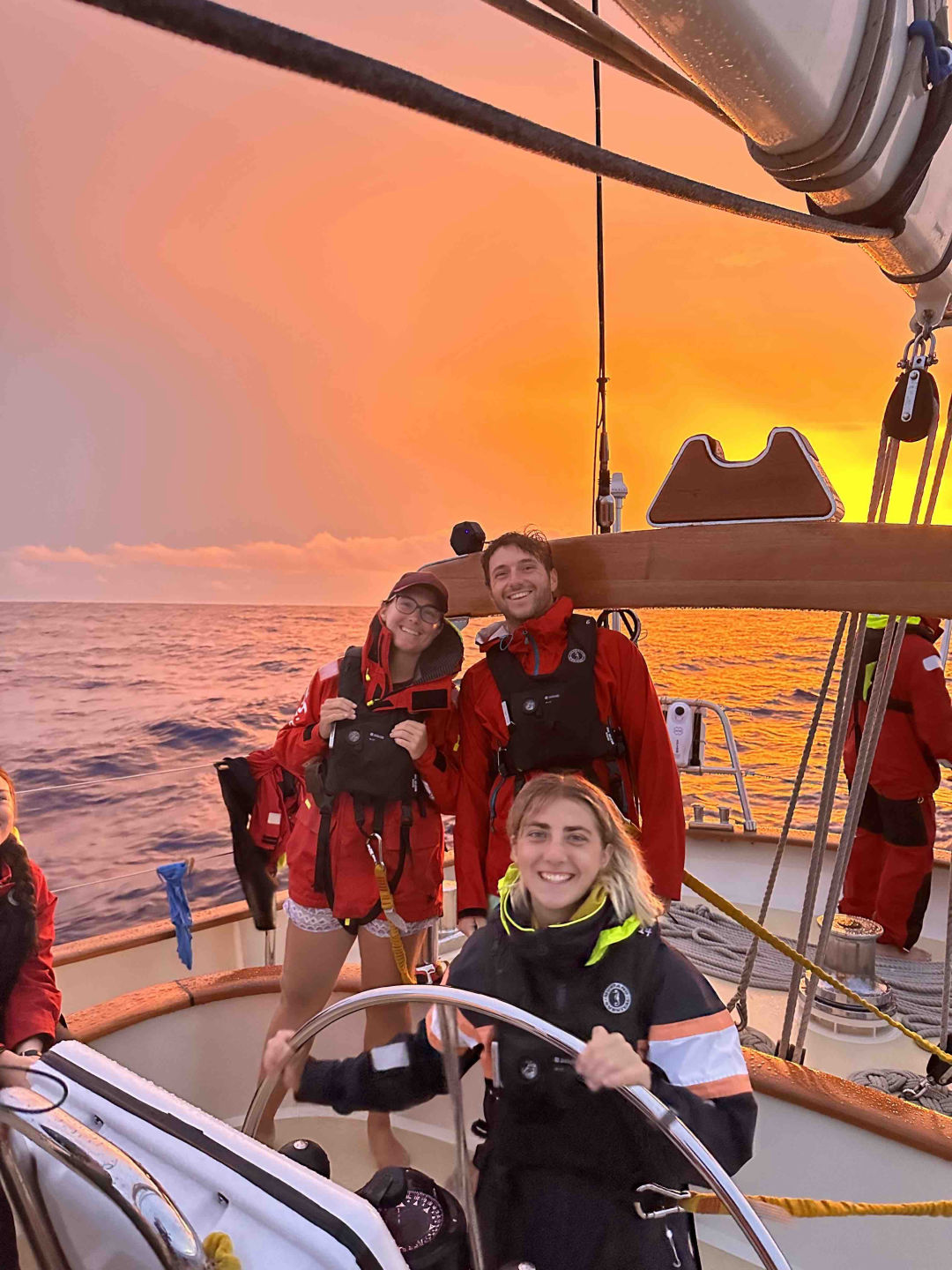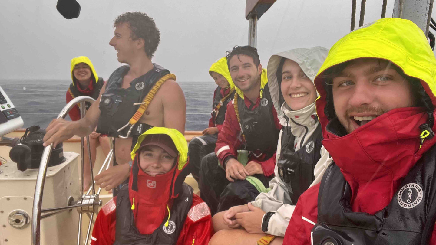 As usual, the day began bright and early for one Watch Team! Watch team 2 had the 12 to 4 shift today. MG and Zoe helmed the Argo away from a nearby squall, going off course. Towards the end of the watch, they began course correcting, heading straight for the squall. Tim of Watch Team 3 says he “is disappointed.” The rest of watch team 3 seems to share similar sentiments after they were forced into the squall. They were rewarded for enduring a drenched four-hour shift by a beautiful sunrise.