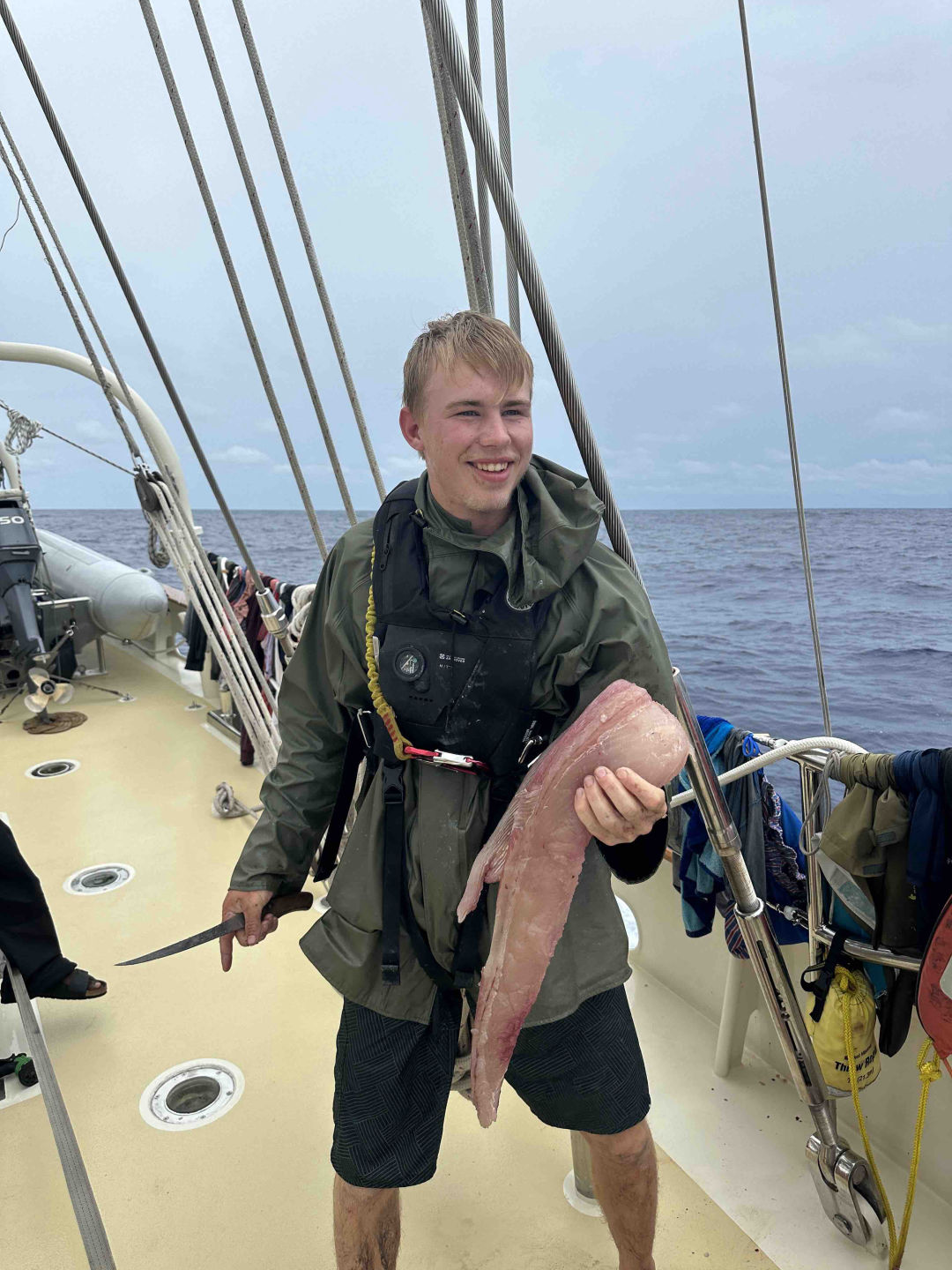 Watch Team 1 on the 8 to 12 shift caught a massive Wahoo fish, approximately 4/5 the length of one of me. Tim killed the fish and led the filleting efforts. This culminated in a delicious fish dinner.