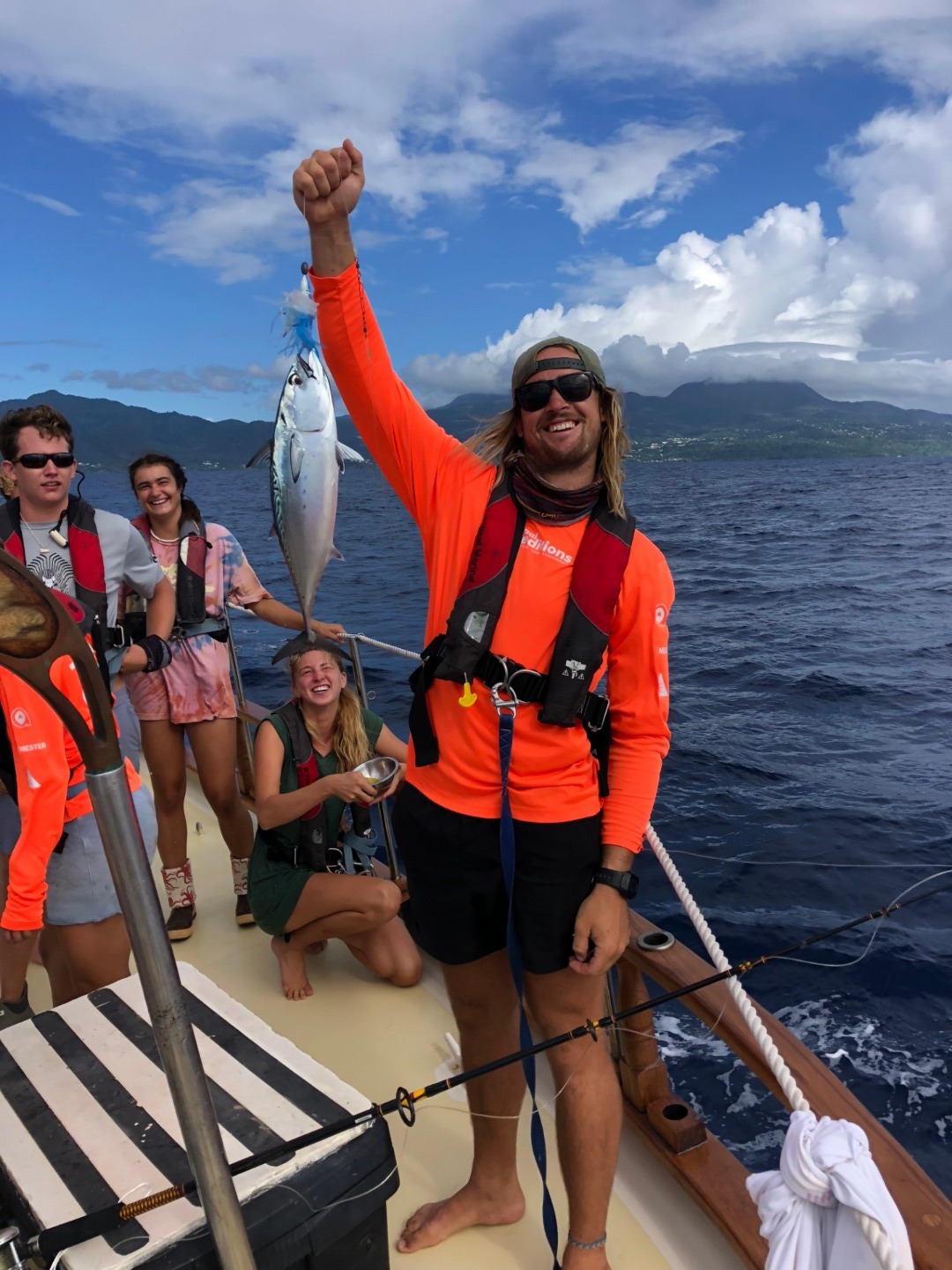 They’ve done it. After days and days (55, but who’s counting…?) of their intense pursuit, Matt and Jon have finally done it. Following an incredibly smooth wake-up, passage prep, and departure from Les Saintes this morning, at approximately 0900, a real, LIVE tuna was pulled aboard Ocean Star by our resident fishermen. Though it might not be the same as the giant ones Matt catches back home off of Cape Cod, the excitement of their first real catch was not lost on the rest of the crew!