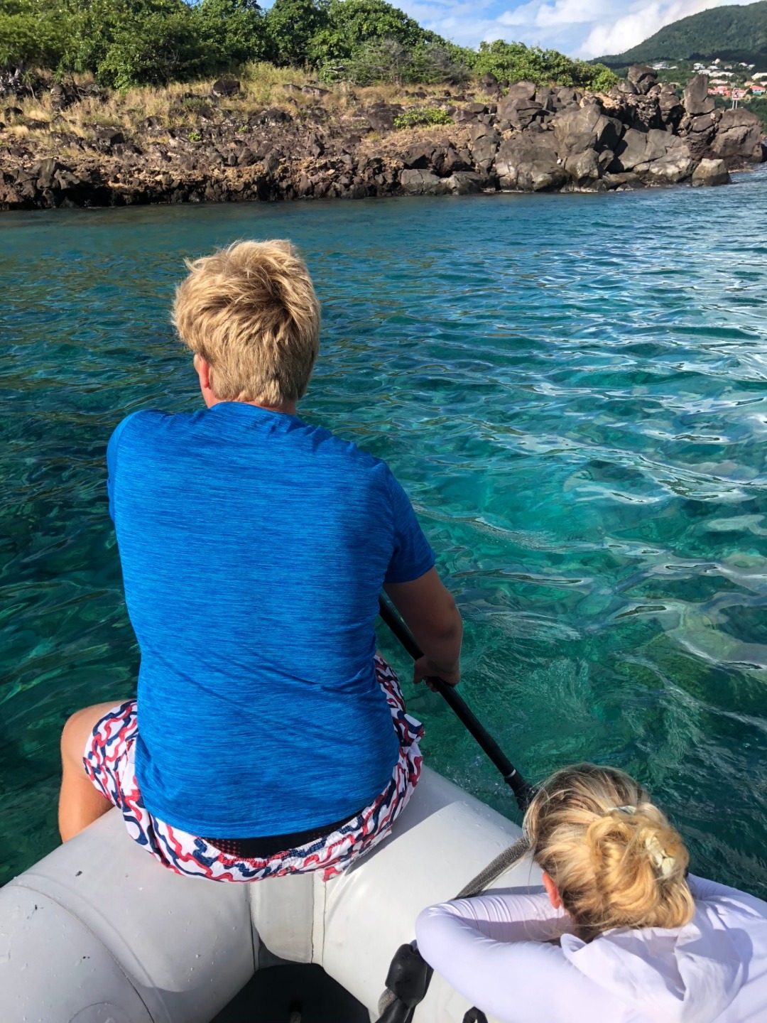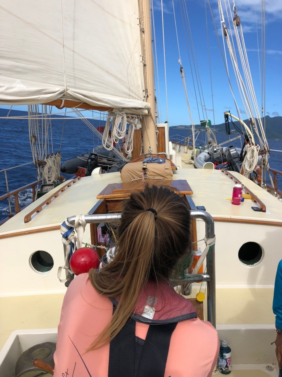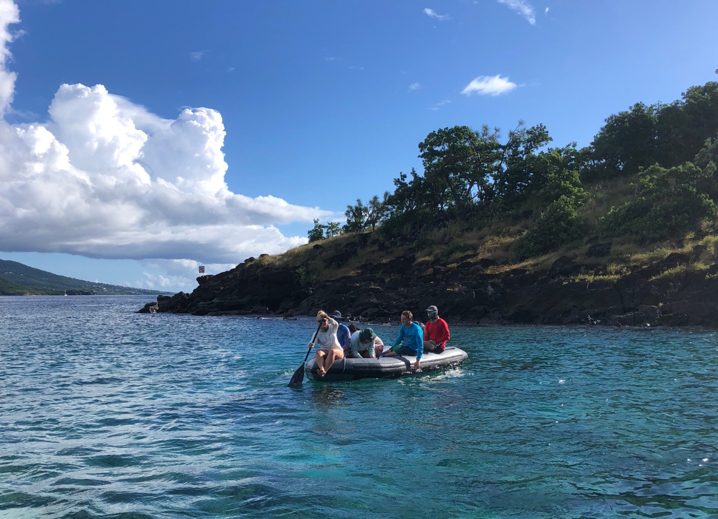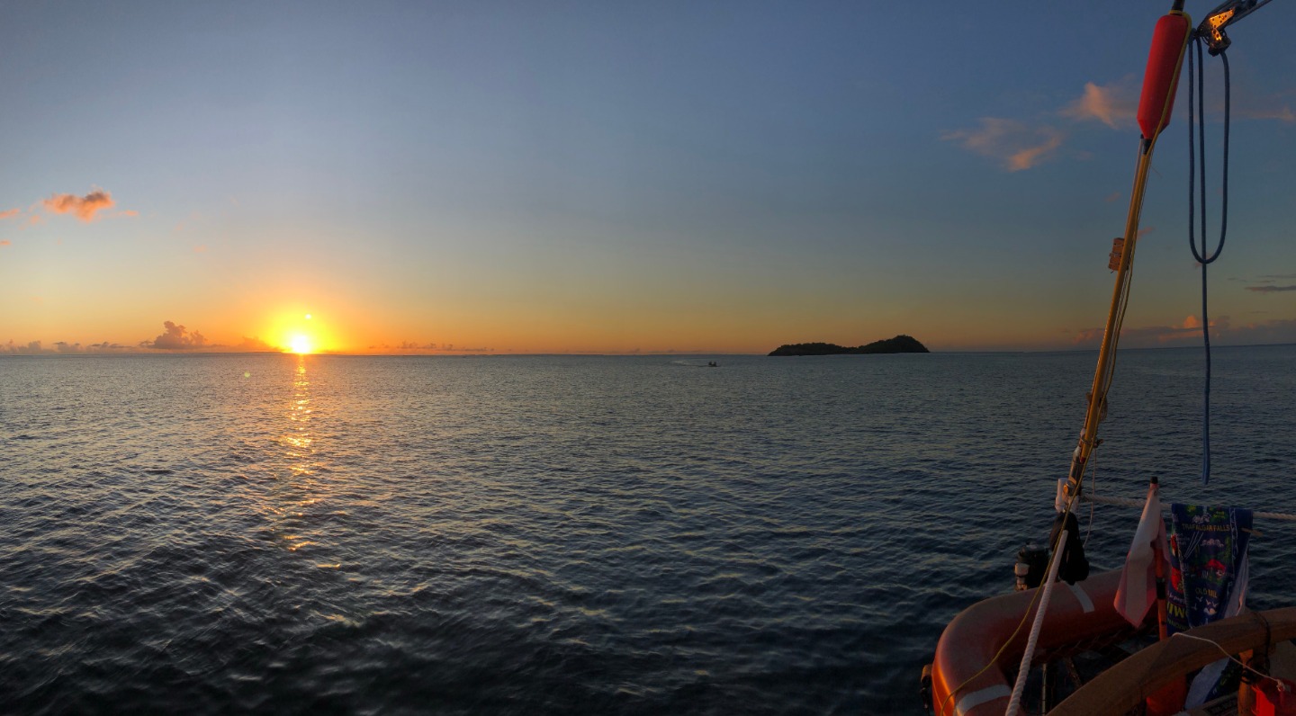 Once we arrived at our anchorage near Pigeon Island this afternoon, we had a quick Marine Biology class before we were shuttled over to Pigeon Island for a Leadership class ashore. We ran into a bit of a hiccup on the way, though, as “No Propellors” signs lined the approach to the island. No worries though, our resourceful crew quickly resorted to paddles to overcome the minor setback. Ridge and I hopped on the bows of the dinghies we were in and paddled away, and when that wasn’t as efficient as we needed it to be, we hopped in the water to swim Exy and Irv to shore rather than making it a wet entry for everyone. Leadership today was an hour of reflection; we were instructed to find a spot on the island to sit alone and reflect on the trip, how we’ve all grown, what’s going well on Ocean Star, and what isn’t. It was great to have a bit of alone time this afternoon in such a beautiful place, and I think it definitely made us all realize that almost three-quarters of our voyage has passed in what seems like no time at all. Even so, we’ve certainly got plenty of adventures left to have as we prep for diving tomorrow and our “plan your own adventure” day later this week in Guadeloupe.