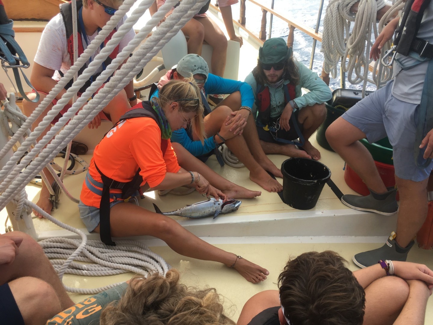 The excitement of the morning certainly set the tone for the rest of the day. After the big catch, we all got an impromptu lesson in fish dissection and gut content analysis from Amy and a lesson in how to go from fish to fillets from Matt. As we continued underway, some of the Advanced Open Water divers finished correcting a few of the knowledge reviews to complete their certifications. The Rescue Diver candidates and I worked through all of ours. What this means, though, is that we’re inching closer and closer to when we could come upon a mock-rescue situation at any time that we’ll have to work together to navigate in order to successfully pass the course. It’s definitely going to be an interesting way to complete this certification… it’s one thing to go through scenarios to complete a course, but it’s another to live with your instructors and never quite know when a scenario is coming.