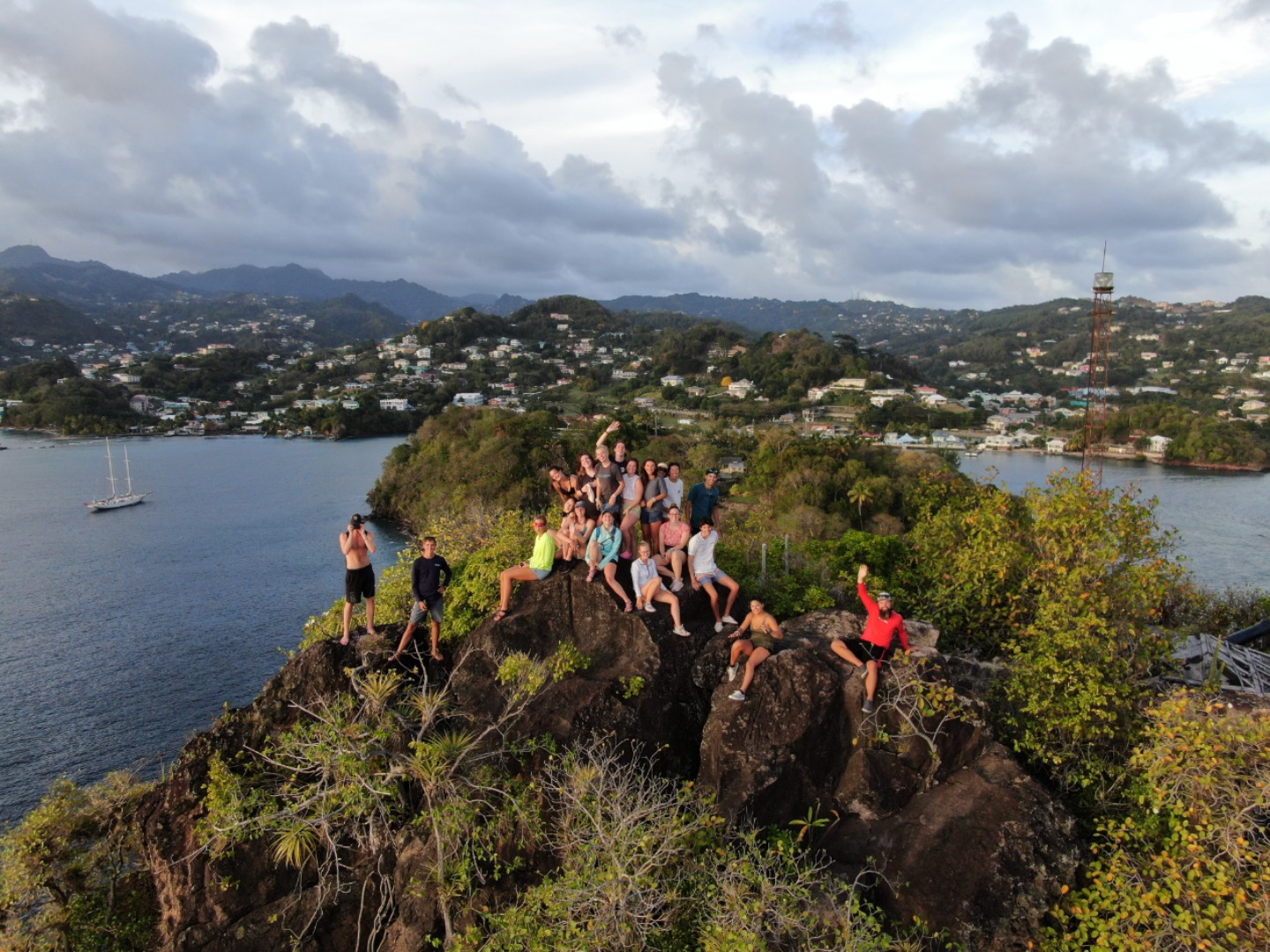 Dawn found us off Young Island, the entry point into St Vincent and the Grenadines. After mooring Vela next to a beautiful schooner much like our own, the crew spent the day catching up on study and classes. That evening we piled into the dinghies to climb Walk-up-rock, an old French fort guarding the entrance to the bay. After a short climb, the crew perched on top of the rock to watch the sun go down before returning to Vela at dusk with the stars appearing above.