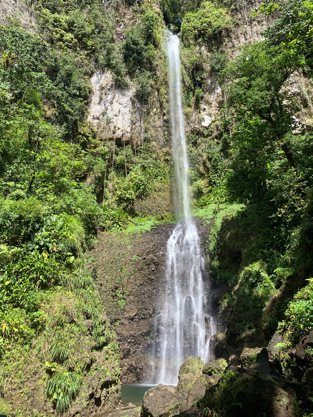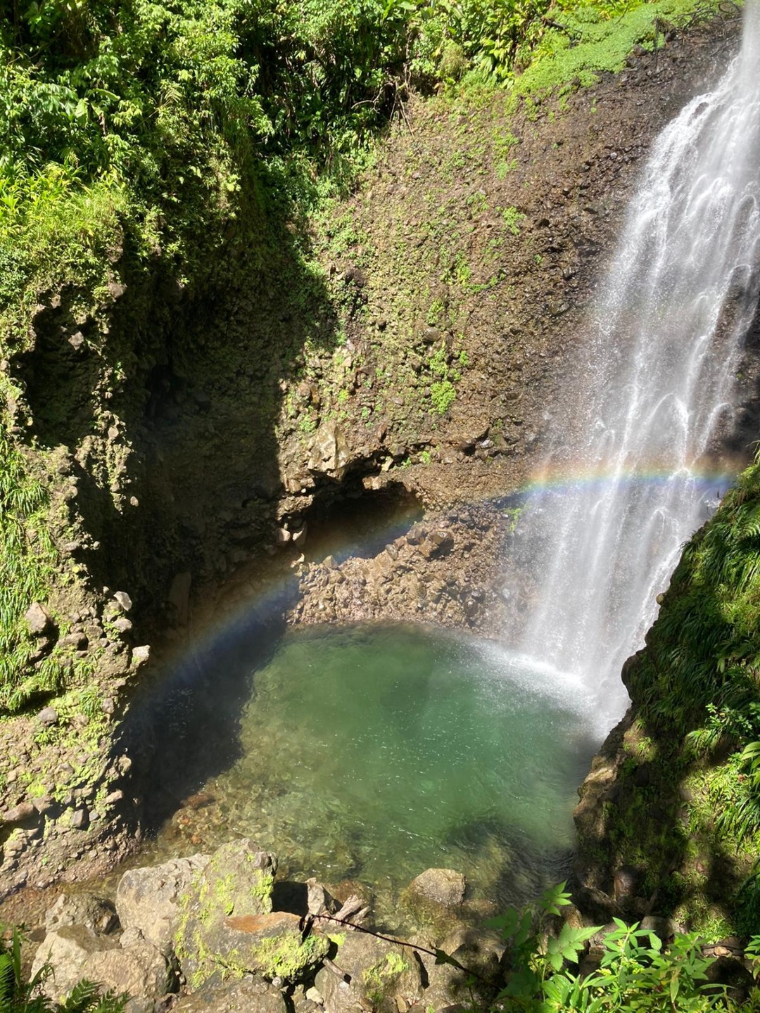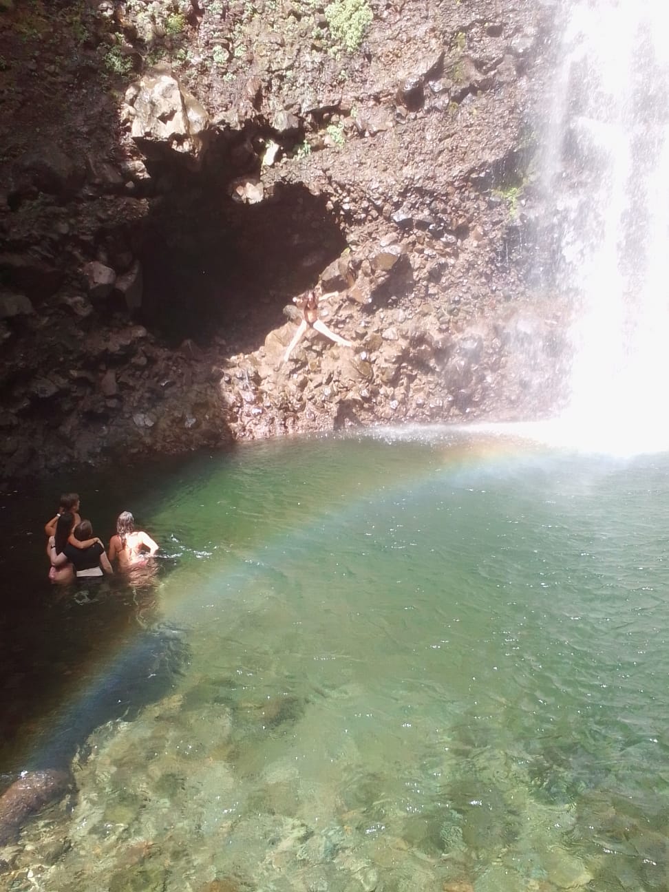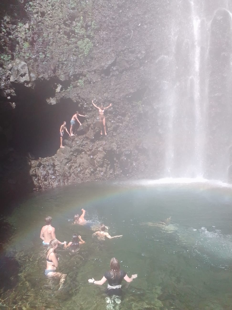 The hike ended up being not quite so long but included lots of roots, stairs, and steep slopes. That said, it was overwhelmingly beautiful. The greenery of the jungle formed a tunnel over our heads, and we walked listening to the forest (well, that and our singing game…). We emerged at a viewpoint where the trail came out overlooking a massive basin into which fell a 275ft waterfall. A perpetual rainbow arced across the pool at its base. Setting down our things and putting on bathing suits, we continued to the waterfall to swim. The pool was refreshingly cool and deep enough to jump into from a ledge in the cliff wall.