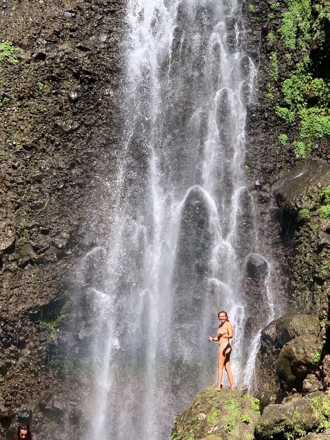 The Gorge was my favorite part of the excursion. We got to jump off the wall of the gorge into the narrow canyon full of clear blue water (it reminded me of Havasu Canyon, Caribbean edition). Donning lifejackets, we swam up the canyon one by one, surrounded by sheer walls of rock that faded into a soft, mossy, green surface higher up. Jungle branches and leaves overhung the gorge turning the sunlight emerald green. We first reached a hollowed-out room, which is apparently the site of the Pirates of the Caribbean scene where Captain Jack’s crew hide out from the bow-and-arrow-toting cannibals after falling from their bone hamster ball in the Dead Man’s Chest. Then we continued swimming upstream (in an eddy) until we reached the place where the river moves more quickly after falling into a small cavern. From there, we walked up the grippy rock river bed into the waterfall room, where we jumped through the pounding water (or, in Sam and Maxime’s case, were shoved under the pounding water by the guide). We returned to warm up in the sun before changing and heading back down into town for some snacks.