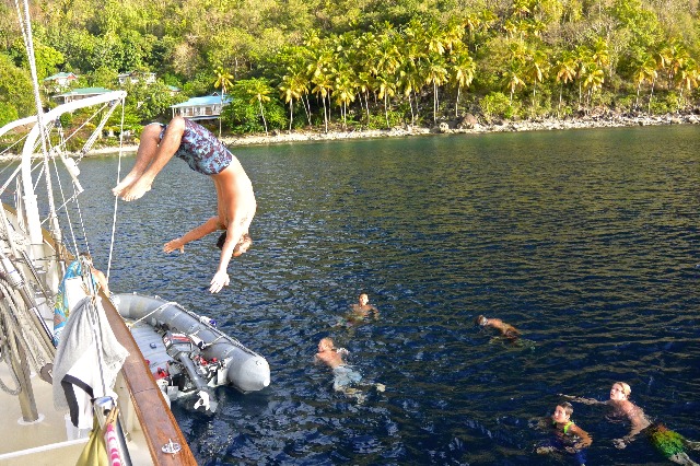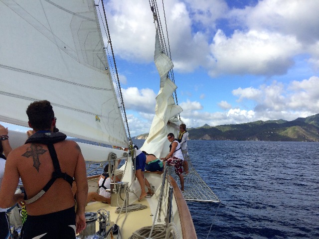 First to negotiate was the beautiful island of St. Vincent, but as we pass on its leeward side, it steals our power, our life, our driving force…….. the wind. The engine on and sail management interjects the smoothness of our morning, but it’s all good fun and good practice as all hands muster and employ themselves on deck. In contrast, bridging the sea gap between St. Vincent and St. Lucia became a windier task, and an incoming squall made it another wet meal time. As passage leaders, Ben and Lexi must be feeling the enormity of even a small passage in command of a 112ft ocean-going vessel. Sunshine, steady trade winds, and afternoon class bring a break from deck duties, but as we encroach on the mountainous Pitons, all hands again employ themselves in dropping sails, putting Argo ‘to bed,’ and picking up the mooring. Our immediate swim, dinner, squeeze, and our next few night’s sleep will be directly in the shadow of Petit Piton.