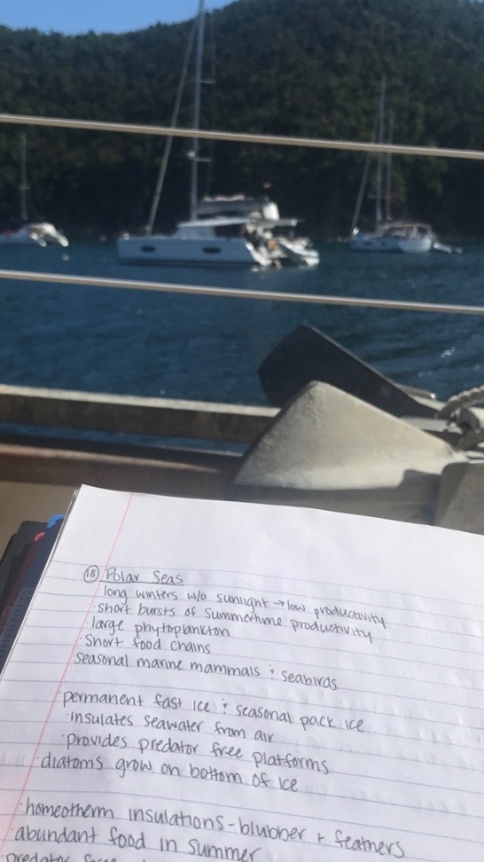 Hello, hello. Hello! Today was a big day on Ocean Star – we all took our Navigation Master exams for seamanship! We had an early wake-up and ate cereal for breakfast before the first group started on the exam. The other two groups had lots of time to chill and study for finals in the meantime. We enjoyed a lunch of mac and cheese and broccoli before getting soaked by a windy shower of rain passing by. After lunch, the last group took their nav exam, and everyone enjoyed more time to chill and do some school work. Tonight’s dinner was yummy burgers made by chefs Zach and Sydney with all the fix-ins. Afterward, Christmas came early with a surprise dessert of cookies and chocolate croissants from Santa! (Thanks, Steve!) Continuing with the holiday cheer, I asked everyone what they wanted for Christmas for our squeeze question tonight – the inspiration for our Ocean Star secret Santa, perhaps? After dinner, some shipmates will go for an excellent night dive while the rest of us enjoy some downtime before bed. As the trip draws to a close, everyone is starting to think about what’s next for us after this incredible journey. Here’s what everyone will be getting up to next semester and a bit about us: