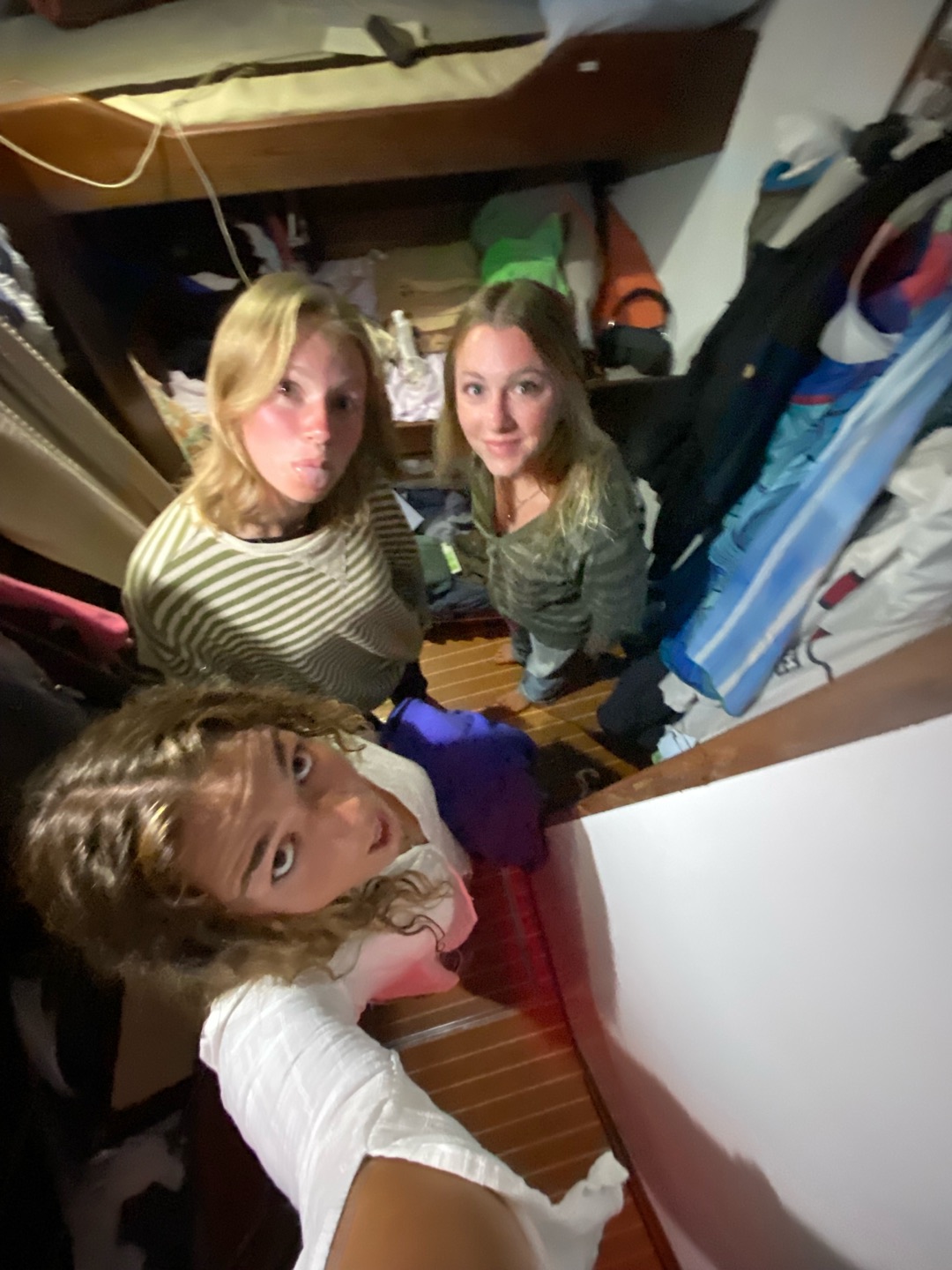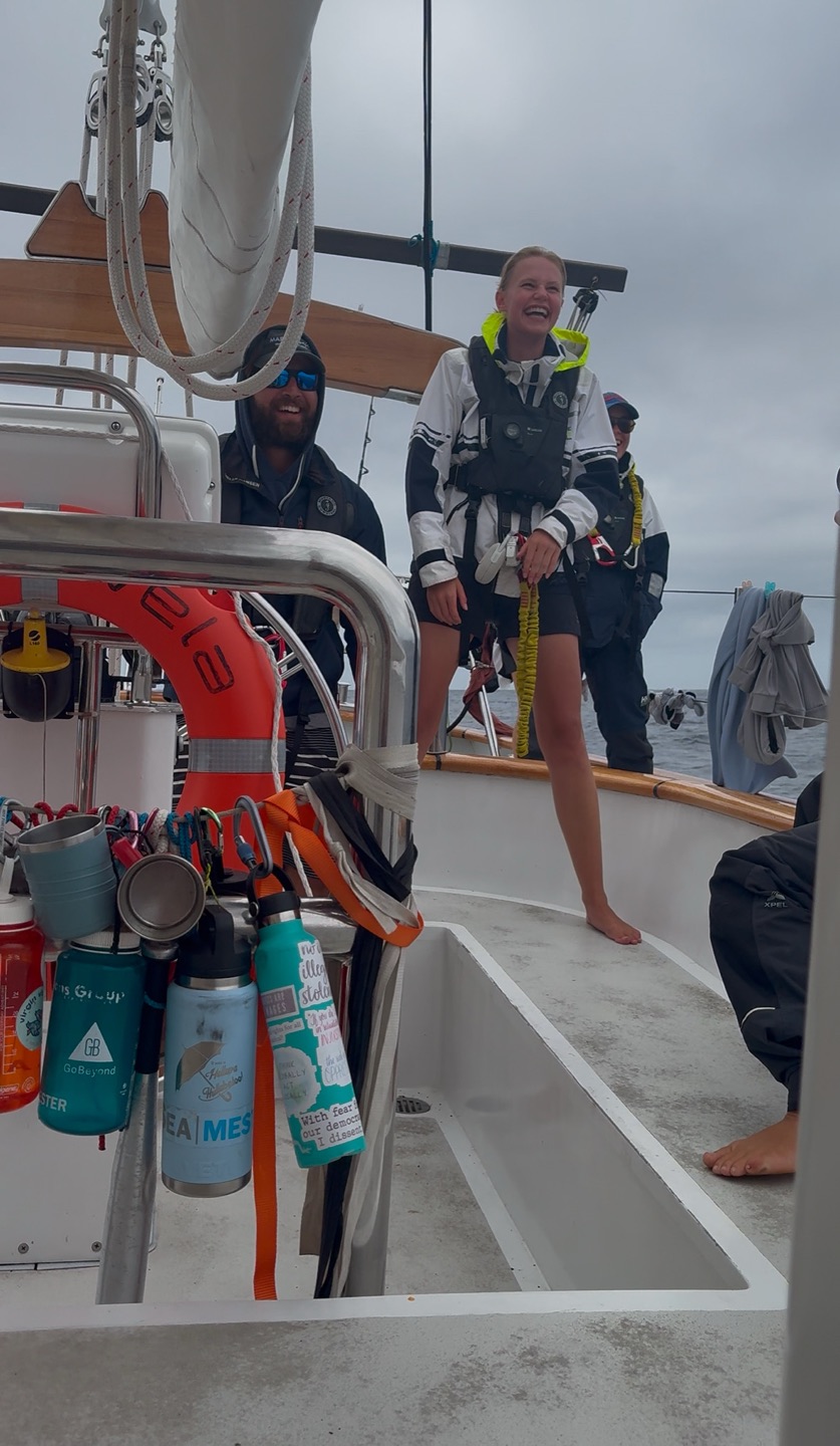 It’s 02:13, and Wiley woke me up as watch team leader of Watch Team One, so I crawled out of bed and suddenly Maia goes, “Vera, Vera, I need to get Adda a drying towel,” and I said, “Maia, what do you need?” She answered, “a drying towel…” So I told her, “You can go to sleep, Mai Mai,” and she just said, “Sleeeeeeeeeeeep.” Mac and I got up many more times that night. Fast forward to 05:22, when Zeke woke me up at the “Wake Mac and Vera” waypoint. I woke Fin, our chief mate, and we then spent two and a half hours doing sail handling. We had to remove the running backs, centerline the staysails, switch all the preventers to the other side, centerline the mainsail, and then we jibed! It was super exciting, since it’s actually the first time this voyage that we’ve changed sailing direction (either jibing or tacking).