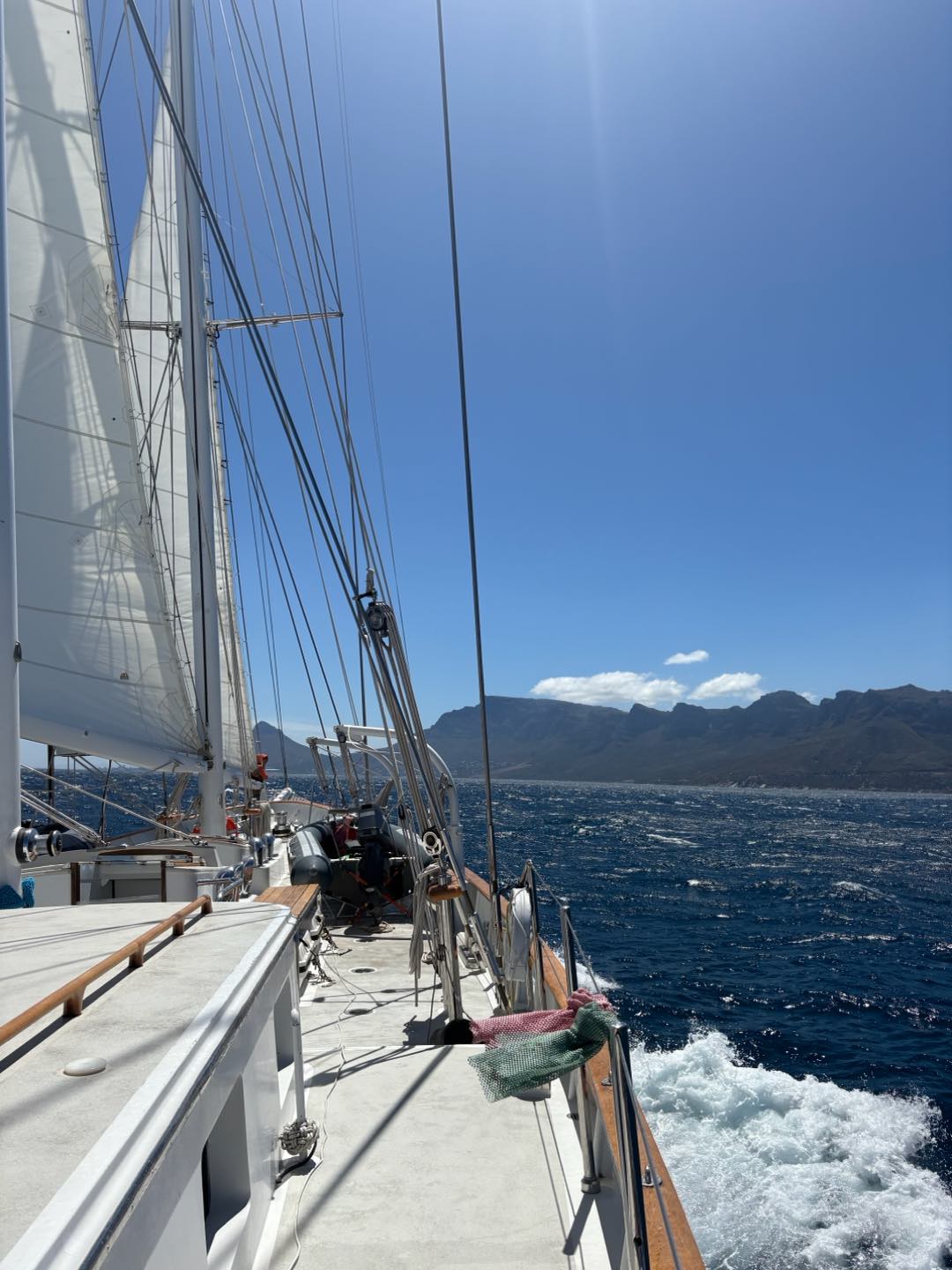 We then went back to bed, got woken up a few more times, and then Hannah woke me at our second “Wake Vera and Mac” waypoint. Sticking my head up through the companionway felt absolutely magical. Keith, Hannah, Maia, and Sam were all dancing along to music, sailing right next to Table Mountain in the beautiful morning sun. It was amazing to get some great sailing in during this passage, and that morning we were flying at around 9,3 knots! Mac and I spent some time planning, and around 11, we woke the entire crew for more sail handling and preparations for getting into the dock in Cape Town. We took the sails down, blew up fenders, and prepared dock lines. After that, we had a lovely lunch prepared by Payton, Thaxton, and Perry.