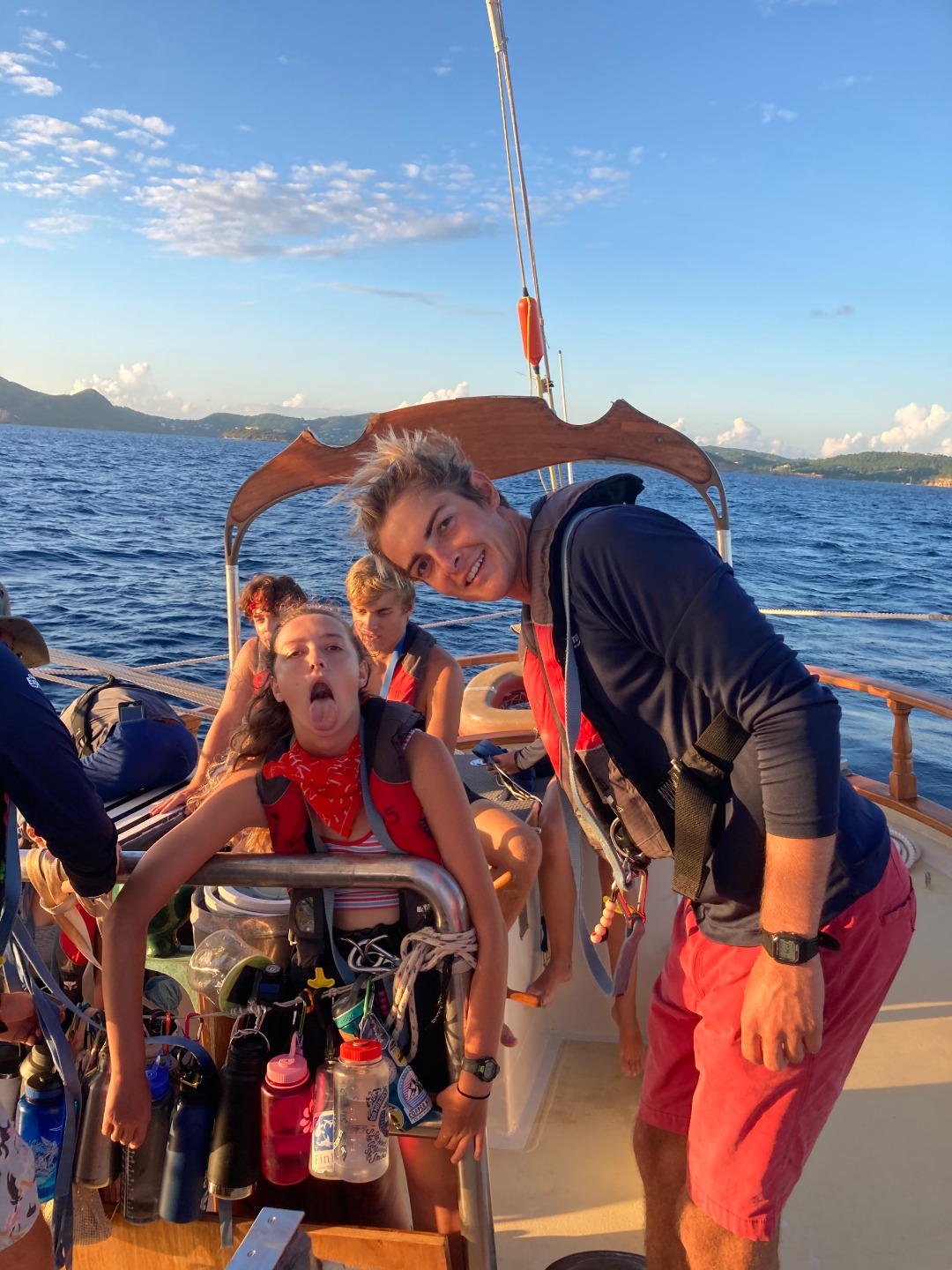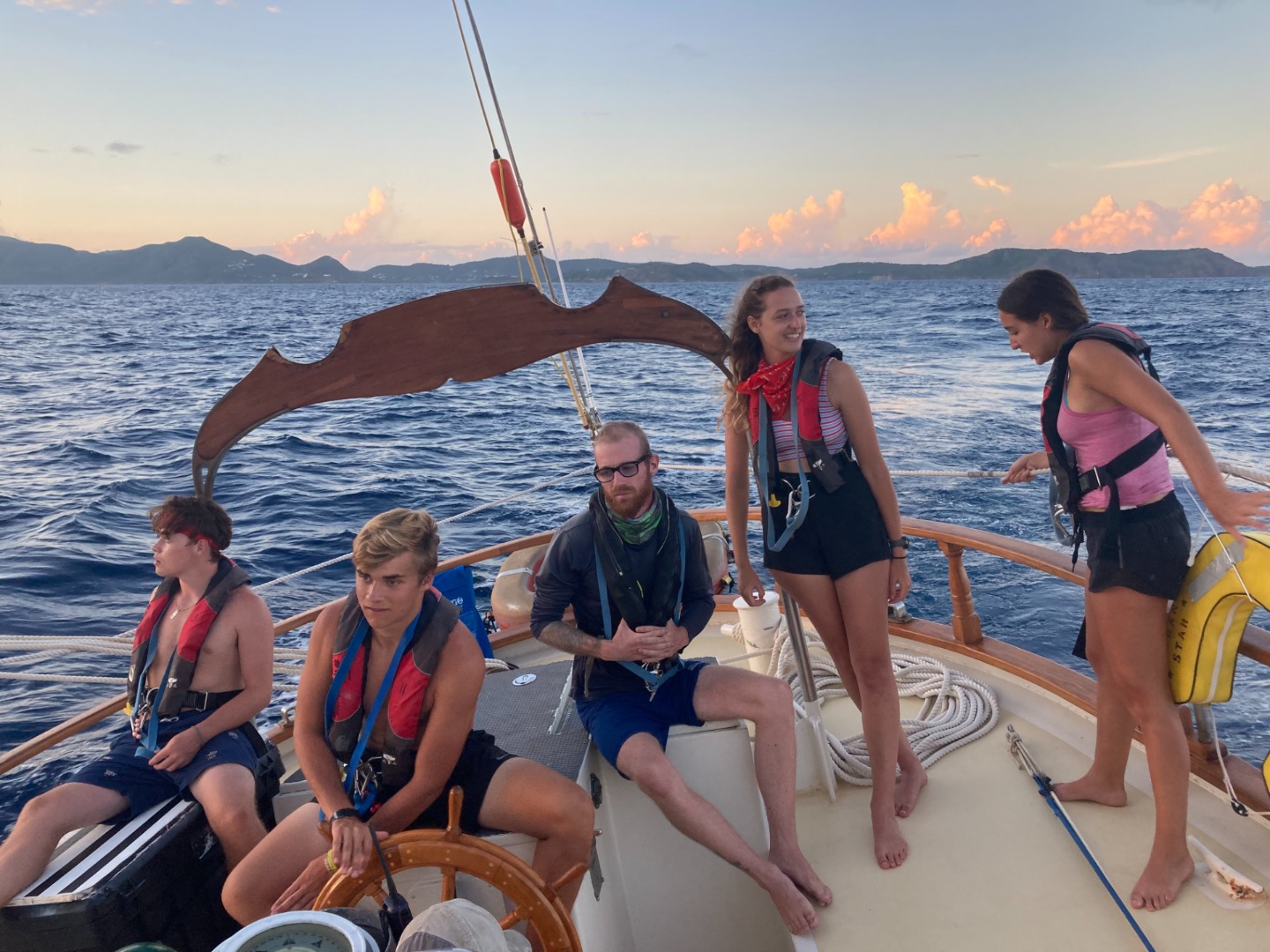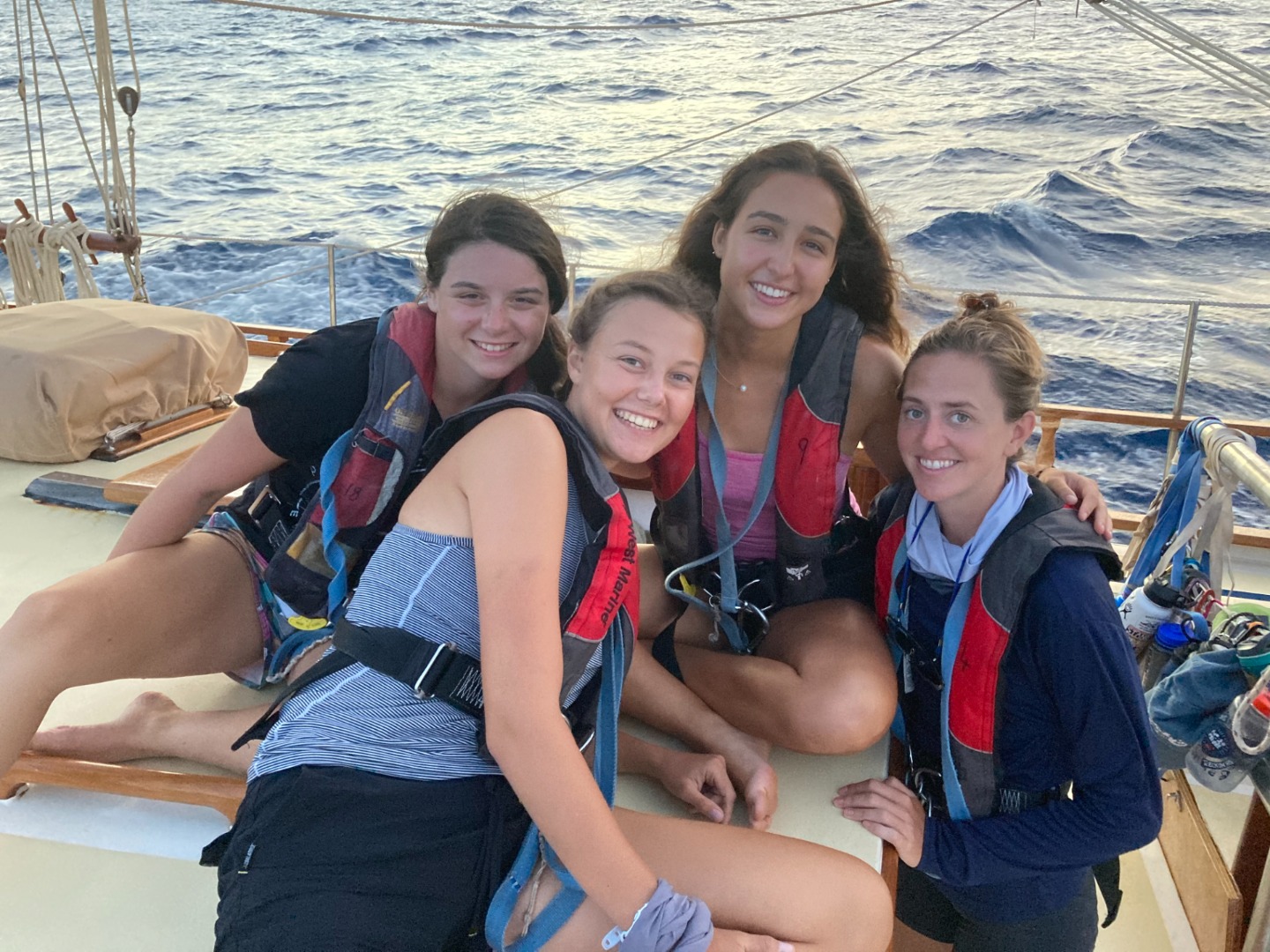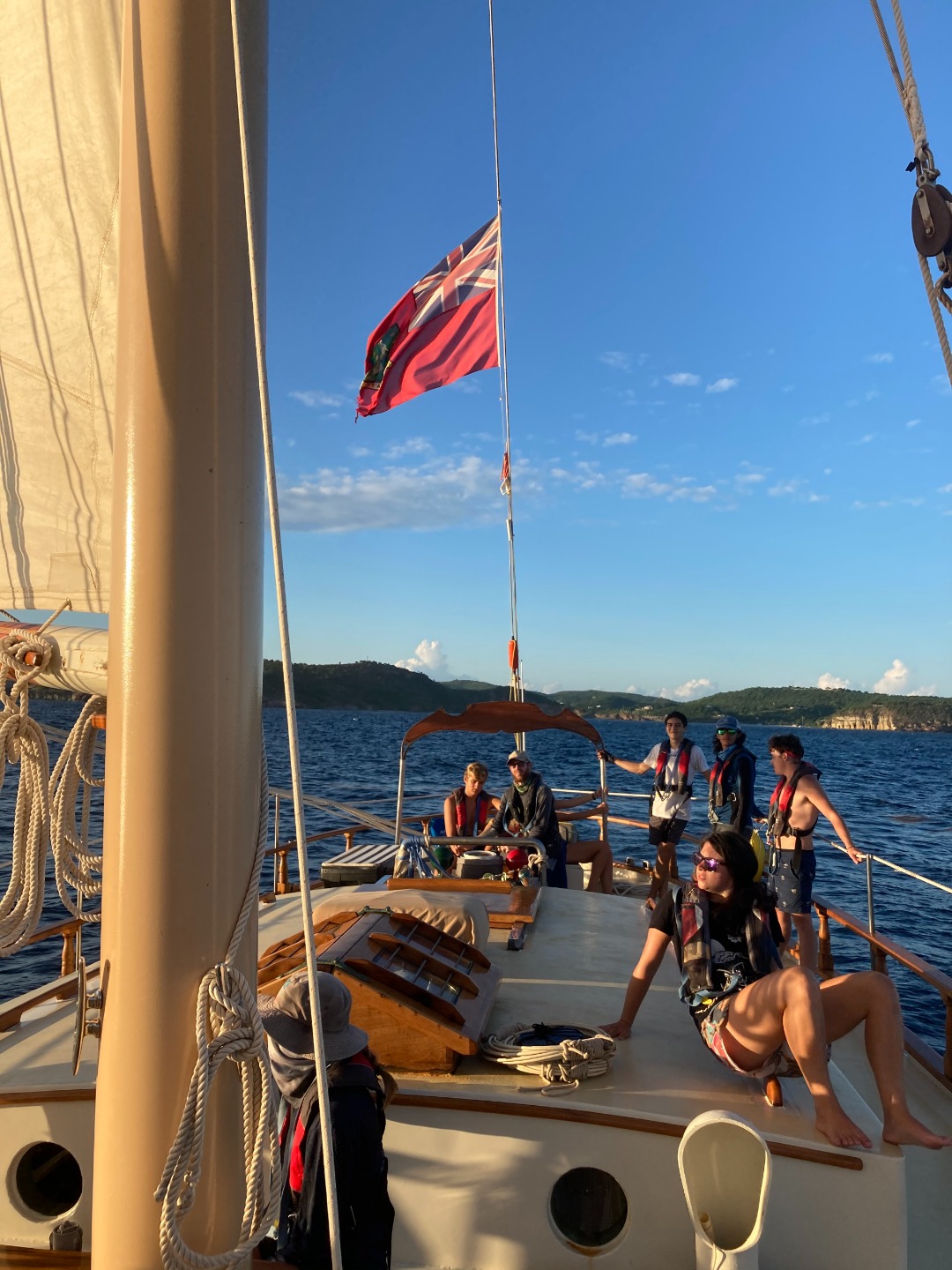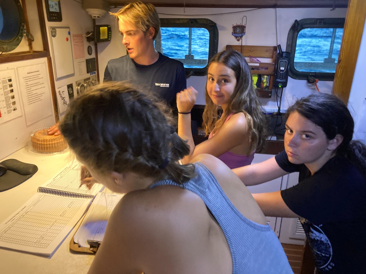 Sundown brought a sky full of stars and three very stressed-out chefs cooking chicken nuggets at a 45-degree tilt. It was quite clear head chef Lennox and her two Sous Chefs, Julia, and Pearse were working hard to produce what turned out to be a delicious meal by the devoted screams radiating from the hatchet above the galley. The meal concluded with pondering preferred tree species and the division of watch teams. These three teams take turns (3 hours on, 6 hours off) keeping an eye on all the parts necessary to call Ocean Star our home away from home. Watch team one (Isabel L., Zac, Lennox, Ben, and Ruth-Riley with Ash and Calum) assembled in the cockpit at 9 to begin 3 hours of watch. Ben and Lennox looked over the bow while Zac, RR, and Isabel L. took turns taking the helm and conducting thorough boat checks every hour. All the while, the remaining crew slept soundly in their bunks after an exciting day, prior to being woken up by their peers to a riveting 3-hour watch of their own.