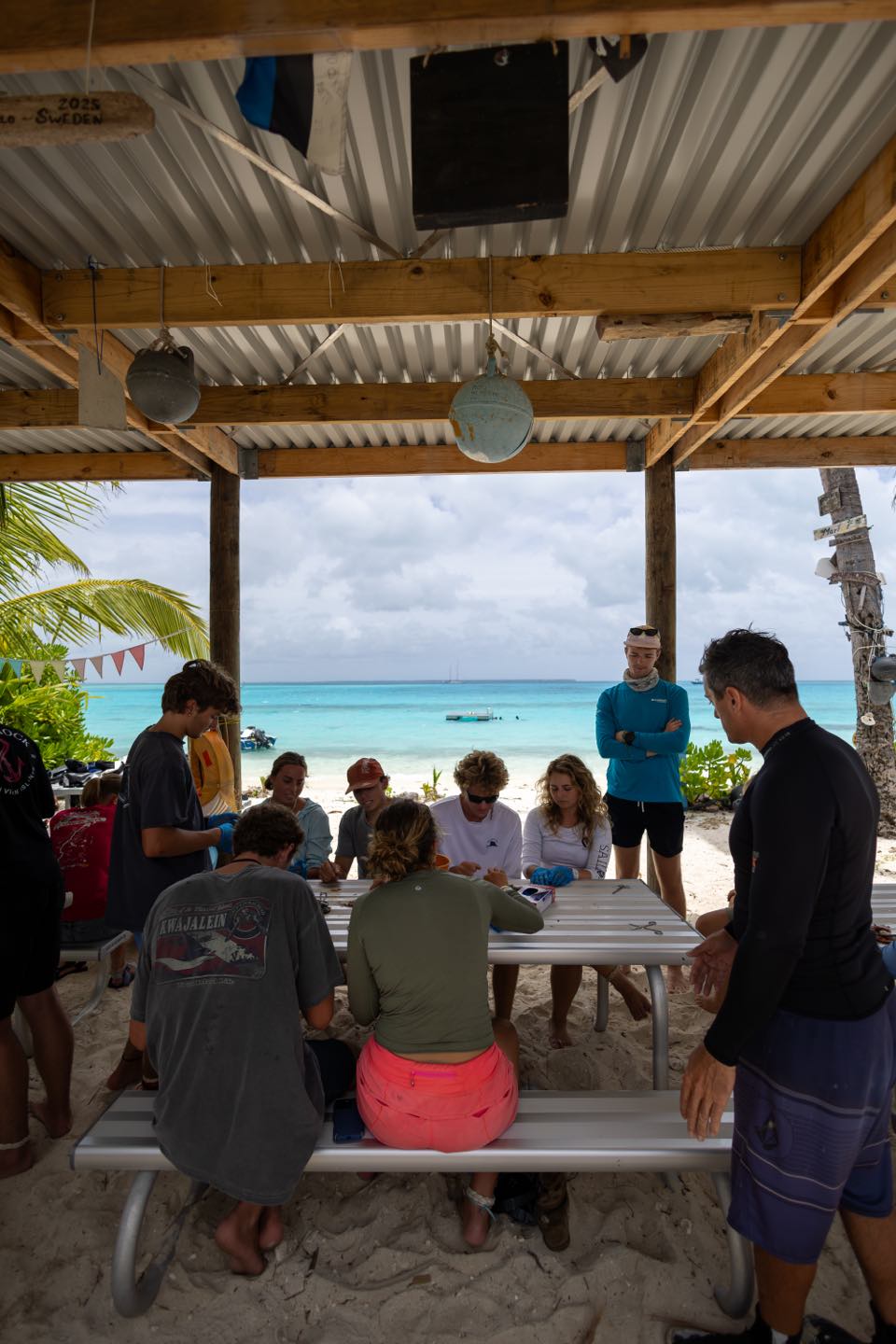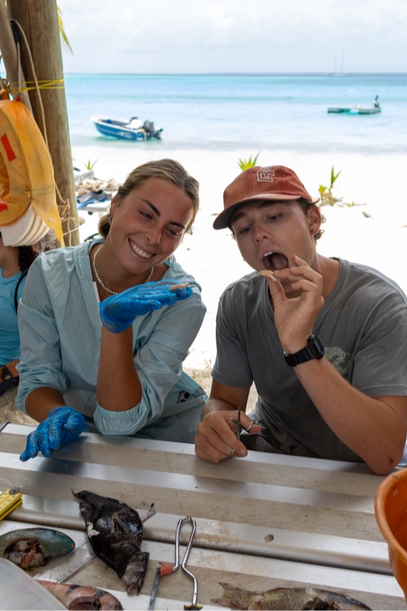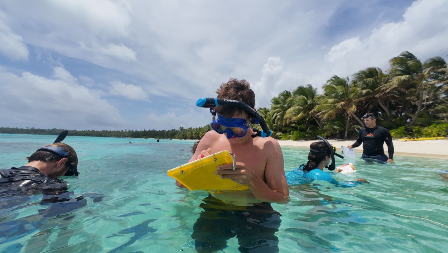 And we woke up early this morning, excited to see even more marine life! Today we had a science class-ish planned with scientist Jean Paul Hobs. But first, we had a delicious breakfast of bread pudding/French toast that really started the day off on a sweet note. Then we got our snorkel gear ready and got everyone on the shore of Direction Island to meet up with JP. We all gathered around some picnic tables and listened as JP shared his extensive knowledge on the history of Cocos Keeling, the formation of its reefs, the unique wildlife, and more! He also brought little pools with samples of live corals, crabs, and mollusks to show us as he taught. After this, we went right into fish dissections. JP brought a bucket with some of the common fish found in the reefs here, and we dissected them right there! We each found the eggs, hearts, liver, and digestive tract of our fish. Then we broke open the skull the see the brain and ear stones! It’s definitely not for everyone, but we all found it super interesting and super smelly. Apparently, Zeke is the fastest fish ear stone finder JP has ever seen! Good skill to have. After the dissections, we went right into snorkeling. We identified and counted types of coral and creatures in certain plots of reef, and it was cool to see how researchers like JP go out and record information right from the reef. After this, we all said our thank yous and goodbyes to JP and made our way back to Vela. We got back and rinsed off for lunch with incredible speed, so ready for the paninis that we’re waiting for us! We thoroughly enjoyed lunch and went right into a marine bio class. We talked about worms and mollusks in class today, and then I hit the hay after class was over. My power nap was a bit longer than expected, but as I was asleep, everyone else rested up or worked on homework, and Vera got her Open Water Dive Cert! I woke up and knocked out some homework, took an ocean shower, and went right into dinner. Keith, Scarlette, and Zeke made steak fried rice, and it was soooo good. For squeeze, my question was “If the person to your left was best friends with a celebrity or TV character, who would they be besties with?” and it was hilarious seeing what popped into people’s minds. Henry said I would be friends with Jennifer Lawrence, which is my new favorite compliment. And finally, it’s now after dinner, and all the students are gathered in the salon. We are all getting some homework done and singing along to some tunes as Scarlette makes cookies and Henry frantically fans the smoke detector to keep it from going off. So tonight will be a night of snickerdoodle cookies and hopefully another manta ray on anchor watch! I can’t believe this is real life!