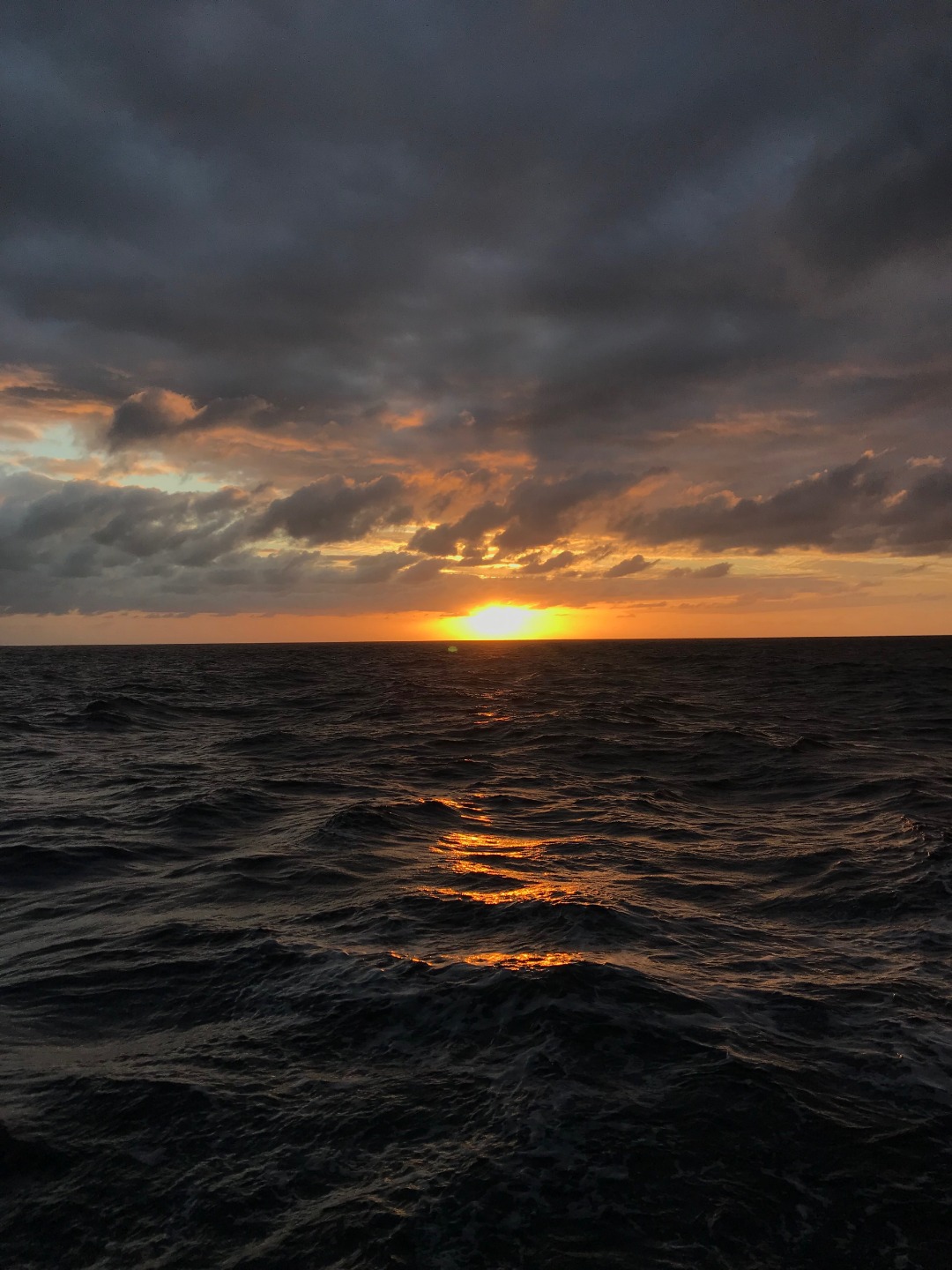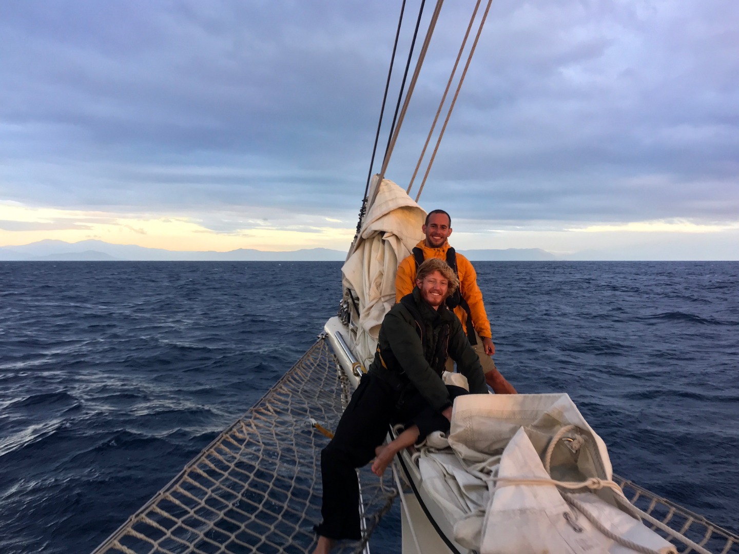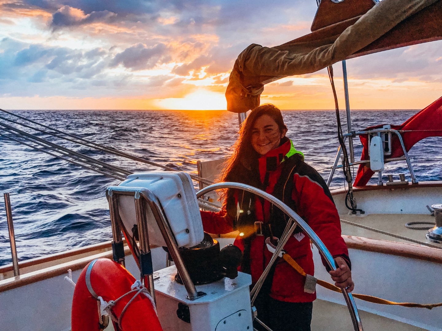 Pictured: Emily at the helm with the sunrise, Raul and Frank on the bowsprit taking down the jib, Sunrise, Sunrise with the Argo ensign, and Sunset in Cairns, Australia.
