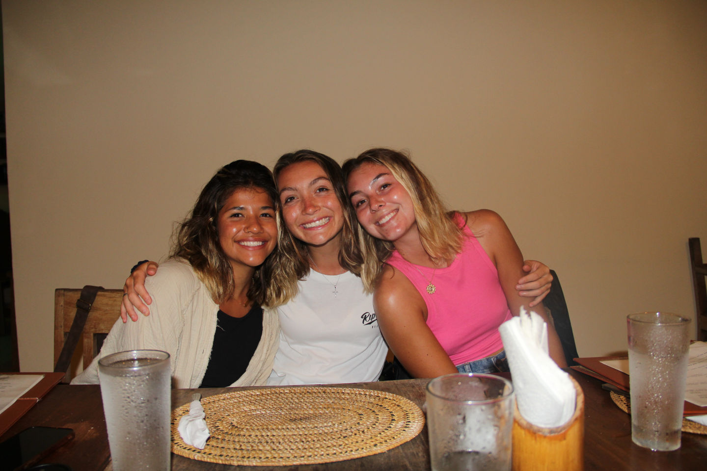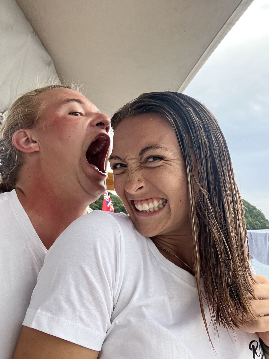 Today was quite a long day as we all waited in anticipation to scream “Land Ho” and feel still ground beneath our feet again. We first spotted land late last night but waited until the day to enter the barrier reef because there was a narrow channel that we had to pass through. As customs came to clear us in and we waited for an update on where to anchor, it was everyone’s favorite, Boat Appreciation Day !!! This is when we all do a super deep clean of the boat, but this time, after a solid three days of rain and three weeks of open ocean, the boat had kinda turned into a gremlin dungeon and required a super DUPER extra special, ridiculously unbelievable deep clean. This was also in preparation for our TWO new students who will join us tomorrow!!! If they had seen this boat a day earlier, they probably would have gotten back on the plane, but thanks to everyone being willing to get gross and grimy, this boat is sparkly clean, just like it was for us when we first arrived. First, we de-passage prepped (I got to take the halliards down, which required a bit of monkeying around, so I was in my element) while some people began to clean out their cabins. Then, Dray and I were assigned the most dignifying job of cleaning out the gray water tank, and let me tell ya, it’s waaaaaayyyyy worse than any of you are imagining right now. I discovered true bio genies ooze with a bio content much greater than 30%. Haha, okay, it wasn’t tooooo bad.um, but everyone did a great job today buffin’ out the grime. Once we were finally wrapping things up, I asked Smash if we could go on land tomorrow as I was sooo anxious to get a hold of all you people back home, as everyone else on the boat was too, when she informed me that we HAD A NIGHT OUT THAT NIGHT !! This news was so good that I almost cried on the spot and ran on deck to spread the news. Then, the rain visited us again, so Dray, Heloise, and I played hot potato well, more like a wet potato to get all the potatoes back in the bucket. Being soaked in potato juice and who knows what else, we jumped in the turquoise waters below us for an ocean shower in the rain. Swimming in the ocean is almost always unbelievable, but the moment of floating atop the 80, dense seawater in a light drizzle of rain is something I wish I could have shared with everyone I love. After the rain stopped, the dingy lines turned into a makeshift American Ninja Warrior setup, and a bunch of us embraced our inner Tarzan. Then, after we were somewhat dry, we got ready for shore, changed back our clocks, then waited for the water taxi to pick us up from Vela. Oh, and I evened out my haircut, but Justin did not make it easy. The water taxi was soooo fast, and the driver was super cool. We ate at a place called Kramer’s in northern Palau, and the couple who owned the place was sooo sweet and patient with our huge mess of a group. The food was to die for (for real, Sydney almost had a heart attack when they announced that they had one singular chocolate lava cake left), and I had never heard so much laughter or seen so many smiles on everyone’s faces as I did tonight. Most of us also were able to connect to a bit of wifi or turn on data to make a phone call or two home which puts everyone’s minds so much more at ease. At least, it did for me.