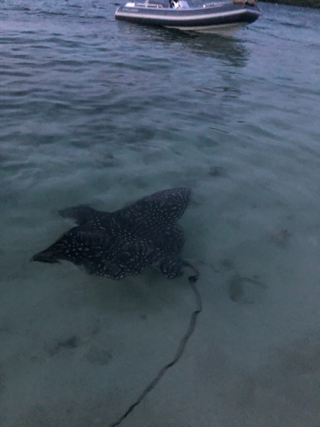 The BBQ was fantastic – we had an absolute feast, complete with fresh lobster and sweet plantains. Then we got to hang out with the local Spotted Eagle Rays and Balloon fish. Yeah, it was pretty epic.
