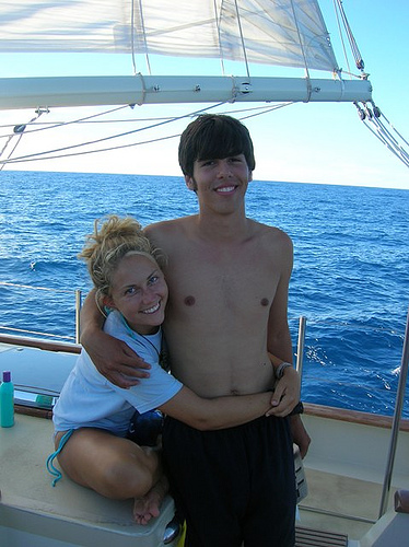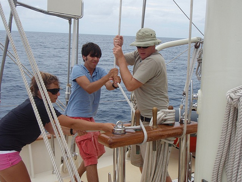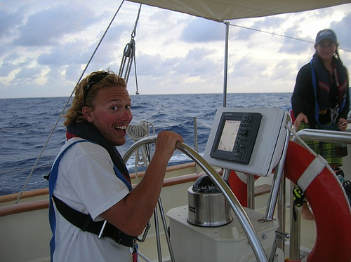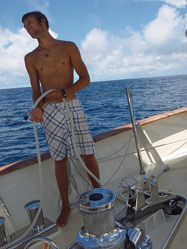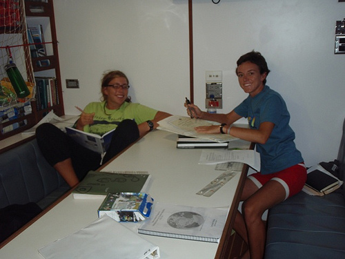 As the sun rose this morning, the sky cleared, giving way to soft blue and fluffy white clouds. Expectations were high because we were supposed to hit the trade winds; we were all very anxious to turn off the motor and set the sails. As the morning progressed, the breeze picked up, and so did our spirits. By lunchtime, we were under sail, cruising along at a solid pace. During MTE and PSCT, we learned about VHF radio operation and, of course, went over class time with Boomer once again. After class, we hung out in the chart house and in the cockpit, doing crossword puzzles and talking. At some point around dinner, we realized that what we thought were the trade winds were nothing more than a fleeting breeze; we still had a few more degrees of latitude to go before we hit the true winds. But the squeeze was fun, and the sunset was beautiful, so the day ended as well as it began.