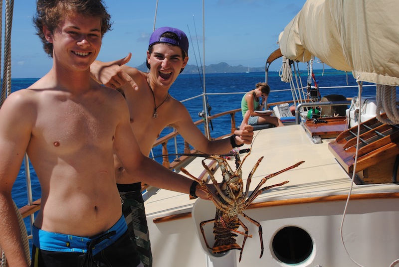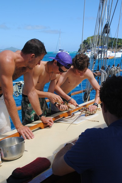 We, yet again, had another fantastic day here on Ocean Star under the warm Tobago Cays sun. We started the morning with a leadership class (SLD), where we furthered our knowledge and understanding of how to not only be an effective leader but how to be the best ‘tribesmen’ we can be! After class, we had free time, which some spent feverishly writing their scientific papers for Marine Biology (due by dinner time), while others enjoyed the sun and water. Brandon, Boots, and Jon were on a mission for some fresh Caribbean lobster. After some debating and price negotiating, they landed themselves two delicious lobsters, which they learned how to properly kill, prepare, and cook for lunch. We started our afternoon with a Seamanship course (MTE), where we learned everything there is to know about sailing and all the ins and outs of Ocean Star from our knowledgeable instructors, Captain Jack Walter Pincus and First Mate Matthew Clark Roberts. We later decided to venture out to Jack Sparrow Island, where a scene from the first Pirates of the Caribbean movie was filmed. We enjoyed exploring the island, drinking coconuts, taking pictures, and goofing around in the sand. While walking along the beach, we came across a pink and purple balloon-looking toy that Shea almost picked up. Still, thank goodness common sense washed over her before she did because we later found out it was a Portuguese Manowar, an extremely toxic jellyfish. Fortunately for us, the fun and excitement didn’t end there; after dinner, we all put our wet suits on and went on an epic night snorkel, looking for nocturnal marine animals and exploring the beautiful coral reefs. It was agreed upon by all that it was one of the coolest things we have ever done and something we definitely intend on doing again, and we all hope to see some octopus in the future!