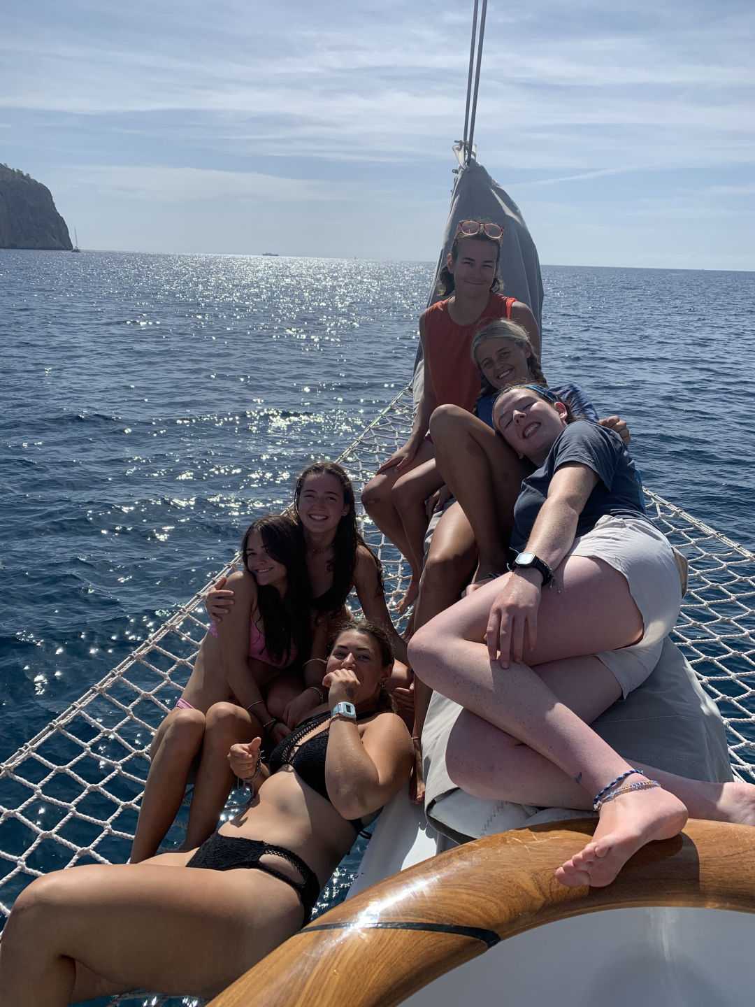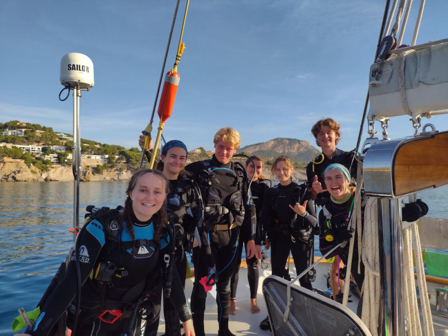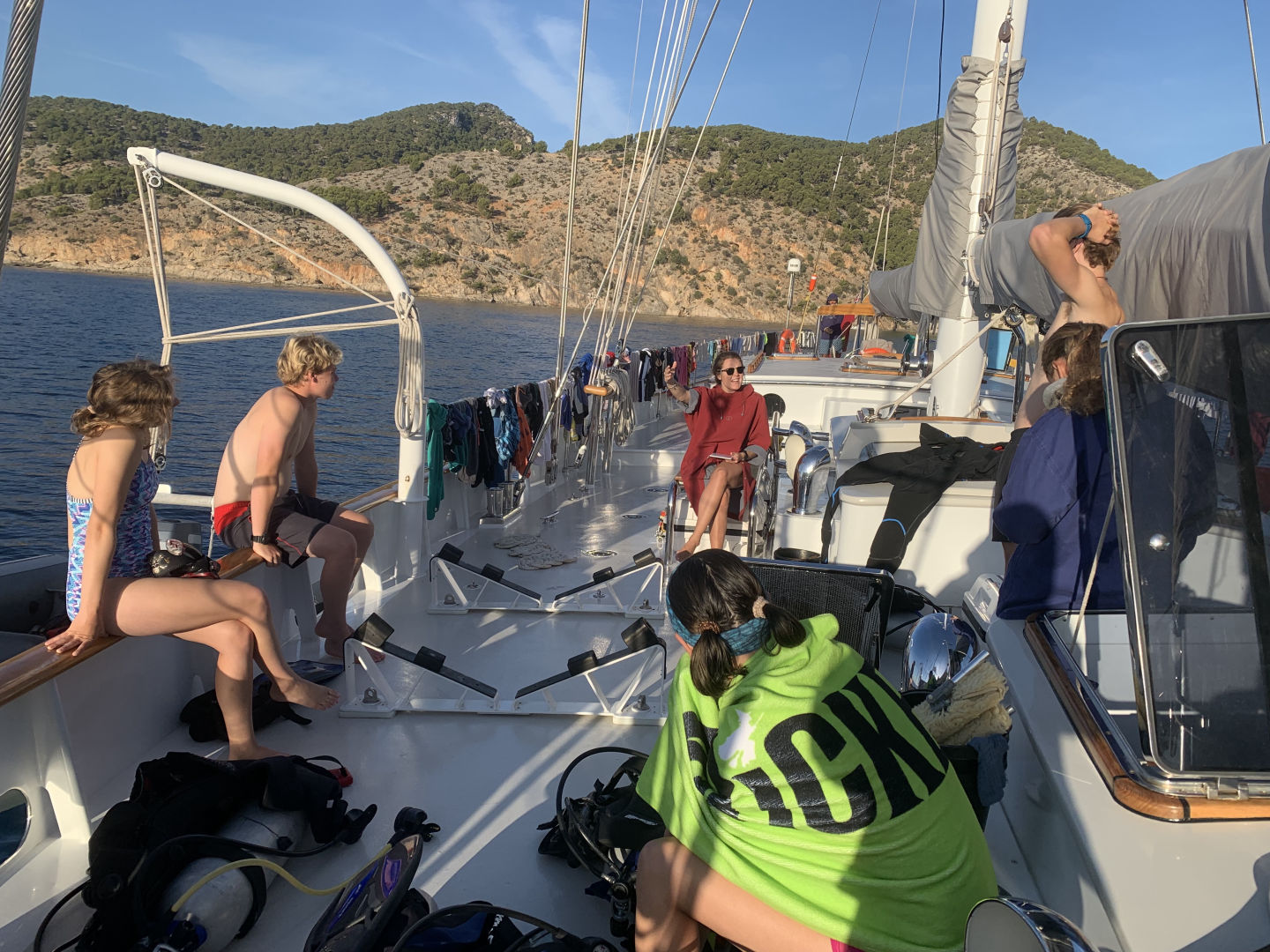 After a lovely cleanup last night where Matt was absolutely obliterated by the hose straight to the eyes (don’t worry, it was payback), the crew of Vela slept soundly on our first night in Mallorca. I got an extra early start along with Rachel and Carolyn to hop in the water for a moonlit morning dive. We turned off our lights and wiggled around to activate the bioluminescent algae, which reminded me of thousands of mini glow sticks floating around at my fingertips. We surfaced just as the sun was rising and were greeted by the crew waking up for breakfast. A huge shoutout to Ghost, who took over my skipper duties while I was diving and personally woke each crew member. The reaction to her wakeups had a wide range, to say the least. Alison said that she had never been more creeped out in her life, but Isabelle said that it was the perfect start to her day and put her in a great mood.