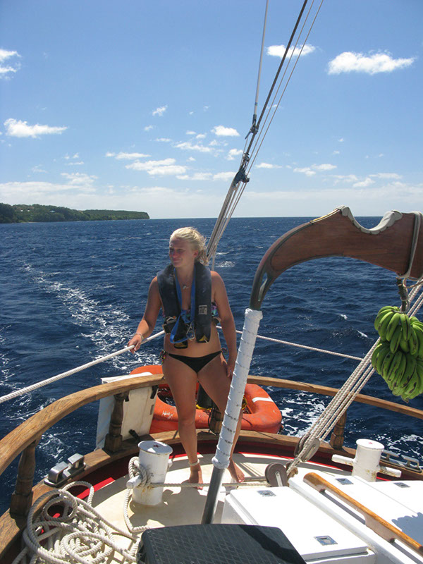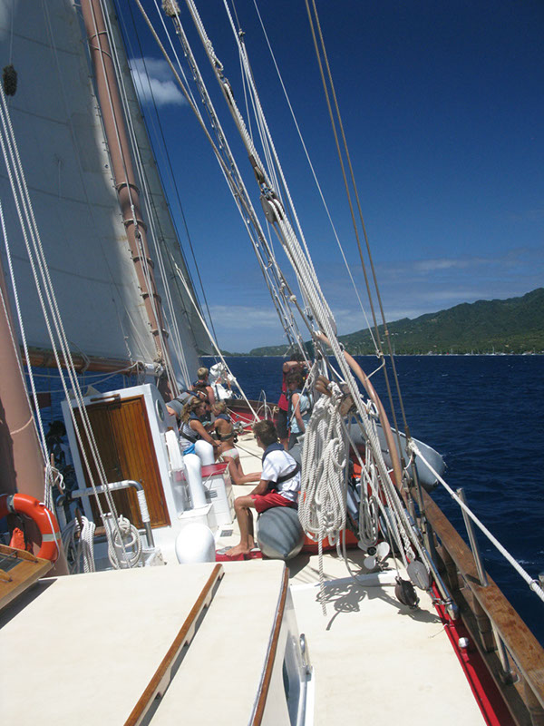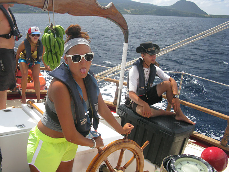 This morning we awoke to delicious crepes made by Stephanie and Sam in honor of our sail to Les Saintes today. After breakfast and clean up we had a quick MTE class about running fixes, which is as confusing as it sounds. We then split up into our watch teams and put the sails up. My watch team, watch team one, raised the mainsail in record time- congrats to us. We put a reef in the main and foresails and were going about 7 1/2 knots, which made for an awesome sail. During the sail, Alex and I had a mini dance party at the bow. It was quite intense. We also saw dolphins, which is always exciting! I took the helm and sailed us into Les Saintes. It was a little difficult because of the shifty wind, but it was still a lot of fun. Once we anchored, Eric went in and cleared customs while the rest of us started a BA. Worms, Big Mac, Jack Attack, and I were group deck wash – it started out fine and dandy until Ryan decided to put a little too much soap on the deck and made my job as spraying a little difficult. After the BA, we took showers and cleaned all the grim off us. We then had dinner and an OCB class where we learned about sea turtles. After class, we did our own thing- some hit the sack, some played Bananagrams, and some played with Jack’s iPhone and looked at all the different constellations in the sky. Overall it was another amazing day on Oceanstar.