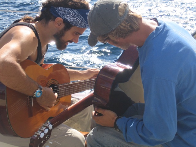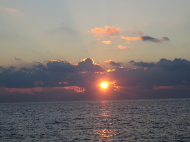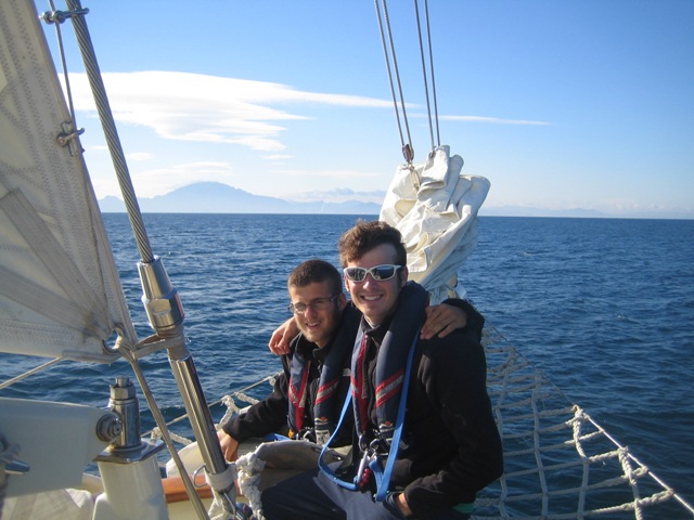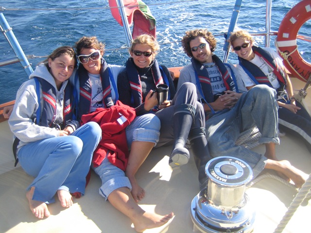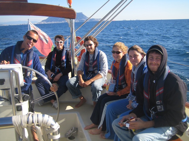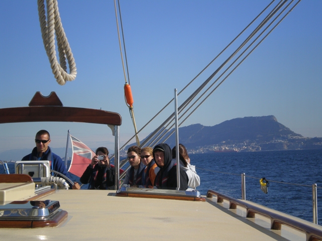 We began the day with a quick fuel-up and then set out to the straits of Gibraltar. Everyone was excited to pull out into the Med and see Europe to our starboard, Africa to port, and the Atlantic dead ahead. After an energetic, all-hands effort to raise the sails, watch two carried us through the straits with some musical entertainment from Matt and Simon, which was only interrupted by swarms of flying ants overtaking the deck as we crossed into the ocean around lunchtime. Not to worry, our fearless bosun Dan and his deckies fixed the problem (after I squished most of them with my boots). Our first activity on the ocean was an MTE class on tides, which was most appropriate as we just started experiencing these in Gibraltar, and then an OCE class. Mani and I saw a large sea turtle waving us hello as we came around the coast of Morocco. Kevin made us a delicious dinner of spaghetti and meatballs, which was followed by a simultaneous and heavenly sunset and moonrise. Spirits are high in the salon. Everyone is very excited to get to Africa and work on OCE projects. Watch one has just taken over for a beautiful, moonlit 9-12 pm watch to carry us into tomorrow.
