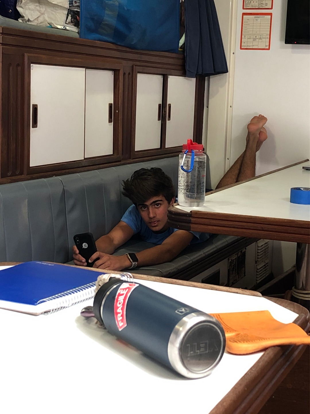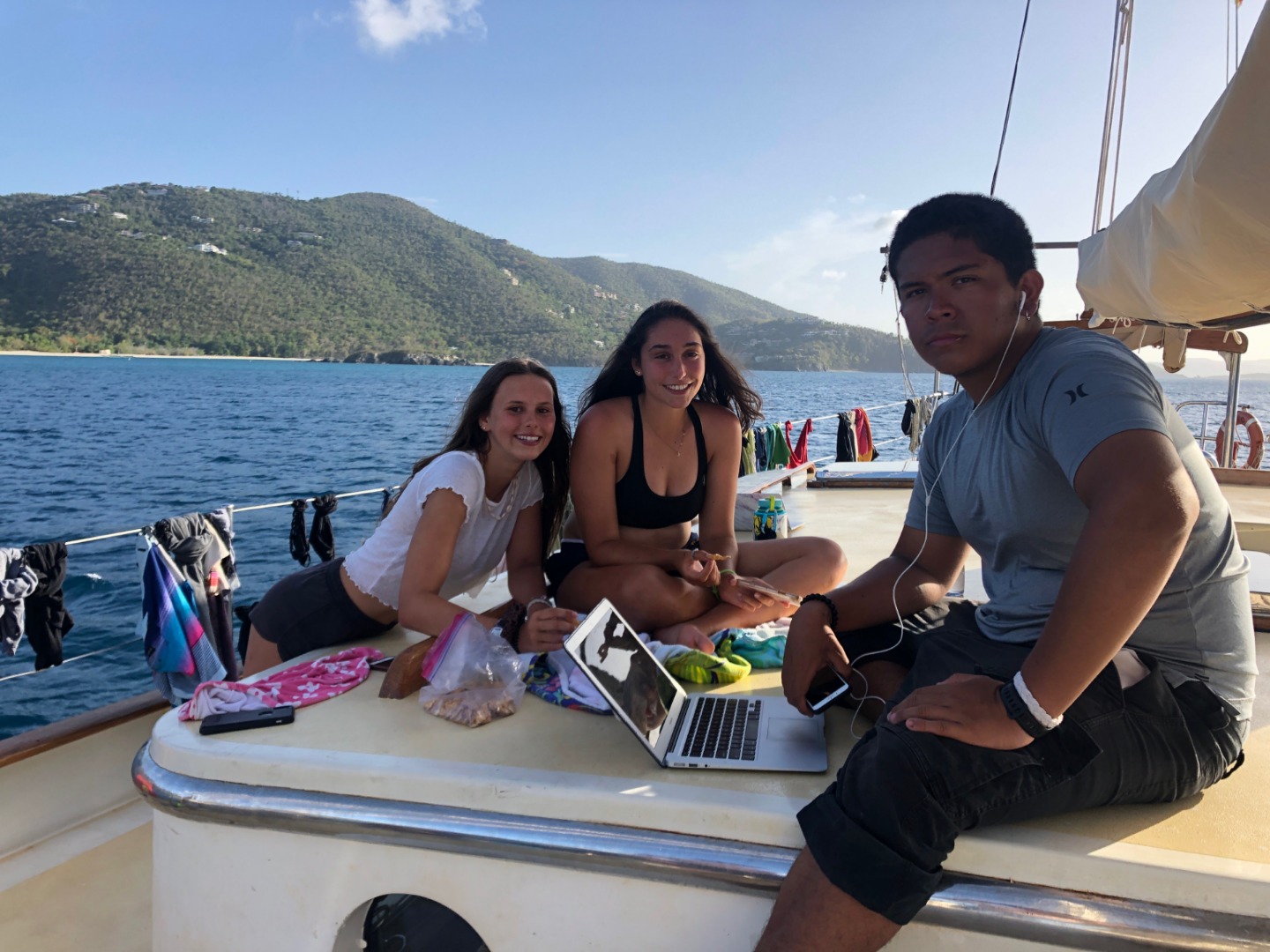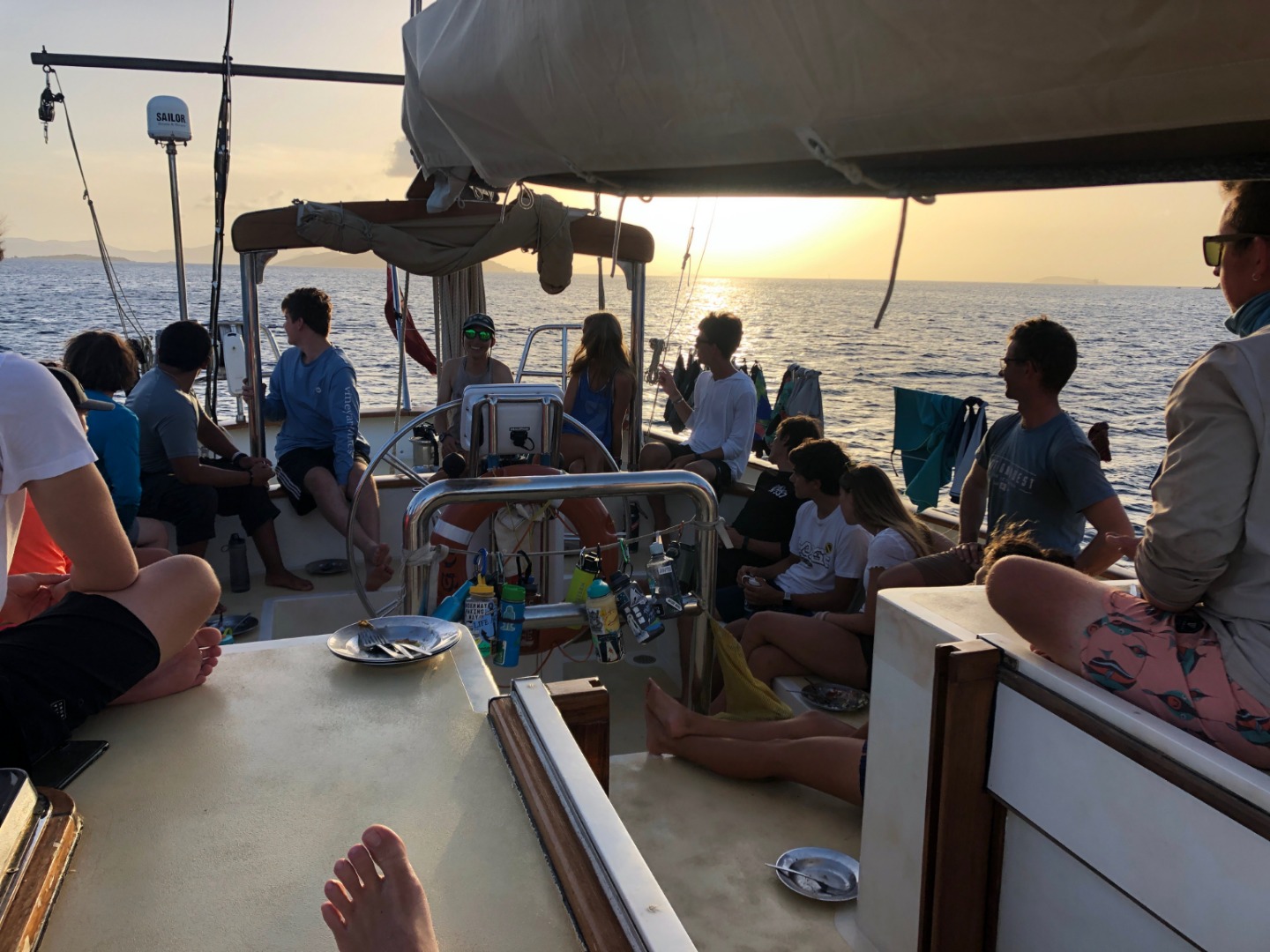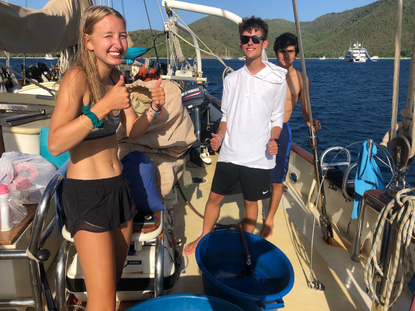 This morning I thought about waking everyone up with the dinner bell again, but I decided not to. For breakfast, Will tried to make french toast, but it fermented overnight and turned into a dough monster. So instead, we had pancakes. Will decided that he was going to use his own special recipe that he just made up this morning. They also made some crapes and normal pancakes, but the special ones kind of turned out like civil war stone biscuits, but they were really good, and I could keep them in my pocket all day for little snacks. After breakfast, we motored over to a rock for diving. After diving, we had some nice tasting tacos for lunch that were even better than civil war stone biscuits. While everyone went on a second dive, I stayed back with a couple of people and hung out in the saloon. Then all of a sudden, it was shower time, and the companionway decided it didn’t like me anymore, so it scraped my knee on my way up for showers. For dinner, we had twice-baked potatoes with cheese. Halfway through our squeeze, Evan’s parents came by and said hi from their dinghy for about 30 seconds. It was nice to have insight into his family circle. Now everyone is cleaning up and doing boat chores while I’m writing this, and then we are going to analyze the leadership in Madagascar 2, and then it’s sleep time.