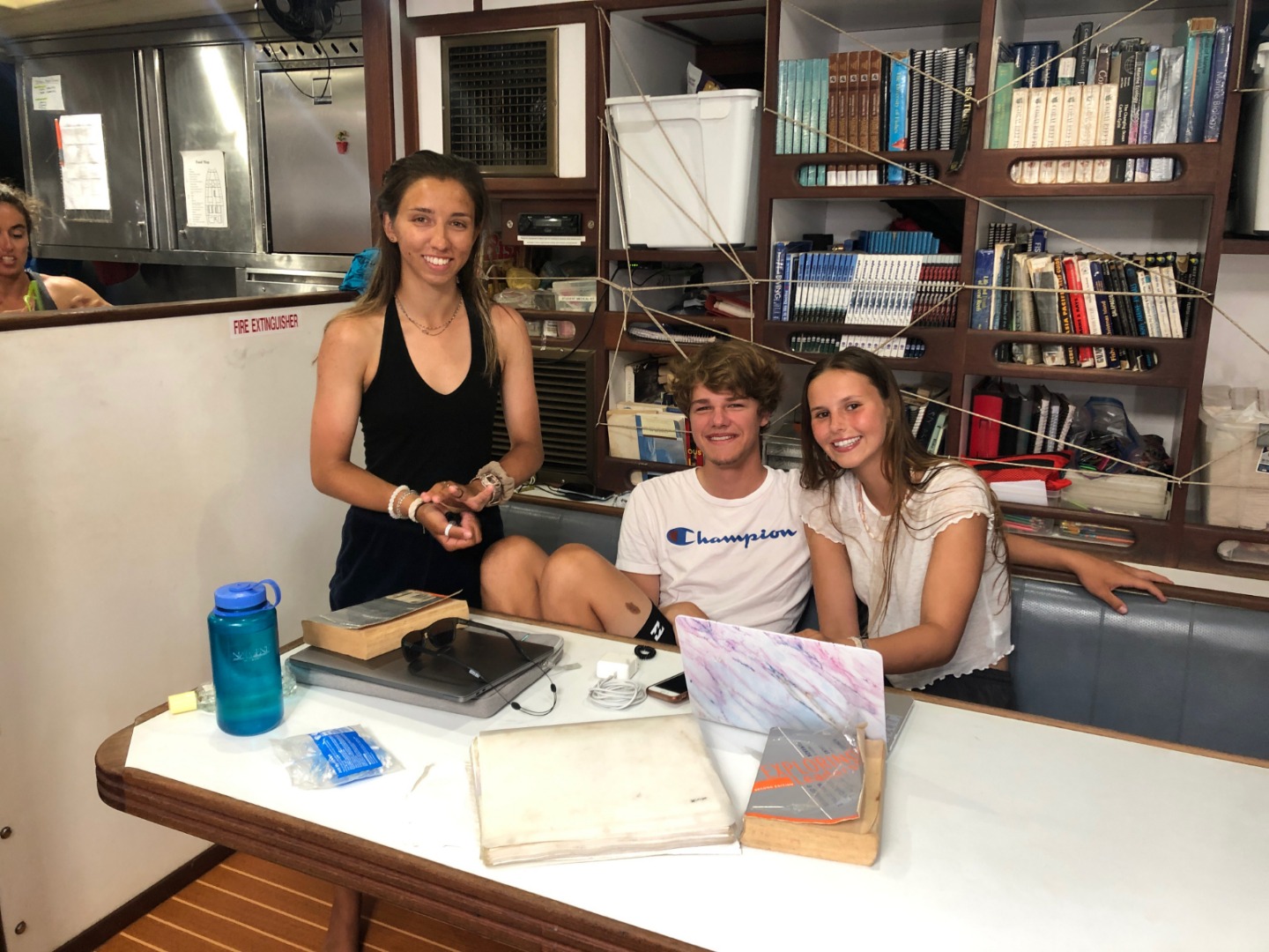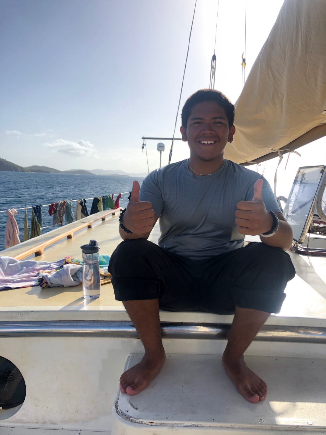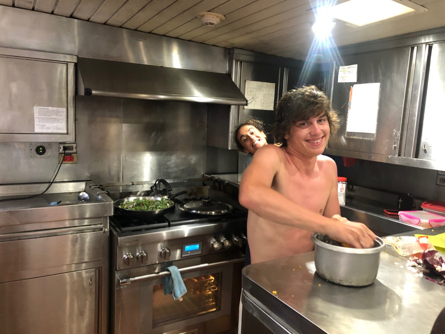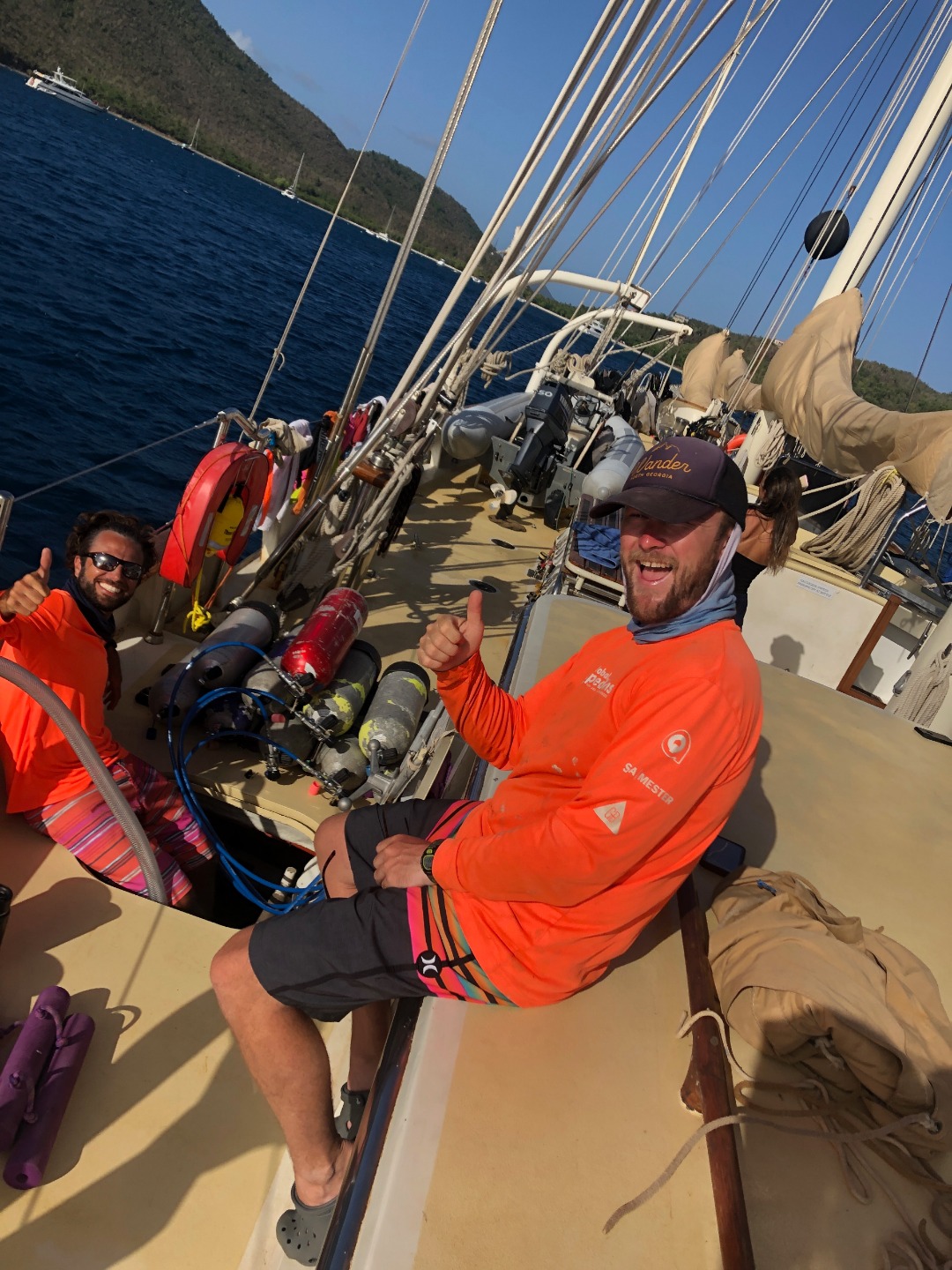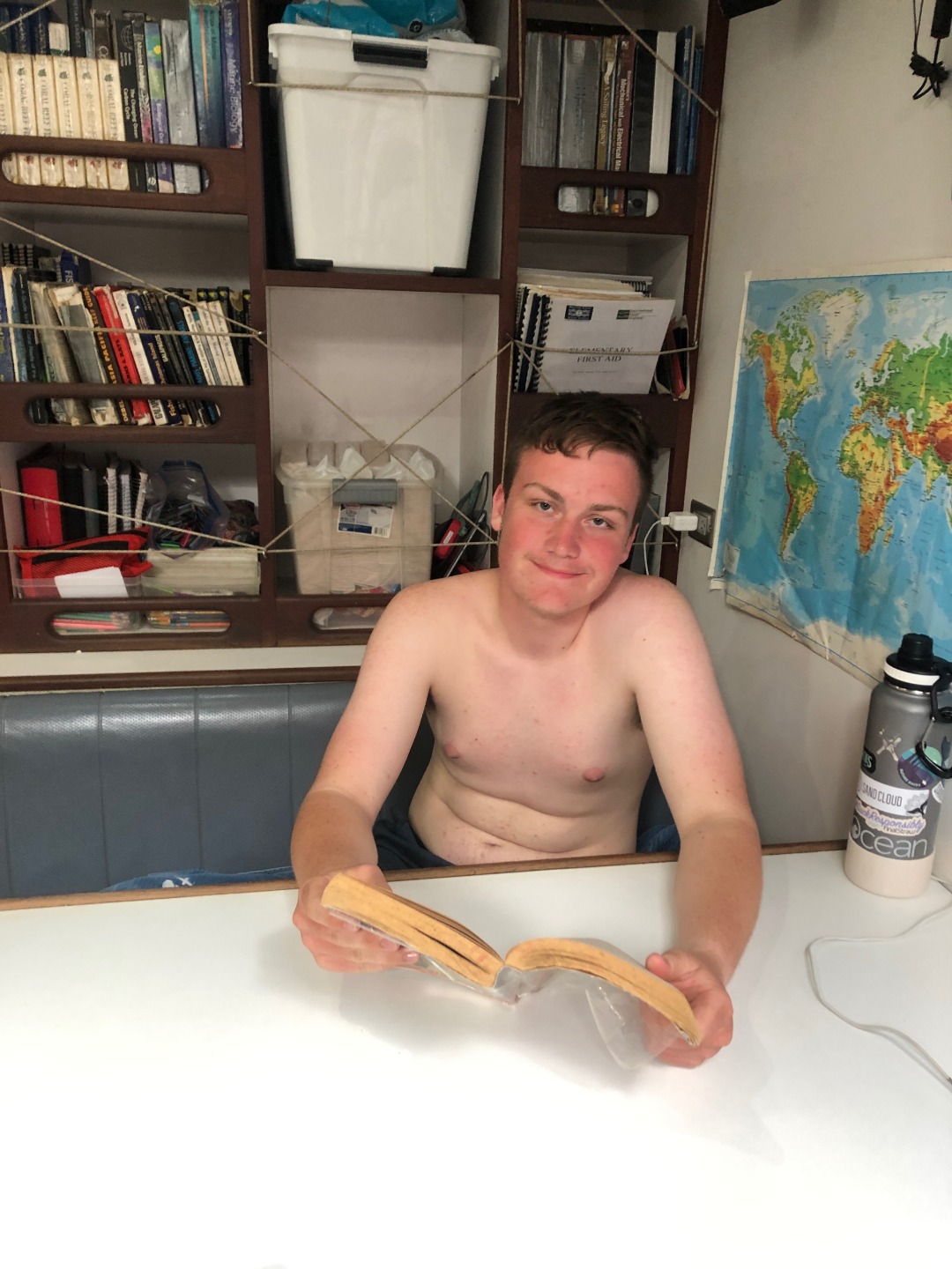 This morning I thought about waking everyone up with the dinner bell again, but I decided not to. For breakfast, Will tried to make french toast, but it fermented overnight and turned into a dough monster. So instead, we had pancakes. Will decided that he was going to use his own special recipe that he just made up this morning. They also made some crapes and normal pancakes, but the special ones kind of turned out like civil war stone biscuits, but they were really good, and I could keep them in my pocket all day for little snacks. After breakfast, we motored over to a rock for diving. After diving, we had some nice tasting tacos for lunch that were even better than civil war stone biscuits. While everyone went on a second dive, I stayed back with a couple of people and hung out in the saloon. Then all of a sudden, it was shower time, and the companionway decided it didn’t like me anymore, so it scraped my knee on my way up for showers. For dinner, we had twice-baked potatoes with cheese. Halfway through our squeeze, Evan’s parents came by and said hi from their dinghy for about 30 seconds. It was nice to have insight into his family circle. Now everyone is cleaning up and doing boat chores while I’m writing this, and then we are going to analyze the leadership in Madagascar 2, and then it’s sleep time.
