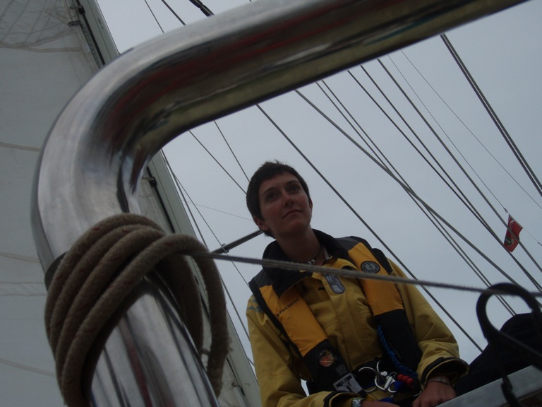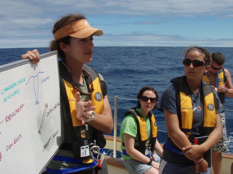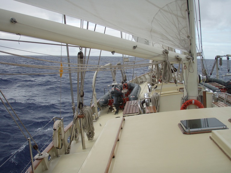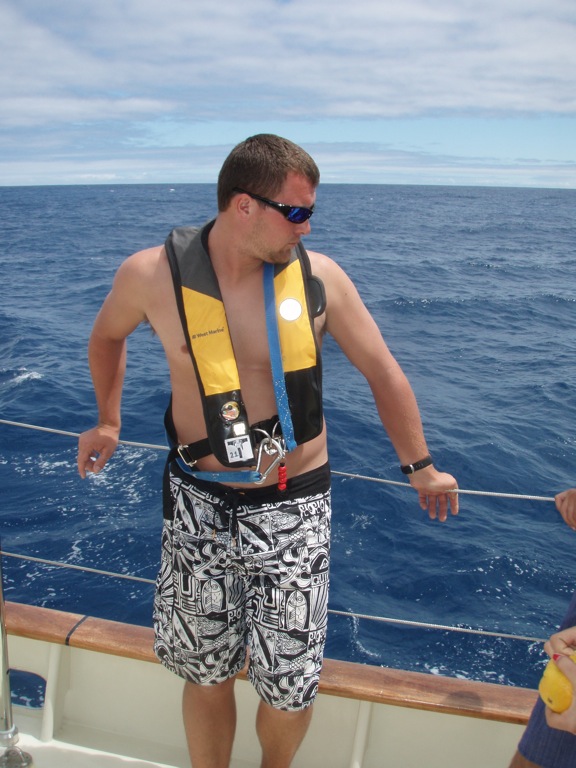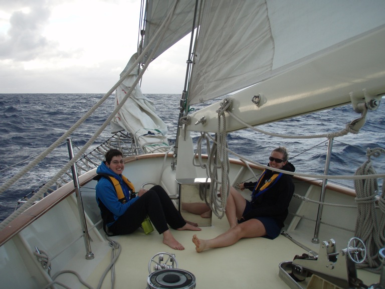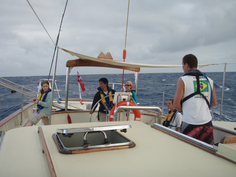 Over the past few days, and after crossing the Prime Meridian, we have all been introduced to the tropics and their unpredictable weather. When being woken up to watch and inquiring groggily about what to wear, it’s almost impossible to get a straight answer. We got a few short bouts of rain early this morning, and more are likely tonight, which just makes things more exciting. This morning, around 11:00, the wind picked up, pushing Argo along at 9 knots. With the sails fully up, all hands were called on deck to reef the mainsail and sheet out the forward staysail and the main staysail, which was an exciting kick-off of our first daily meeting for lunch (which included freshly baked bread and was delicious, in case you were wondering)this morning also included the biggest school of flying fish we’ve seen yet, probably about 50 of them coasting along the top of the water. We should be seeing some real birds soon, as we are fast approaching St. Helena and are only about 300 miles away. This afternoon, the Marine Biology students learned about different aquatic plants and bacteria, followed by a PADI scuba class for those of us doing open water diving. At 15:00, we had our deck showers, and the complaints diminished daily as the water got warmer and warmer. Plenty of loud music and studying went on in the salon until dinner time. Compliments to the chefs were plenty tonight, and there were no leftovers from the delicious Louisiana-style gumbo Chris and Cayley whipped up. The sun is setting soon, and we’re all on the lookout for the green flash less than 80 days left to catch it! A quick hello to all my friends and family back home – miss and love you guys! And a very happy early birthday to my twin; I’ll be thinking of you!