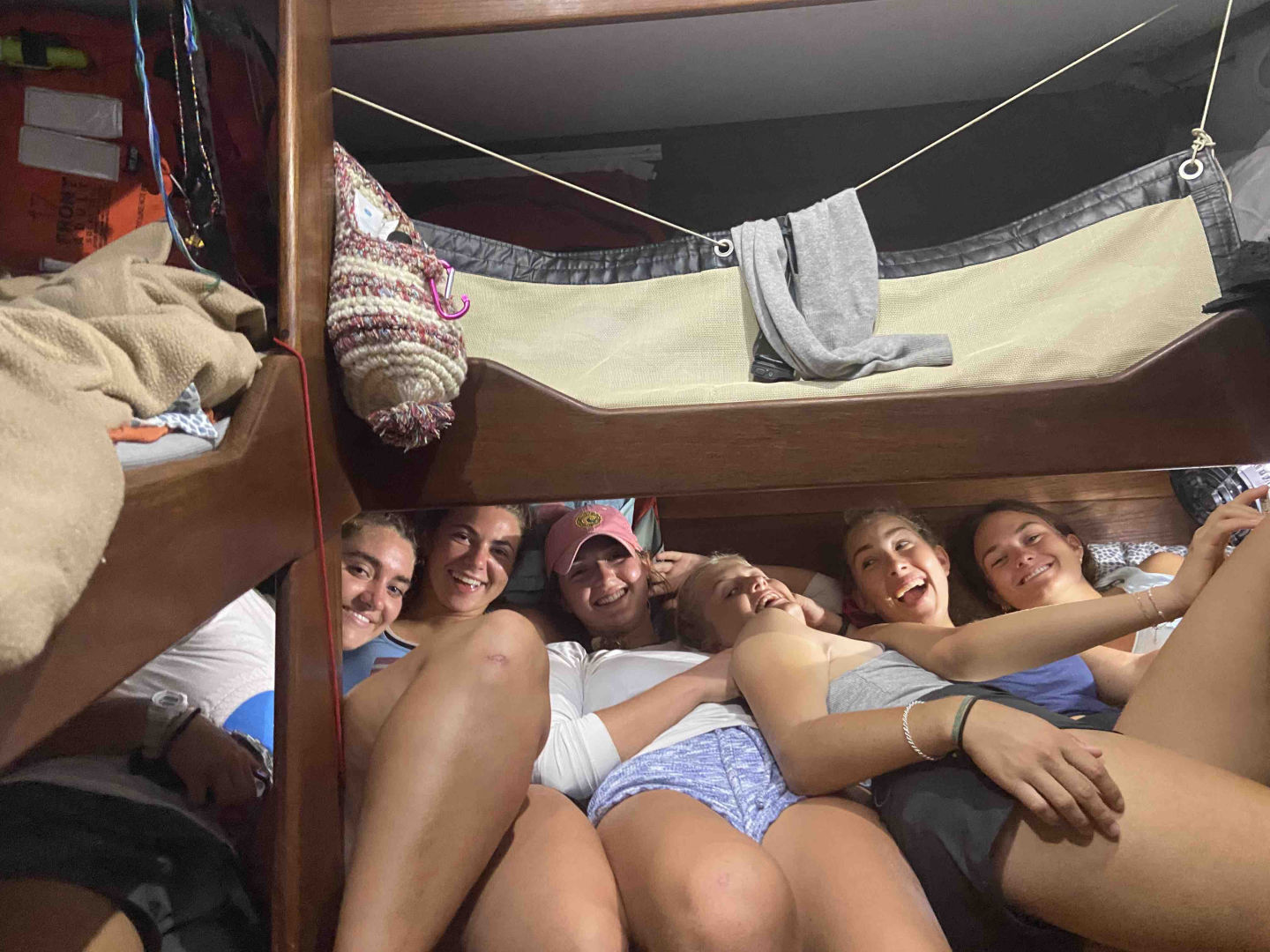 After watch, we were blessed with Max’s delicious deli sandwiches. He only spent an hour and a half cutting up onions… not too bad! I personally was afraid of the wet deli meat, so I went with a carrot, lettuce, and onion sandwich. It was shockingly good! In the quick intermission between lunch and class, Alison, Wilks, Mia, Amelia, Anna, and I found out you can fit six people into one very little Vela bottom bunk. We watched an amazing episode of Family Guy before playing our marine bio review game. My team they were the waxing themselves with duck tape team, instead of the paying attention team, and got a solid 4 points while the other team, the team already studied, came out with over 20. Next, we watched the movie Maiden, a documentary about the first all-female team to race around the world. I highly recommend the movie to anyone who is interested enough in sailing or people living on a boat right now to make it this far in the blog. It is a really good movie. Max once again served up a delicious meal for dinner. We devoured his spaghetti with red sauce and ground turkey. Tragically for those of us that still like the bland flavors found on the kid’s menu, Max made the turkey spicy!!