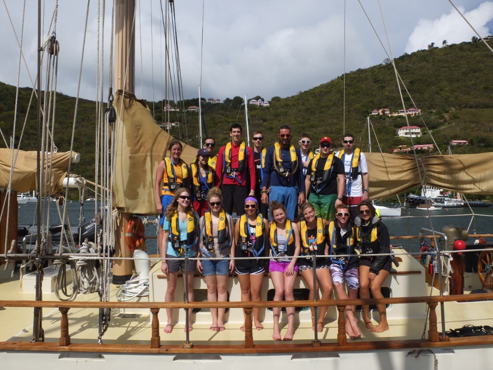 The past few days have been packed with heaps of activity and preparation. We’ve been stocking the cabinets with literally tons of food. The equipment has been cleaned and checked. The boat has a splash of fresh paint and varnish to sharpen her up. The staff has been busy planning a curriculum and schedule full of new challenges and old favorites. All that we have been missing are the 11-student crew! Until now. A long day of travel for our new shipmates ended as they were all signed onto the boat as crew members. Bags were unpacked, new friendships started, and a sunset swim in the clear blue waters of Soper’s Hole was a great start to spring 14.