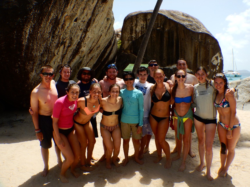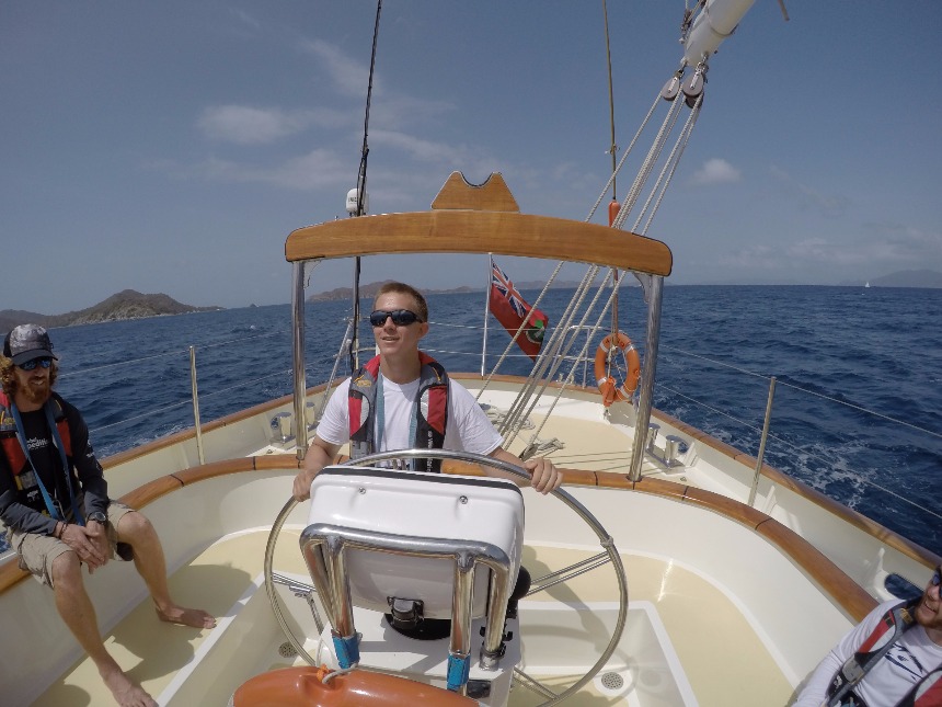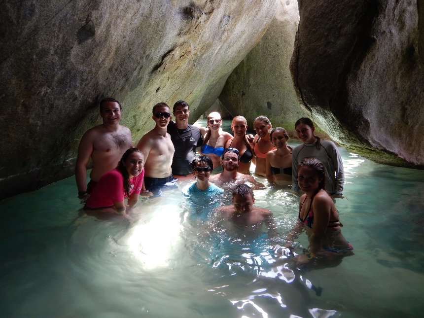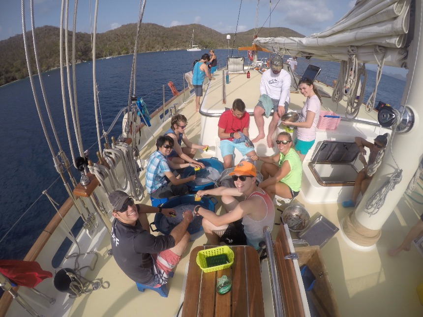We woke up to a breakfast of French toast and the task of finishing some leftover prep for the sail that day. We worked on the passage prep to make sure everything was ready for our sail to the island of Virgin Gorda. This was our first sail without the engine running, and we got to put up all but two out of our six sails. We sailed at about 8 knots and anchored near The Baths. One of our final shipmates, Anastacia, arrived on board just before lunch. After lunch, we lowered the dinghies and went over to The Baths. This used to be a stop for slave trading ships to bathe the slaves. At the time, the slaves wore blue beads on a necklace and would be awarded beads for good behavior. When we got there, we went exploring through the caves created by many massive boulders on the shore. Lindsey found one of the beads that were worn by the slaves on the path that led through the caves to Devil’s Bay. We left The Baths around 15:00. When we arrived back on Argo, we pulled up the anchor to motor over to Savannah Bay, where we would anchor for the night. Once anchored, we put the sail covers back on and took our salty showers. While dinner was being prepped, our final shipmate, Gabe, arrived, and we had our first meal with the complete group. After dinner, we went over how our first anchor watch would work before we went on to our Seamanship class, before the start of anchor watch.