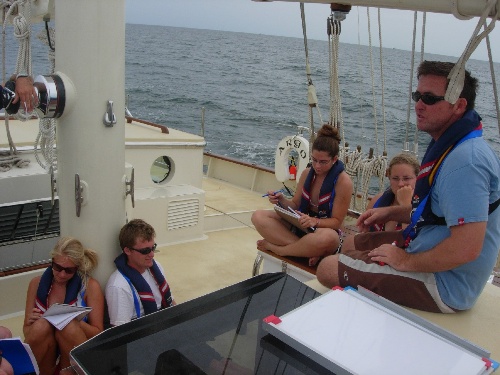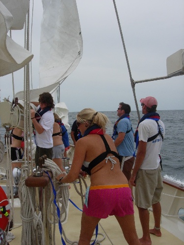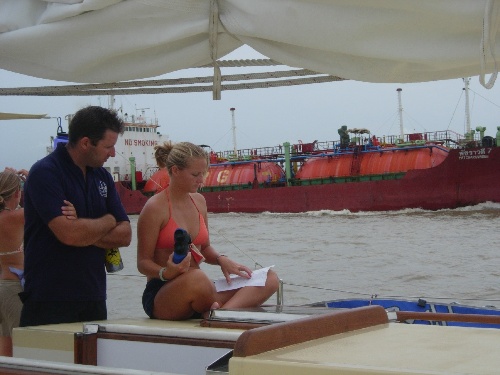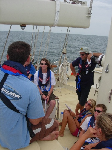 Today was a fantastic day! We hauled our anchor out of the river once and for all! We set sail on the Gulf of Thailand, and away we went due south to Malaysia! The day was a pretty relaxing one; the breeze was fresh, the water clear and as blue as the sky, and smiling faces all around to finally see what this trip was all aboutsailing away! After a couple of classes on deck in the afternoon, we started our watch system. Every 3 hours, a team of sailors rotates through the steering, bow watch, and engine checks. Everyone also experienced their first bucket showers and thoroughly enjoyed it! So, with some wind right off our starboard bow filling our sails, a line off the stern, catching some tales, we sail, we smile, we experience a great day for all, and many more to come!