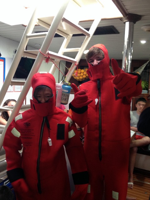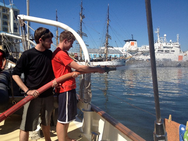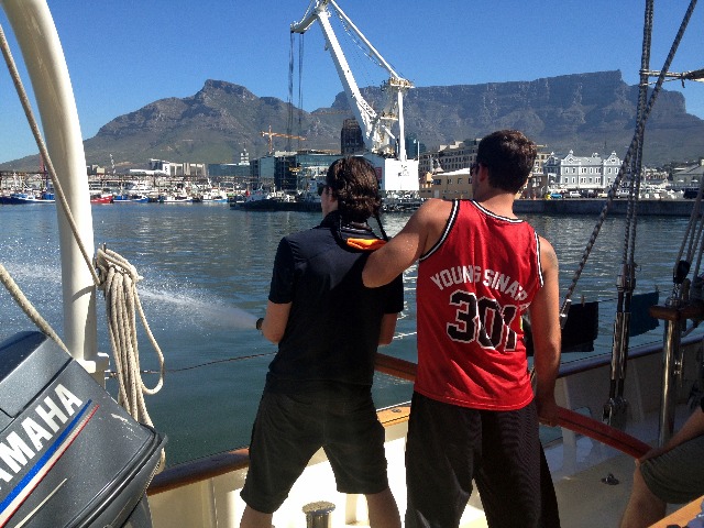 Today started off with a super early wake-up for the Argo crew at 5:40 AM. Everyone mustered on deck at 6:00 for a taxi ride to the base of Lion’s Head, one of Cape Town’s three iconic peaks. It was a perfect morning for a picturesque hike. Everyone had a blast walking together and enjoyed the stunning view from the top. Aika even conquered her fear of heights to the summit with the whole group. Upon returning to the boat, there was no time to rest! We had a full day of boat introductions planned in order to prepare for tomorrow. Kris began with a general safety talk and held an entertaining race to don survival suits, which Eli won. Afterward, we talked about passage life and introduced the crew to the concept of watch, and broke into our three watch teams. In our groups, we practiced handling lines, learned about hourly boat safety checks, and conducted an introduction to chart plotting. The day was not finished yet, and we spent the remainder of the afternoon preparing Argo for tomorrow’s day of sail training and boat familiarization. We finally got to do a bit of relaxing over a delicious meal of chicken wings and mashed potatoes prepared by today’s head chef, Sam. We’re now wrapping up our post-meal cleanup, and then it’s right into Marine Biology. I think I can speak for all when I say that I am filled with anticipation for taking Argo off the dock in the morning, but I will not have any trouble falling asleep tonight!