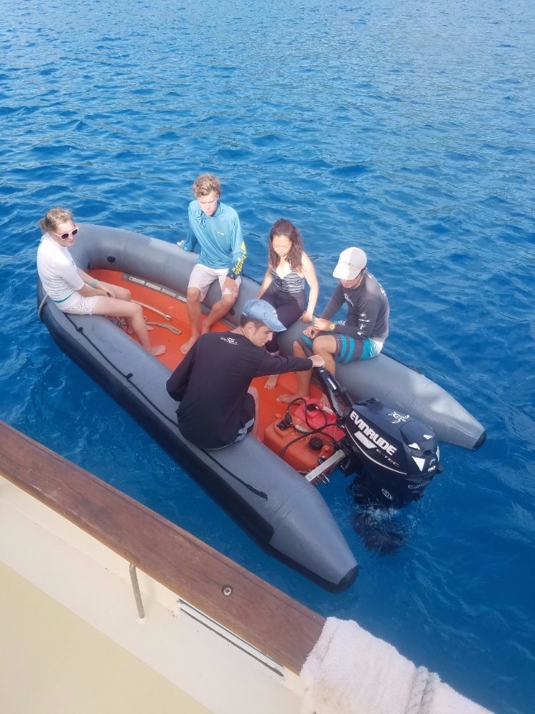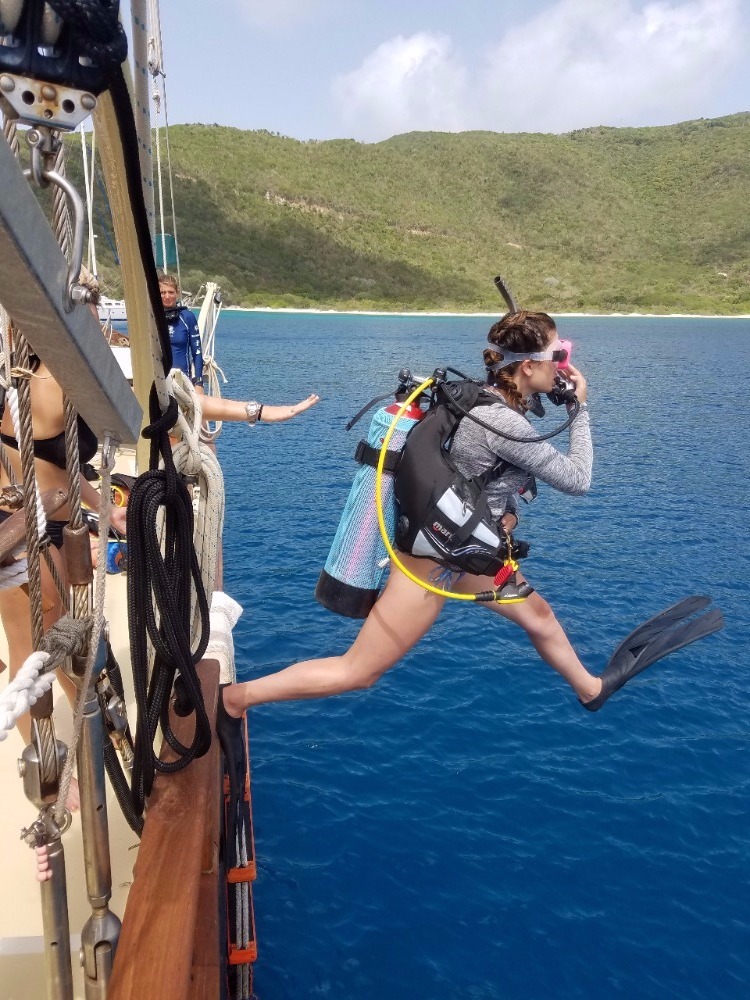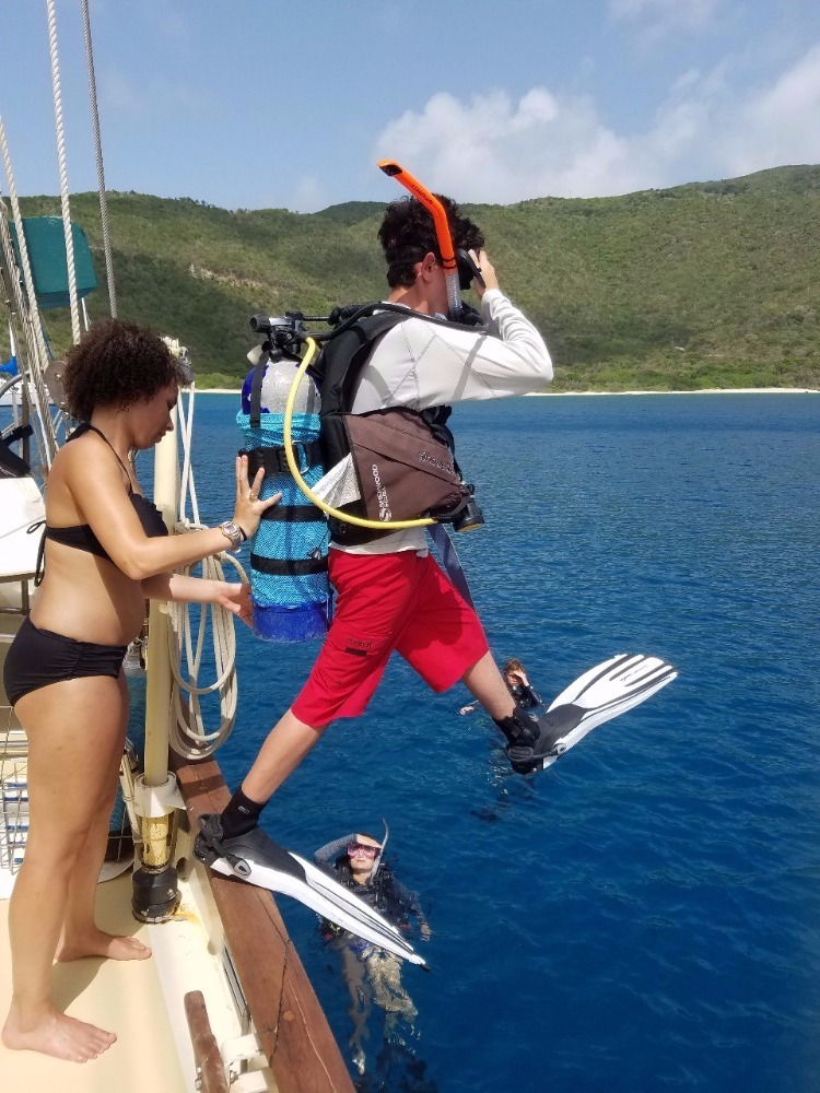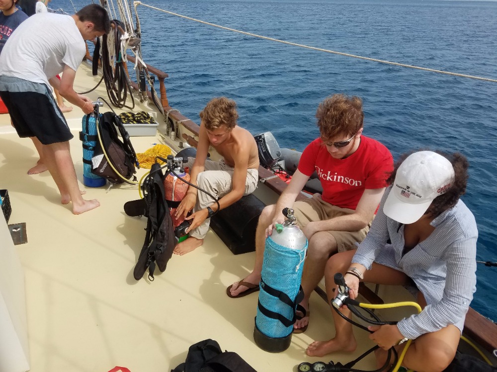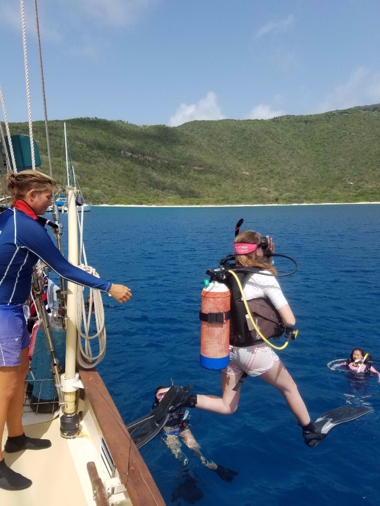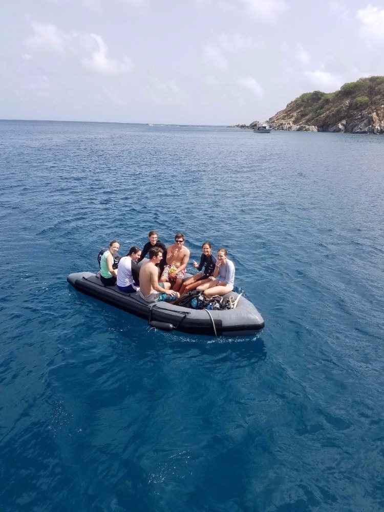 Today, we had a 7:00 am wake-up call and a 7:30 am cereal breakfast on our second day in Mountain Point. The Open Water Divers in training learned how to read dive charts while the certified scuba divers went on an early morning recreational dive. The Divemasters in training assisted in teaching the open water students and were tested on their own skills. Afterward, the certified divers had some relaxation and extra study time while the Open Water students completed their last skills and training dive before being eligible to take the final exam and become PADI certified Open Water Divers. Following the early morning dives, we had a mac n’ cheese lunch and proceeded to attempt backflips off the deck, lounge in the sun, swim around the boat, and color in postcards. The third and last dive of the day was an incredible opportunity for some shipmates to go down to 60ft and experience the joys of the world beneath the Caribbean sea. There were a ray and two lobster sightings, as well as a few barracudas. After our first Oceanography class, the boat has decided on groups for the final projects that we will be completing for the remainder of the trip. Overall, today was a great day to dive, relax, spend time together, and enjoy our beautiful home on Ocean Star. While it has only been a few days, the boat is already beginning to feel tightly knit and homie, especially after our long-lost brother William made it aboard. Ending another wonderful day on the water, we ate a Mexican night-themed dinner. We enjoyed each other’s company and some animated discussions and charades about our spirit animals. Tonight, we’ll be watching a video about the names of our two dinghies, Irving and Exy Johnson, and we will be learning about the history behind sail training before getting into a little more sail training of our own tomorrow. As “Careless Whisper” is blasting on the deck of Ocean Star and the waves roll past a serene Caribbean sunset, I cannot think of a place I’d rather be with any other group of people. Unsurprisingly, the lack of connection to the outside world and an 88-foot ship in the Caribbean is the perfect breeding ground for great experiences, friendships, and memories.