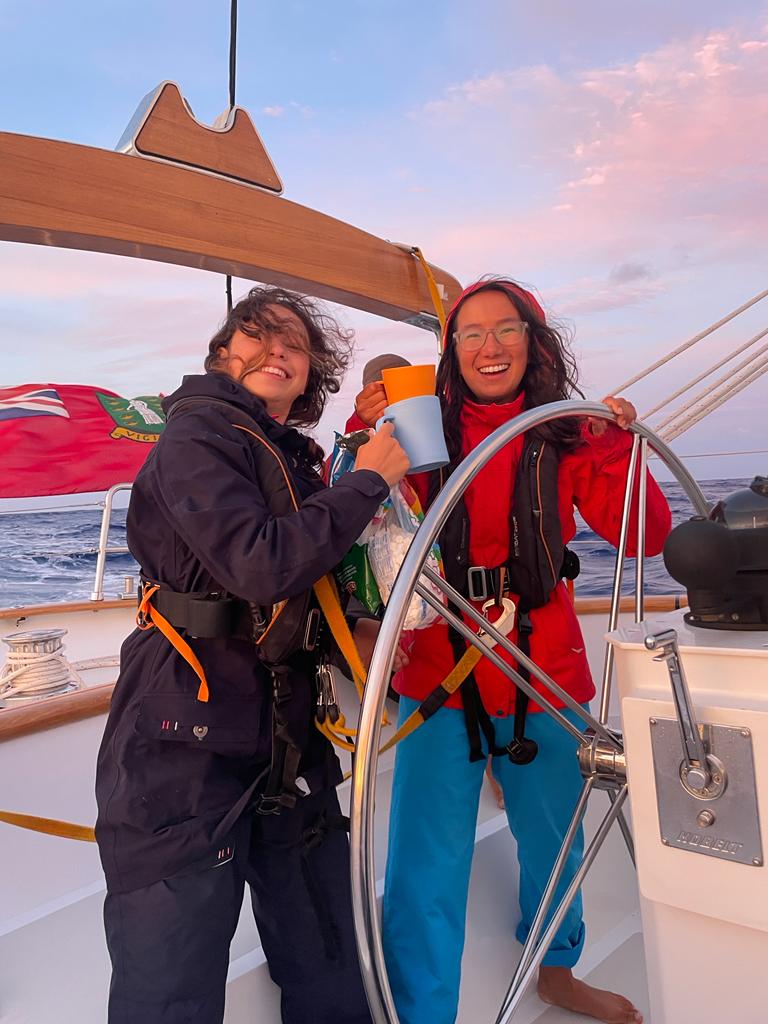 Day 69, aka 3rd day of passage to Bermudsss (ooo were halfway there! O O going to Bermuda). My day started at 3:30, being woken up for the sunrise watch with the famous pickles. The pickle curse is apparently finally gone, and we are no longer having sickle pickles on watch. Instead, were thriving during boat checks and having a great time. This morning we talked a bunch about movies and books, had hot chocolate with marshmallows, sang perfectly accurate versions of songs like Bohemian Rhapsody, including all the instrumental parts (shout out to Anna, my musical goddess), and had the visit of two dead flying fish in deck. The first flying fish, Gerald, was accidentally thrown in the sheet line by me on the way to the ocean (sorry to disturb you in death). The second flying fish, Gerald jr., was a BABY, so cute, and when I threw it in the ocean, it surprisingly kicked on the water like a rock. Fun fact, marshmallows also kick in the water.