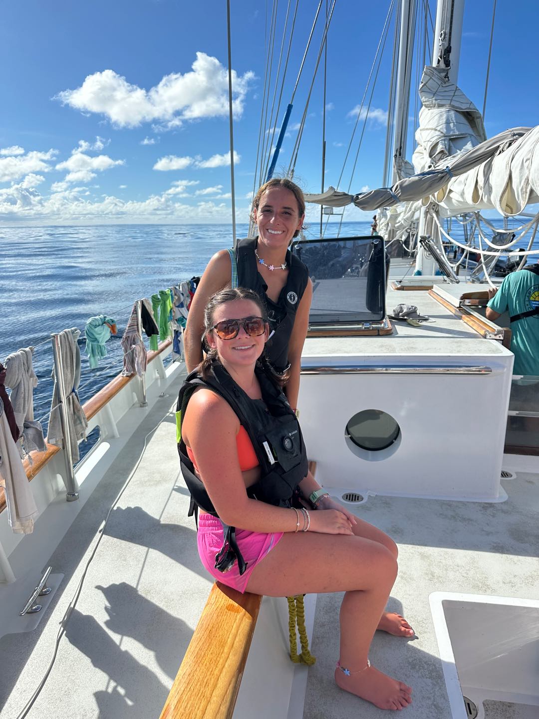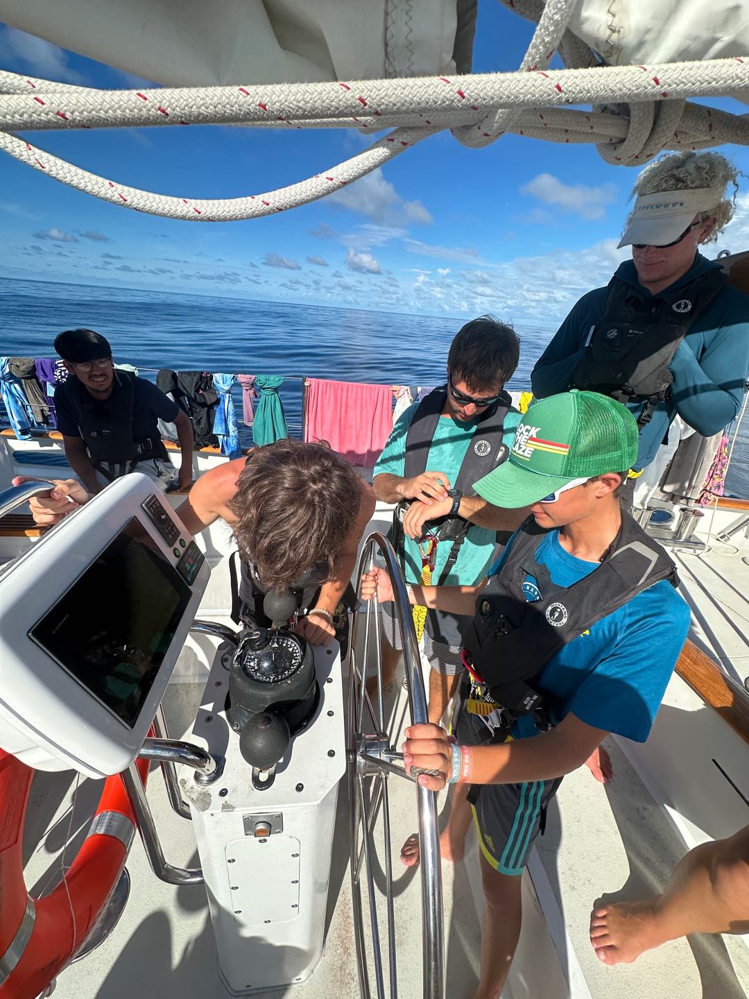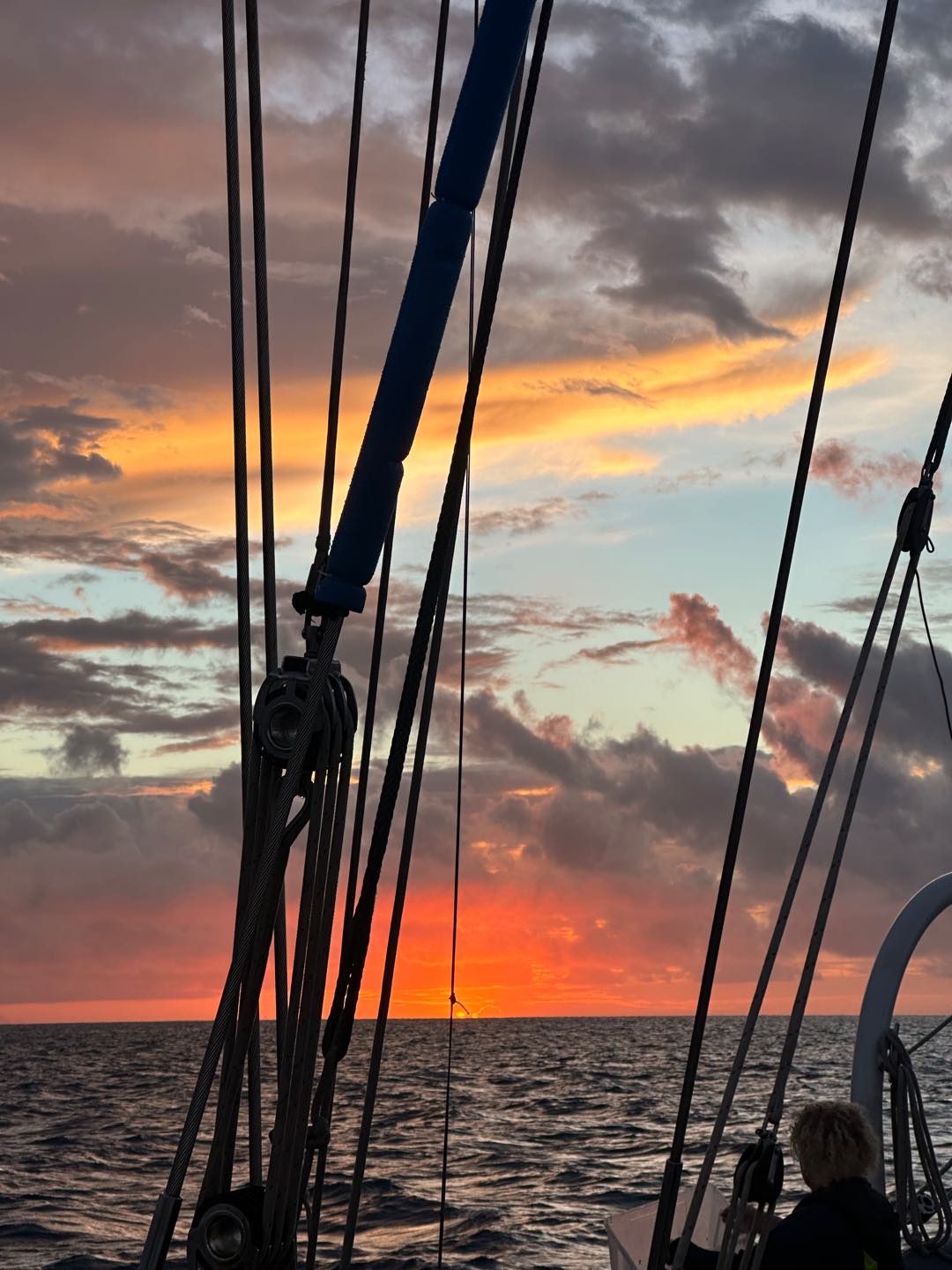 On the scale of good days underway, it was hard to follow yesterdays equator crossing and swim call, but today was a pretty great one nonetheless. It started with a gorgeous 6 am sunrise before Watch Team 1 saw 2 FADs (fish aggregation devices). These are pretty large (5x5ft-ish) floating objects set out by fishermen to attract and then catch a whole load of fish without even having to be there. Then, when the sensor tells them their net is full, the fishermen come to scoop all the fish out of the water. There are a ton of pretty crazy commercial fishing operations like that out here in the Western Pacific. We saw a total of 3 throughout the day, each surrounded by large bait balls that we could see splashing around on the surface. We also had two separate whale sightings today, both of which we think were sperm whales just calmly swimming along the surface – maybe even sleeping! Mac launched the drone, and we got some awesome shots of them from right above. With just a couple of days left of passage, emotions are mixed as everyone is excited to see land and have some cold drinks again, but the days are counting down until we have to say goodbye to our 40 dayers 🙁 Other highlights today included a full rainbow, unbelievably glassy water, turning the boat in a full 360-degree circle (twice) so Ceci could get compass readings to make us a new deviation table, the sunny pour we had going for dinner, and Claires delicious cookies.
