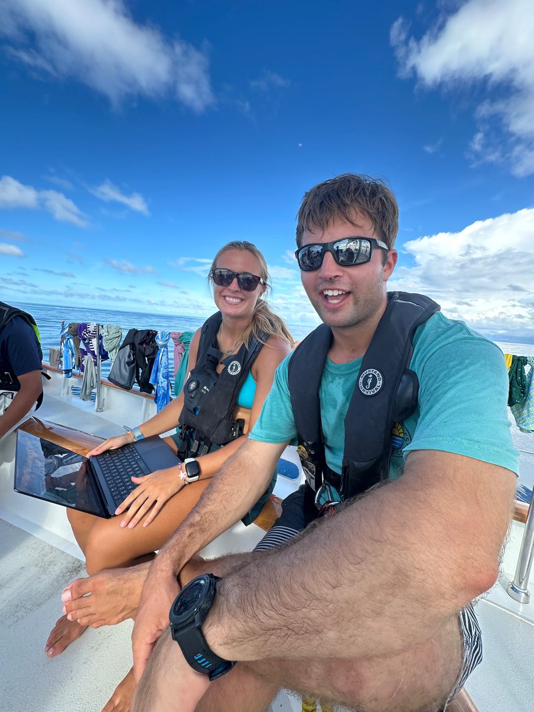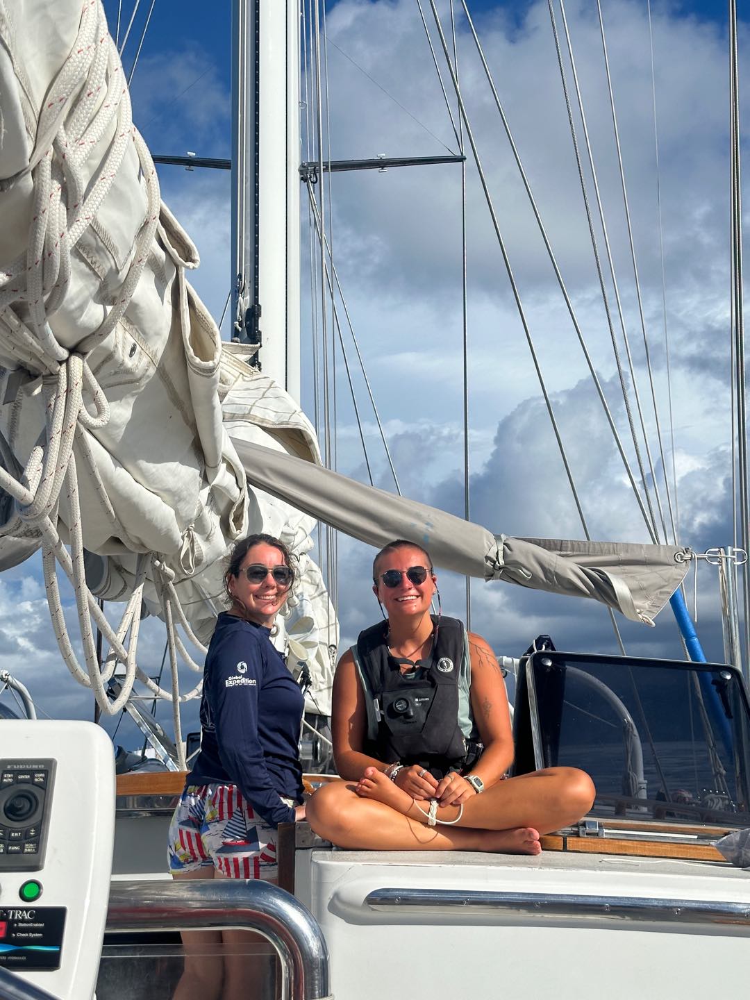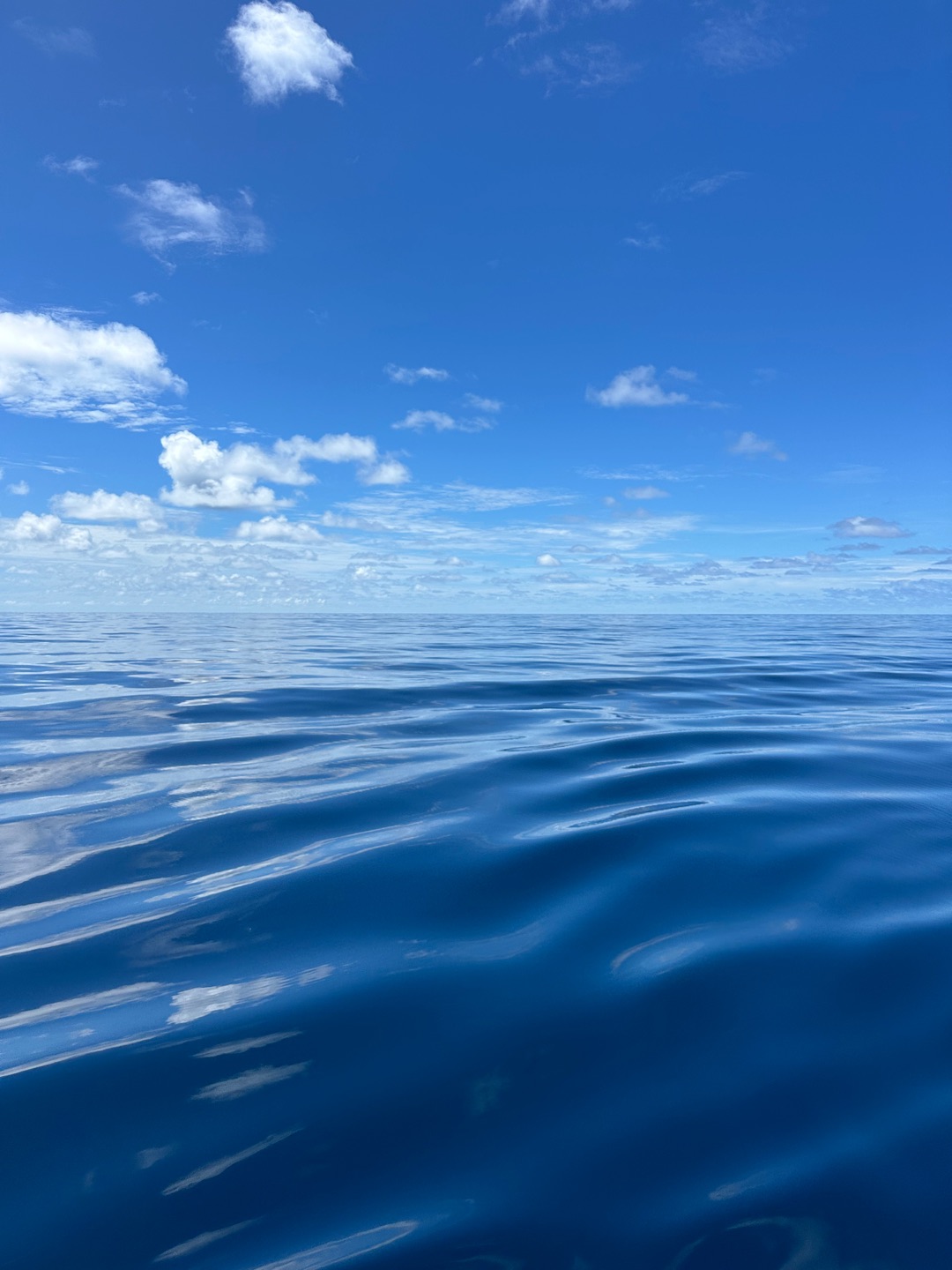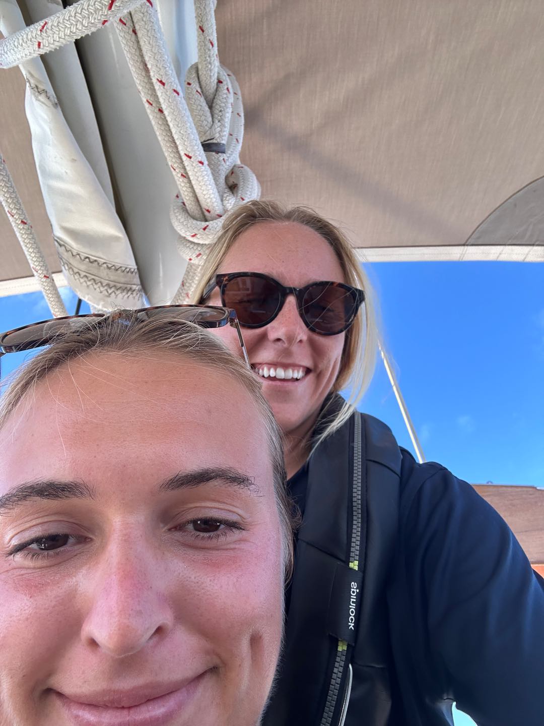 On the scale of good days underway, it was hard to follow yesterdays equator crossing and swim call, but today was a pretty great one nonetheless. It started with a gorgeous 6 am sunrise before Watch Team 1 saw 2 FADs (fish aggregation devices). These are pretty large (5x5ft-ish) floating objects set out by fishermen to attract and then catch a whole load of fish without even having to be there. Then, when the sensor tells them their net is full, the fishermen come to scoop all the fish out of the water. There are a ton of pretty crazy commercial fishing operations like that out here in the Western Pacific. We saw a total of 3 throughout the day, each surrounded by large bait balls that we could see splashing around on the surface. We also had two separate whale sightings today, both of which we think were sperm whales just calmly swimming along the surface – maybe even sleeping! Mac launched the drone, and we got some awesome shots of them from right above. With just a couple of days left of passage, emotions are mixed as everyone is excited to see land and have some cold drinks again, but the days are counting down until we have to say goodbye to our 40 dayers 🙁 Other highlights today included a full rainbow, unbelievably glassy water, turning the boat in a full 360-degree circle (twice) so Ceci could get compass readings to make us a new deviation table, the sunny pour we had going for dinner, and Claires delicious cookies.