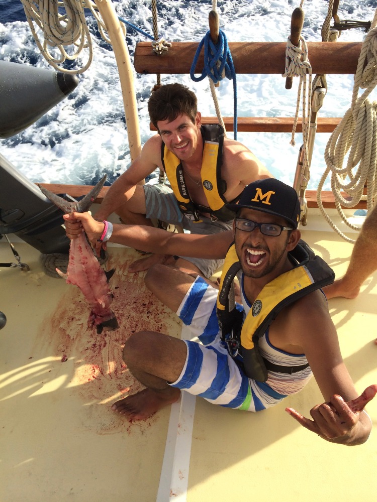 Today was full of sailing! At 7:00 AM, we successfully set sail from Nevis to our destination in Antigua. A tropical depression had altered our plans a little (don’t worry, friends and family; we are safely docked in English Harbor). Still, I think most were looking forward to a little land time to explore the forts built around Antigua by the English to protect themselves from the British centuries ago. Throughout the day, the crew took turns manning the helm, each person getting a real feel for just how to control this 88ft schooner we call our home. Although nerve-racking at first, steering the boat would have to be one of the most exciting tasks to do while sailing across the Caribbean all day! Others found pleasure hiding away in the bunks, reading various books, or partaking in a little fishing off the stern of the boat. The fishermen were actually quite successful, catching a Mahi Mahi, Little Tunny, and a Spanish Mackerel. Pictured here, Sahil fillets his first fish.